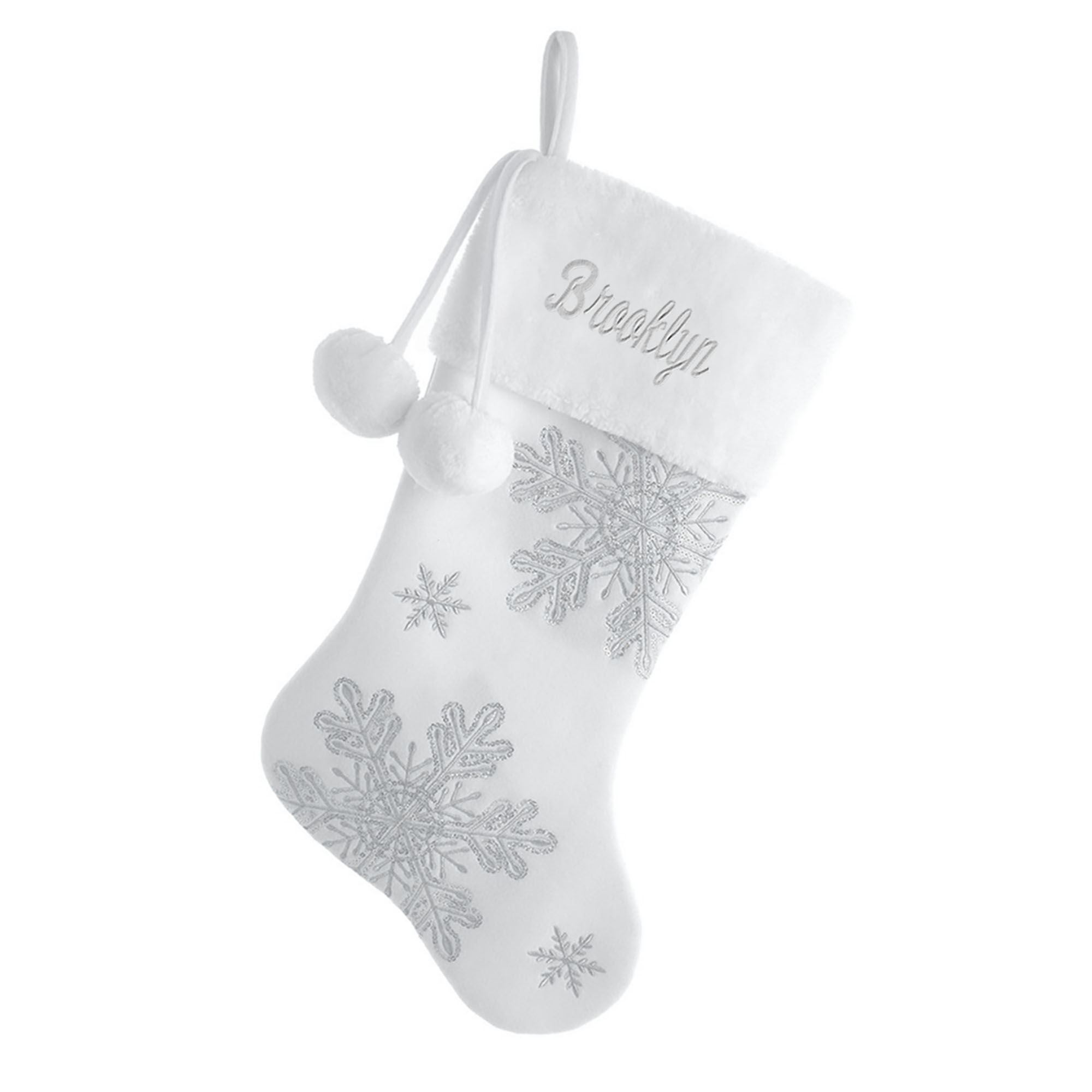 The Shimmer Snowflake Stocking embraces winter beauty. By Kurt S. Adler, the white polyester stocking features magnificent metallic silver embroidered and sequined snowflakes, a white faux fur cuff, and dangling white puffy pom-poms. Personalization is available, as shown, for FREE! Specify name up to 11 characters. Click on the burgundy "i" icon below the item name for more information. Overall, the white Christmas stocking measures 7.5"Wx19"L. Spot clean. Imported.
