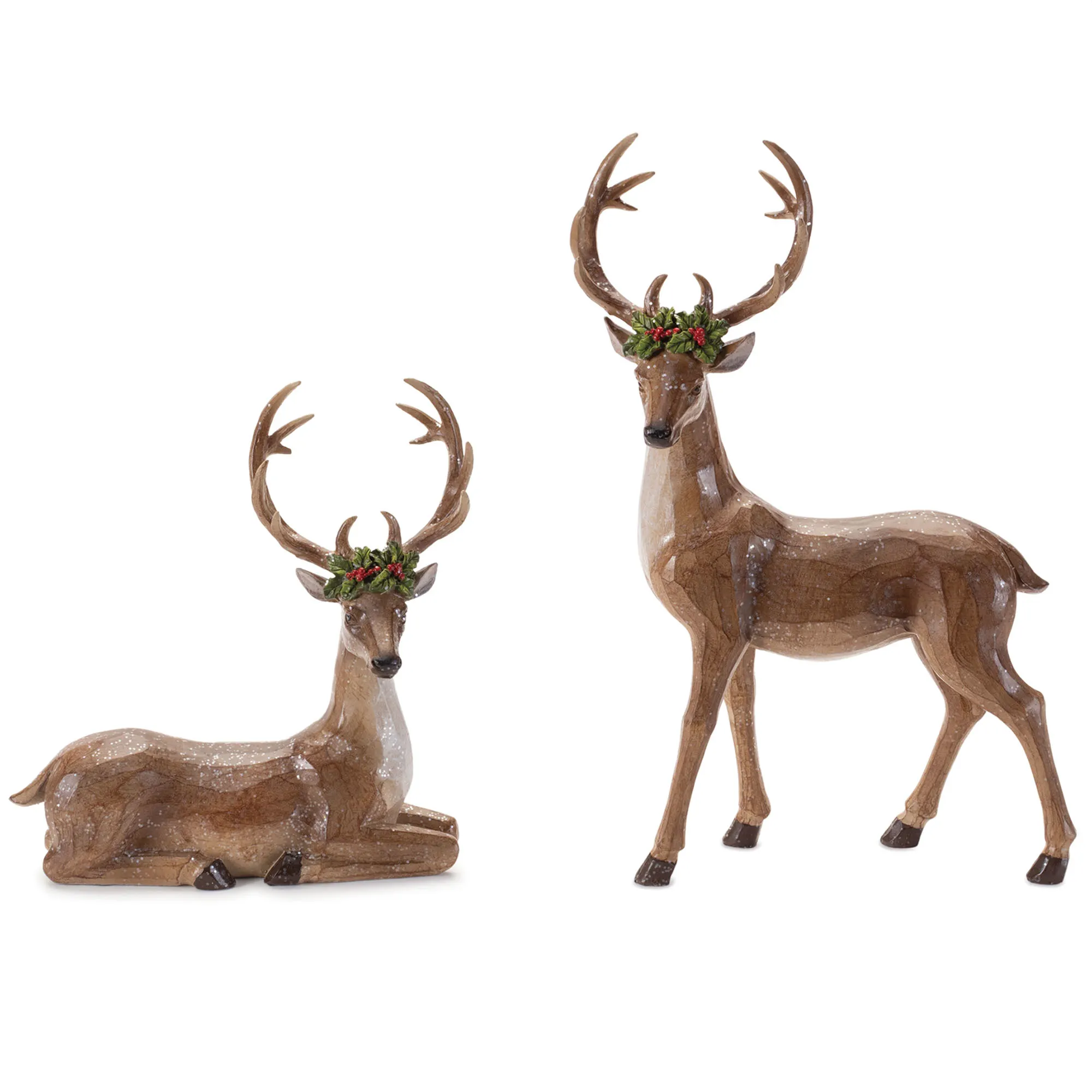 Display the Shimmering Deer Figure Set for added sparkle in any rustic holiday display. Made of resin, these brown deer have long antlers, a faux carved wood design, all-over glitter accents, and headpieces with green holly leaves and red berries. Standing deer is 8"Wx3.5"Dx13"H; lying deer is 8"Wx3.5"Dx9"H.