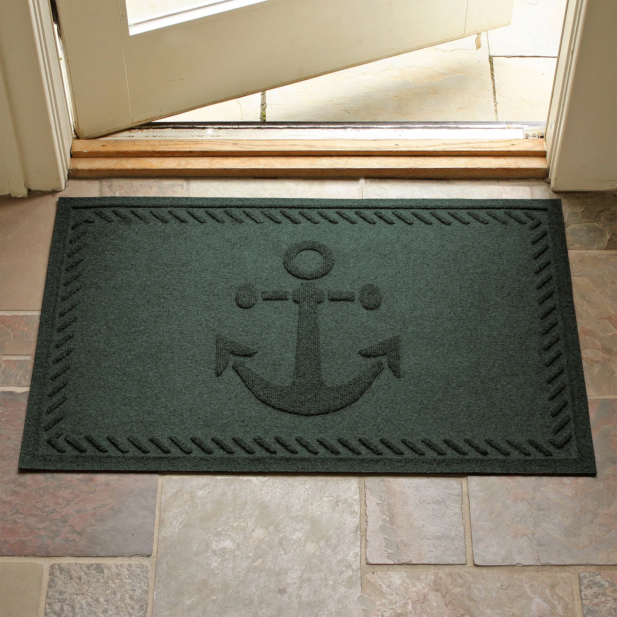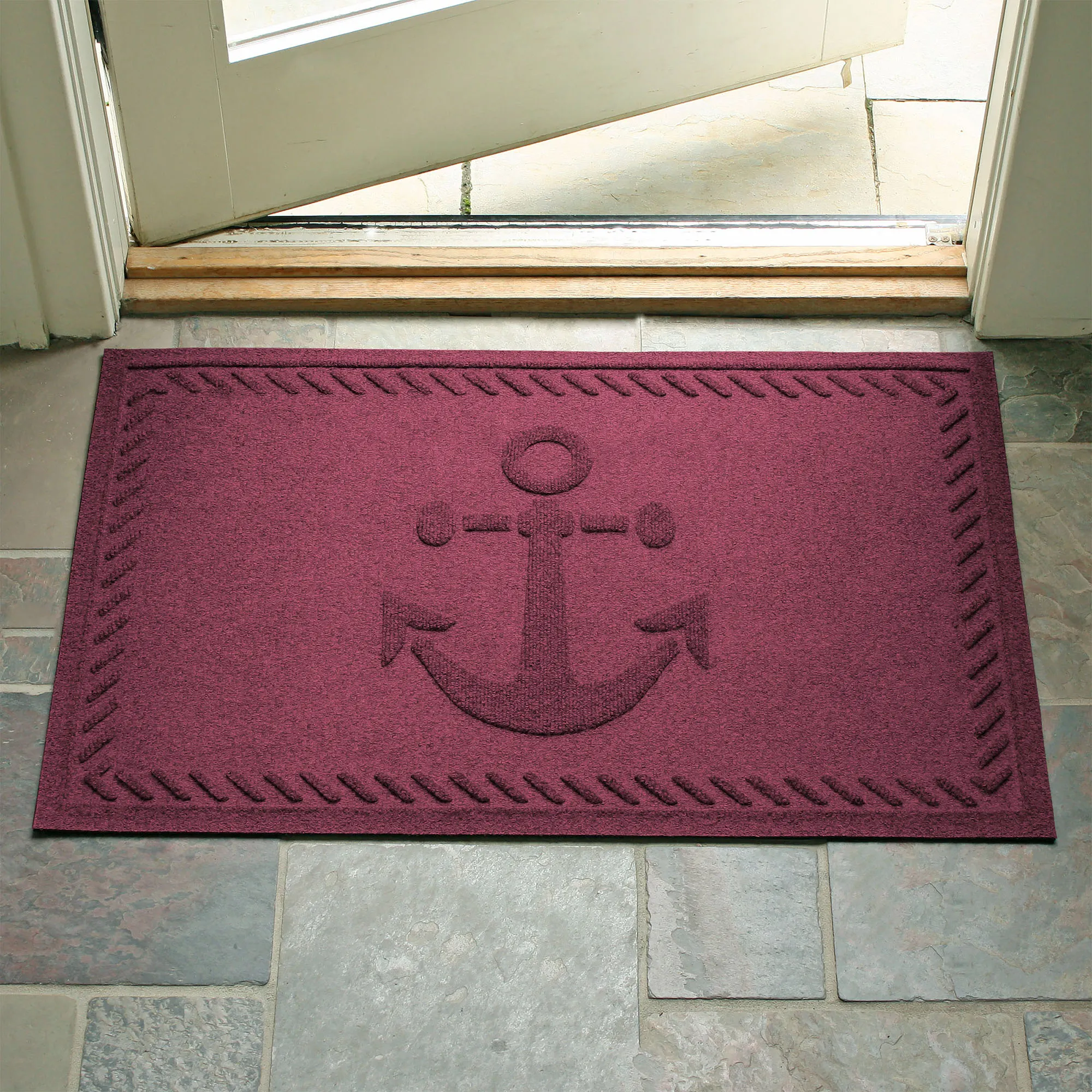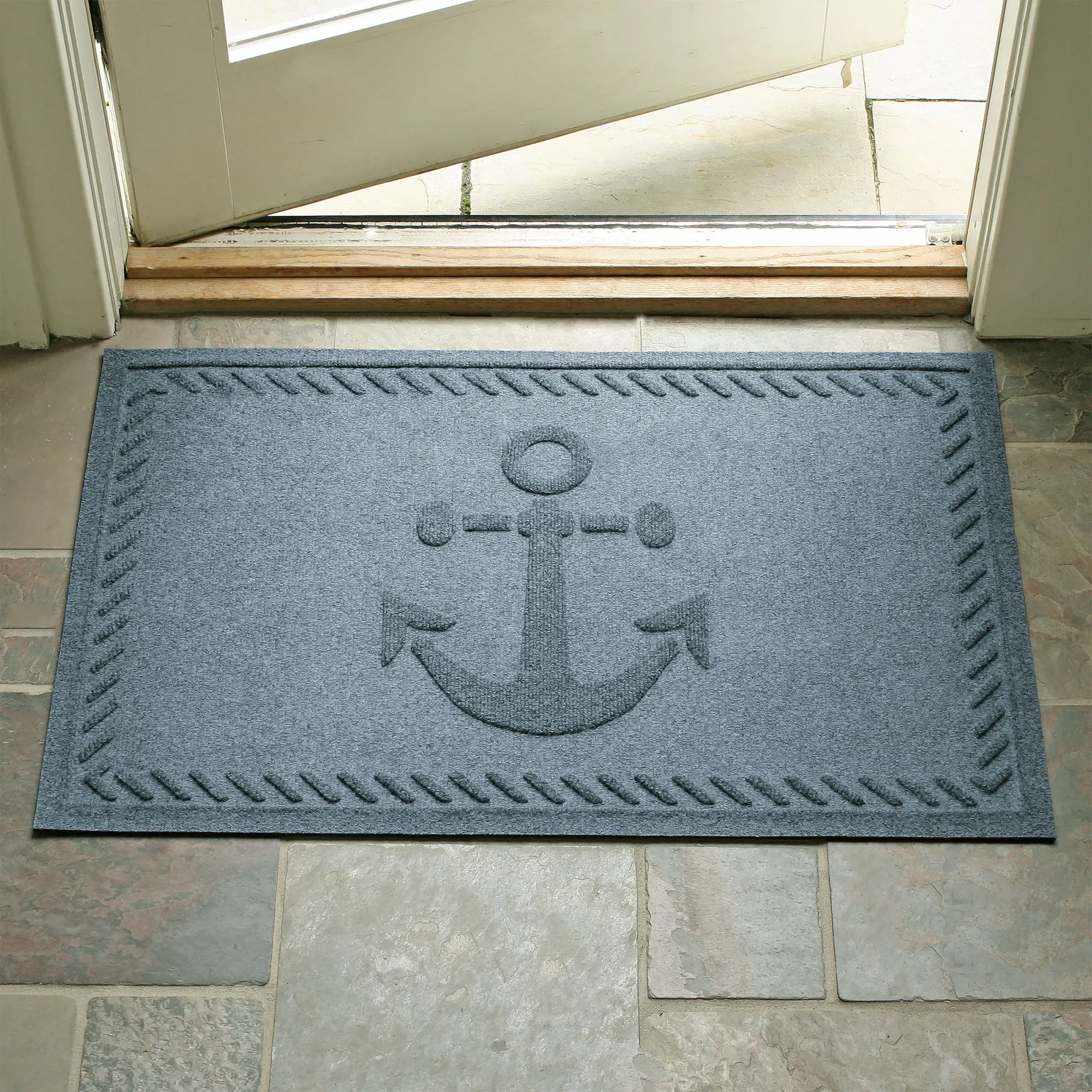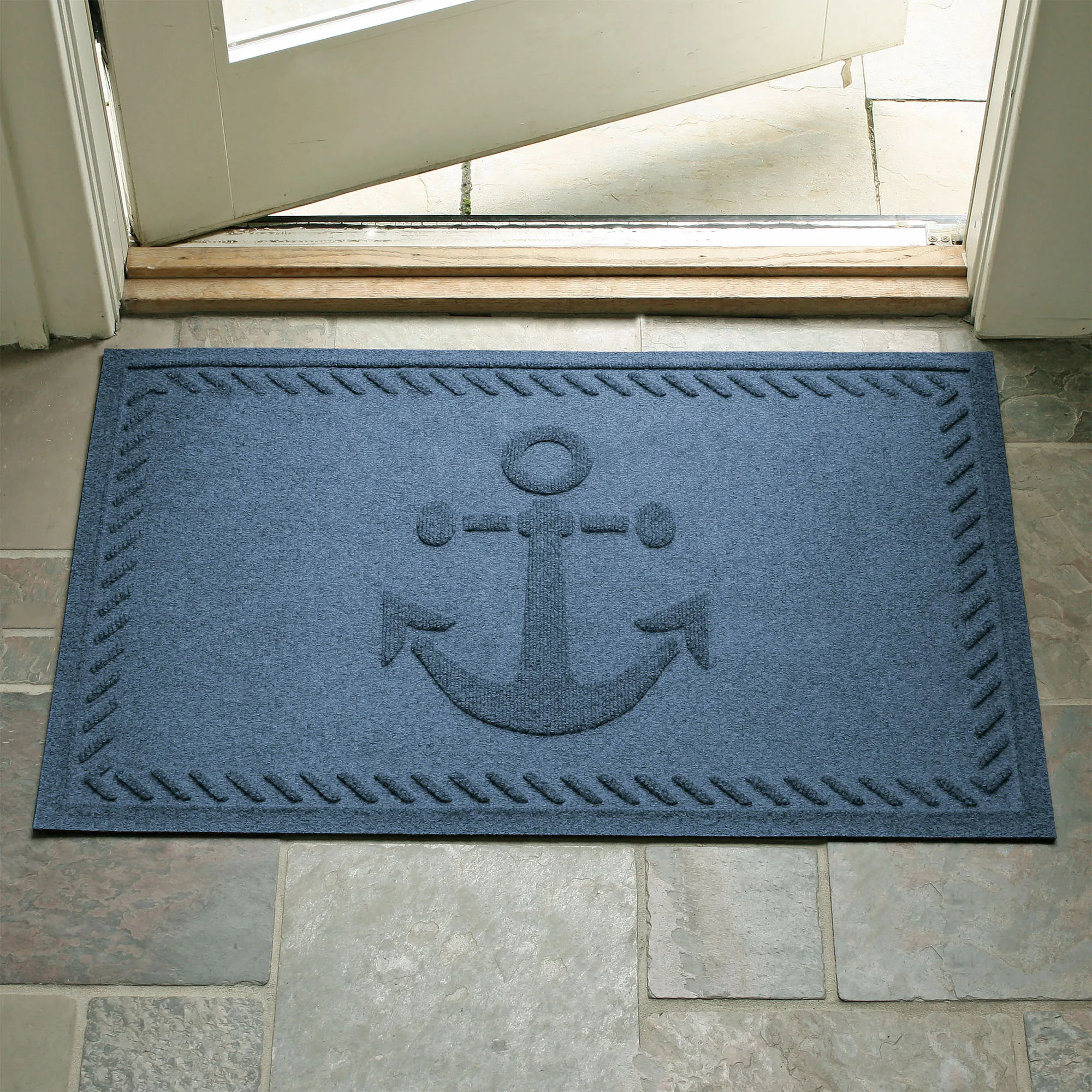 Drop your Ship's Anchor and begin to relax as soon as you catch a glimpse of this charming indoor/outdoor doormat. Proudly made in the USA, the molded design features a twisting nautical rope border and center classic anchor. The antistatic PET polyester floor mat has a skid-resistant SBR rubber backing that is slip-resistant and certified by the National Floor Safety Institute. The WaterHog(R) exclusive Water Dam border keeps dirt and water on the mat and not your floor. Design is mildew-, mold-, and rot-resistant to withstand indoor or outdoor year-round use. Specify Navy, Burgundy, Charcoal, Dark Brown, Dark Green, Gray, Khaki, or Slate Blue. Doormat measures 35"x23". Shake to remove dirt; hose off to clean.
