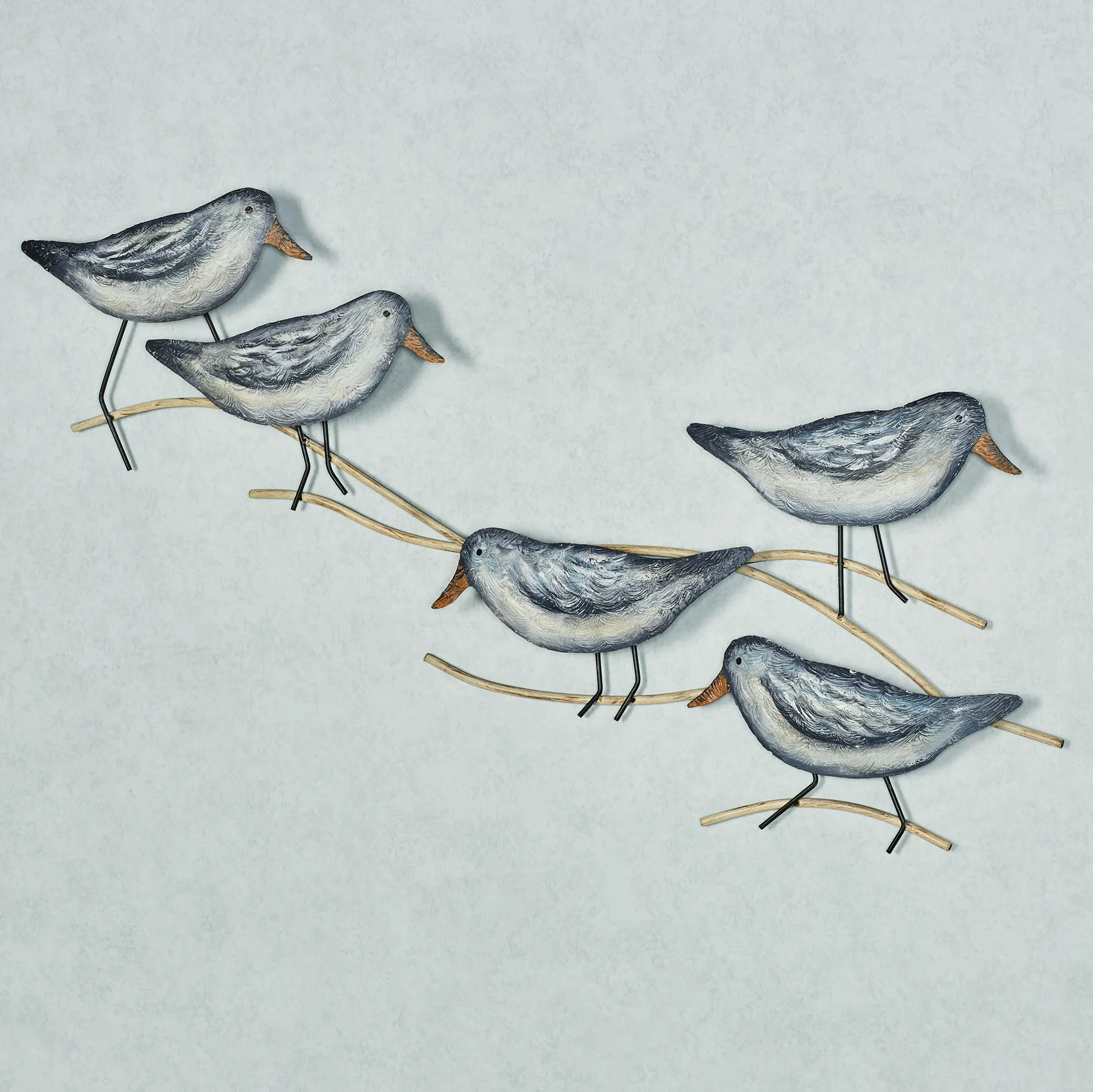 Everyone loves watching these sweet Shorebirds meander all over the beach. Made of metal, this handpainted coastal wall art features dark blue and white birds among the curved sand. Indoor or covered outdoor use. Measures 32.5"Wx2"Dx13.5"H.