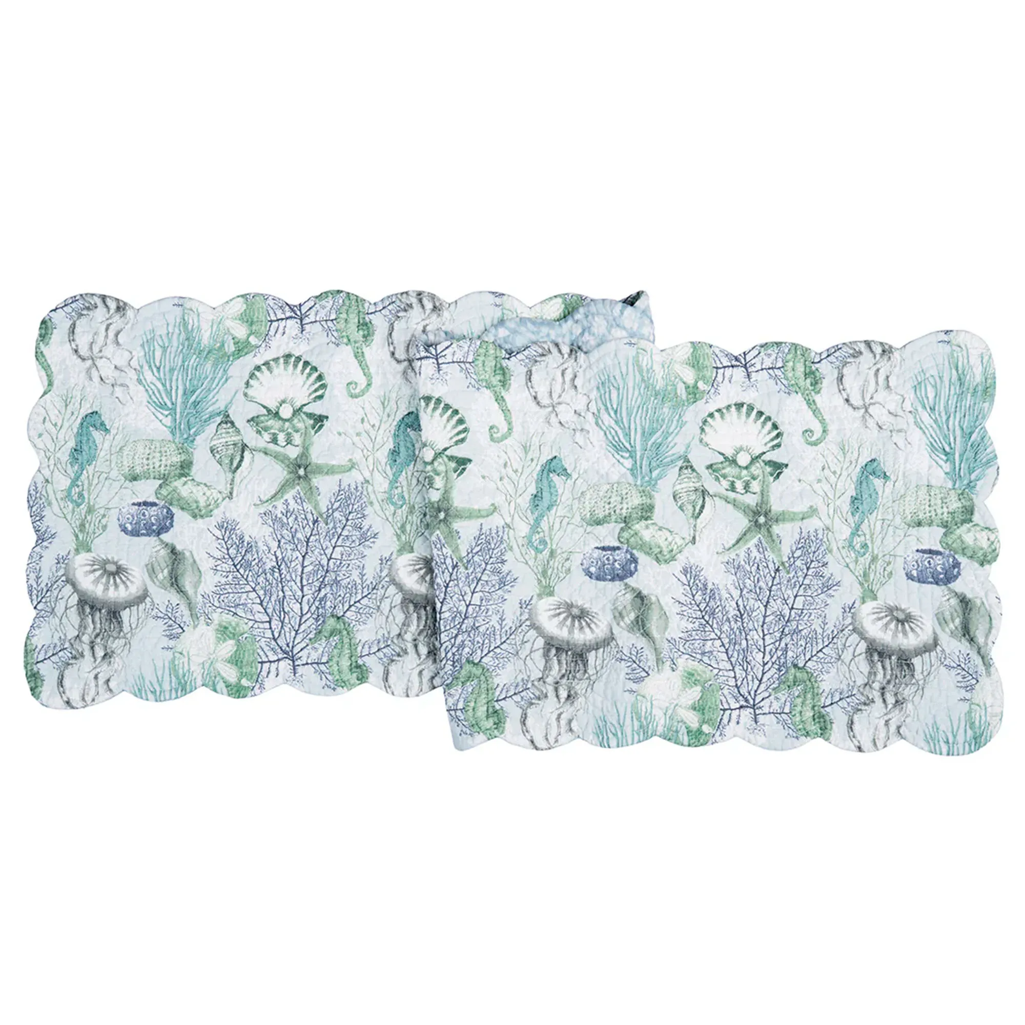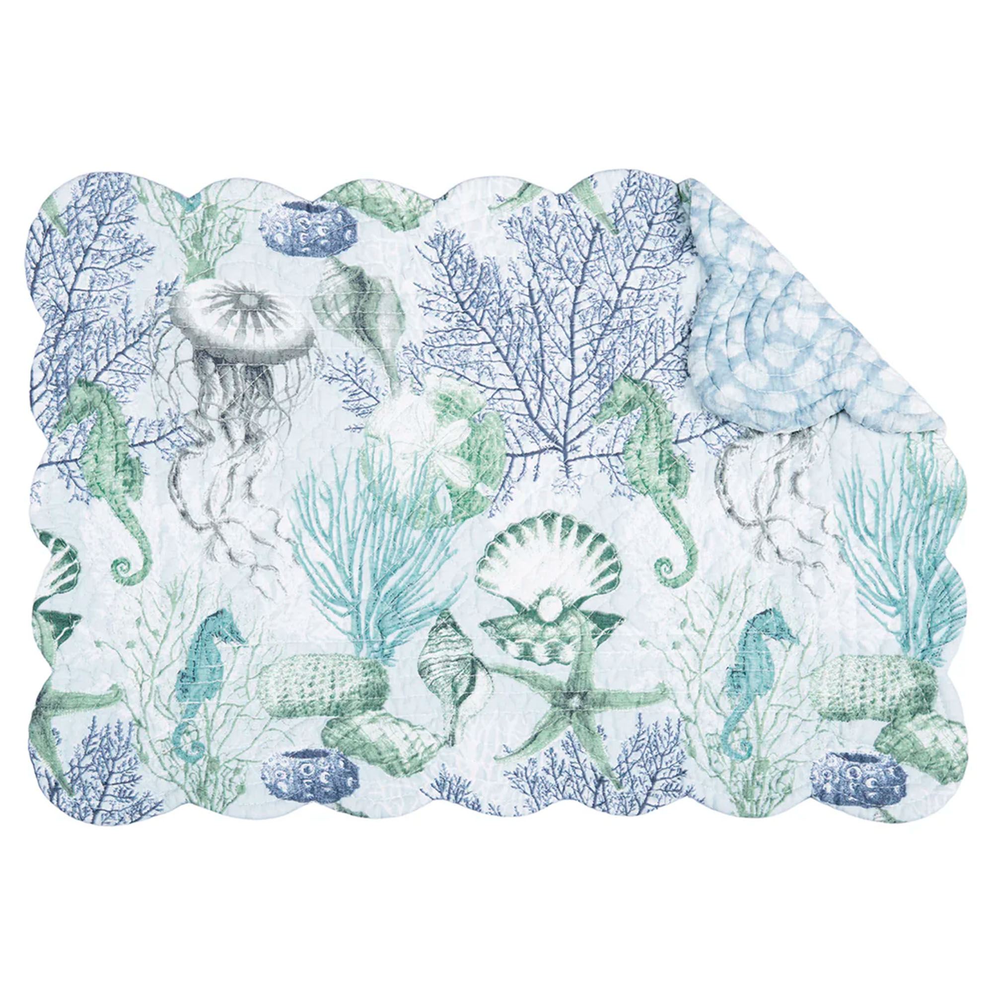 Display the coastal style of the Shoreline Waters Table Linens. These cotton table linens feature seashells, starfish, seahorses, and coral designs on soft blue; the reverse side has a watercolor pattern in shades of blue. Most of these accessories are quilted and have scalloped edges. Colors include shades of blue, green, and gray. Choose Table Runner, Rectangle Placemat Set of 4, Round Placemat Set of 4, or Napkin Set of 4. Machine washable. Imported.