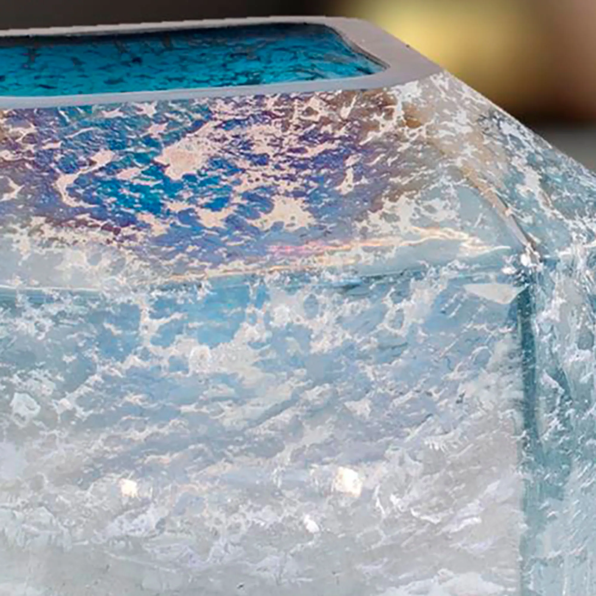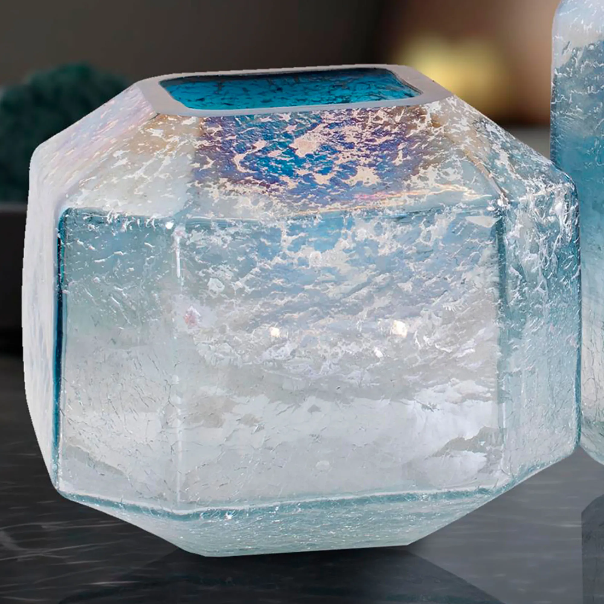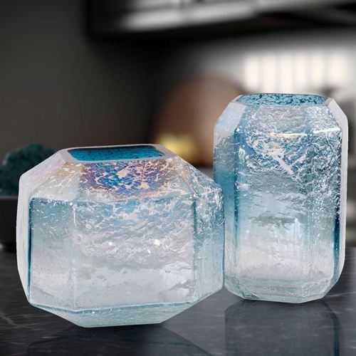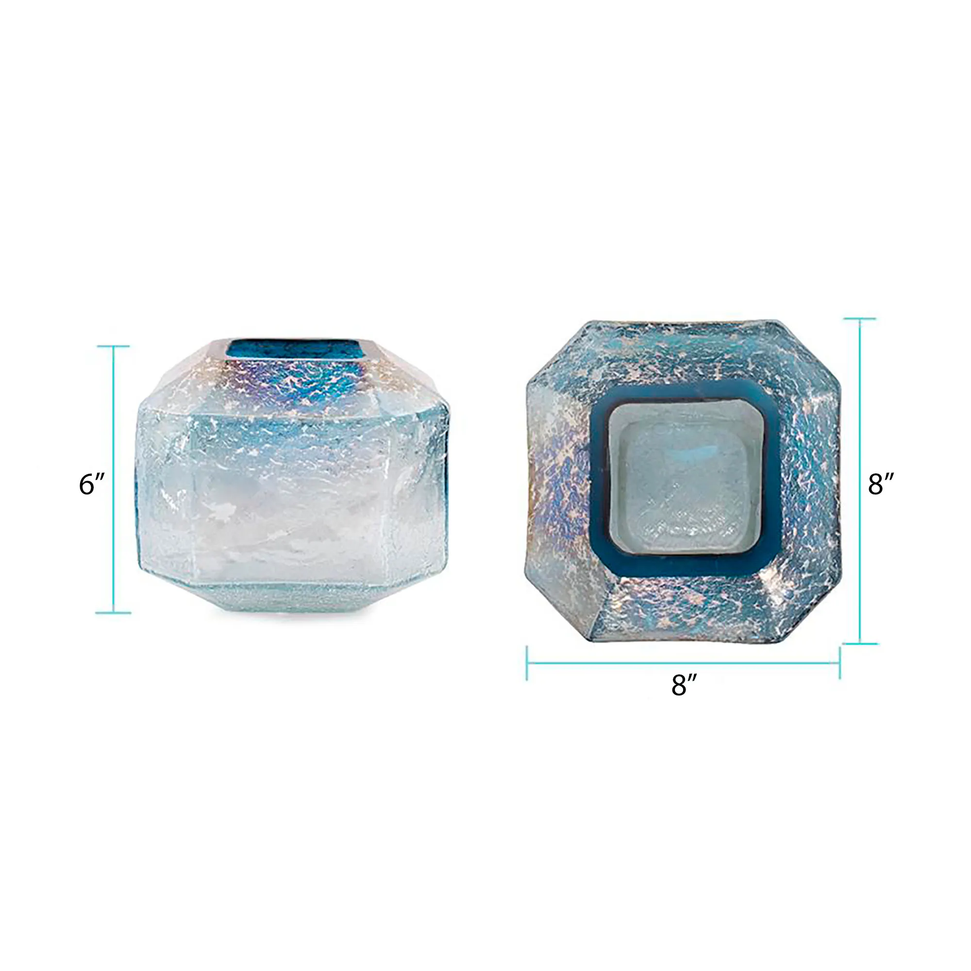 The Glistening Geo Vase sparkles with iridescent arctic blue that fades to a clear color. Each frosted glass vase has a geometric shaped body and a crackle design. Each can be used with real or faux flowers. The short vase opening is 3.5"Wx3.5"D, and the tall vase opening is 4"Wx4"D. Short vase is 8"Wx8"Dx6"H overall. Tall vase is 5.5"Wx5.5"Dx8.5"H overall.