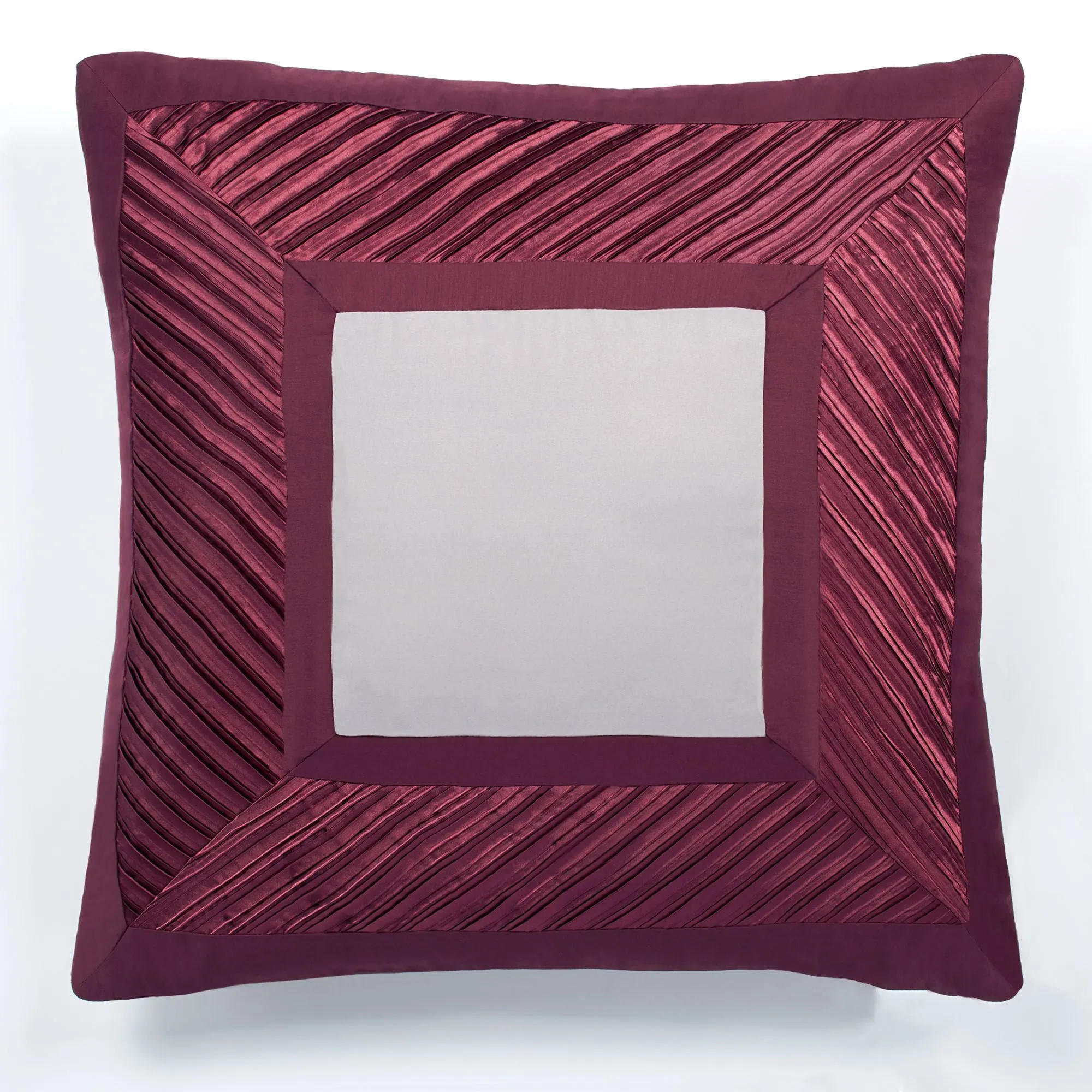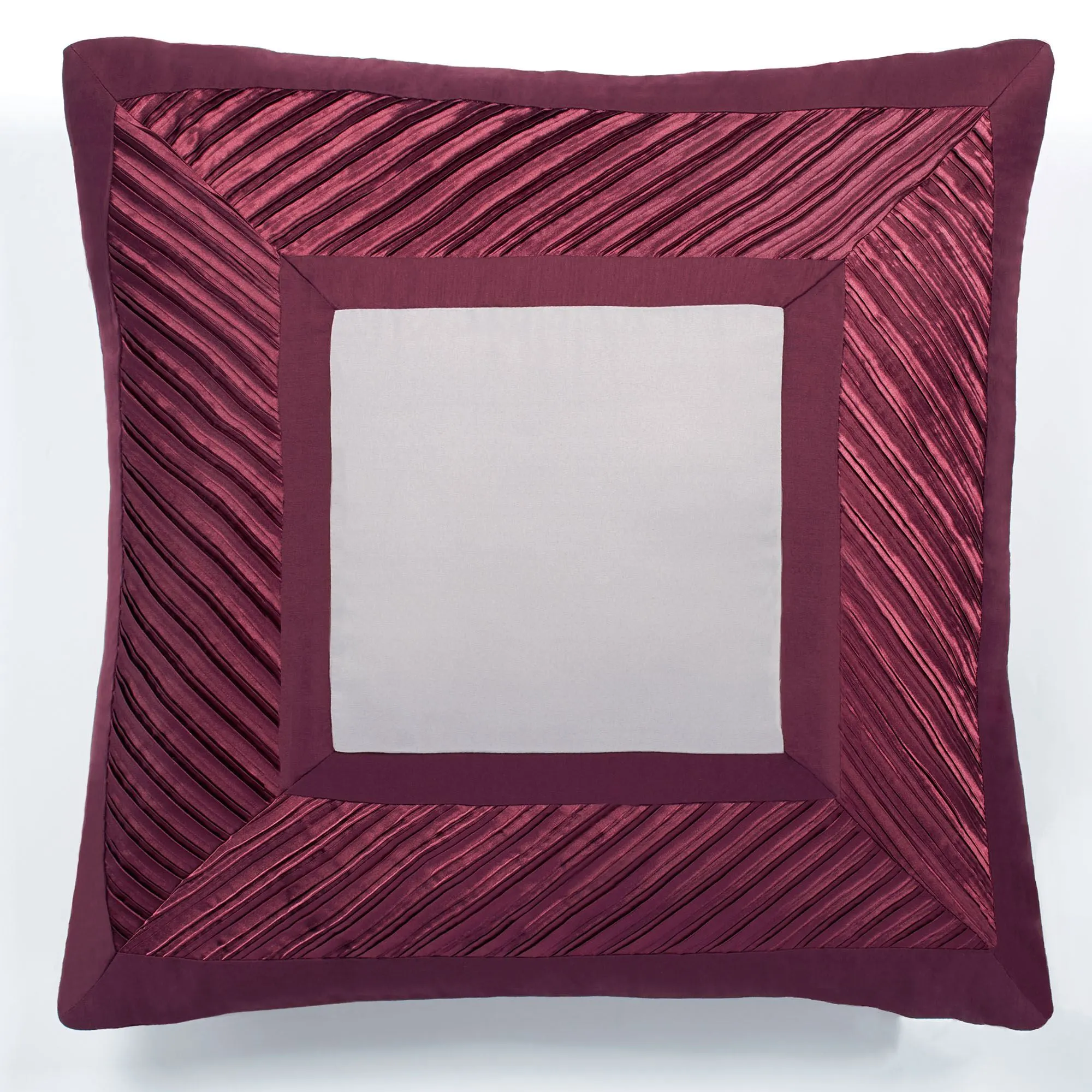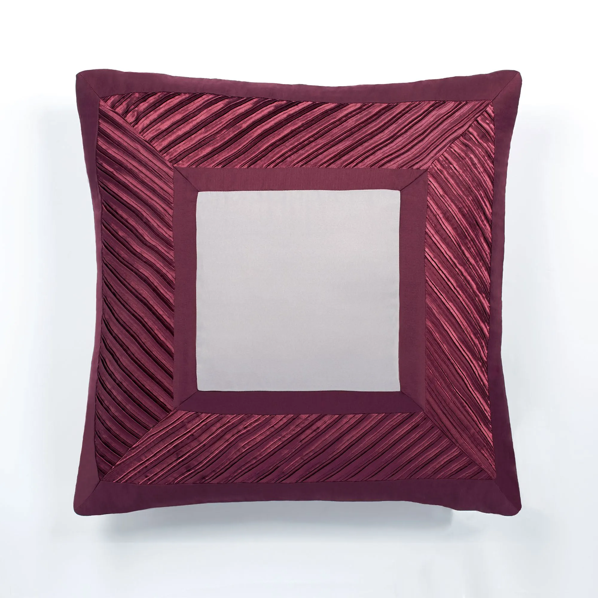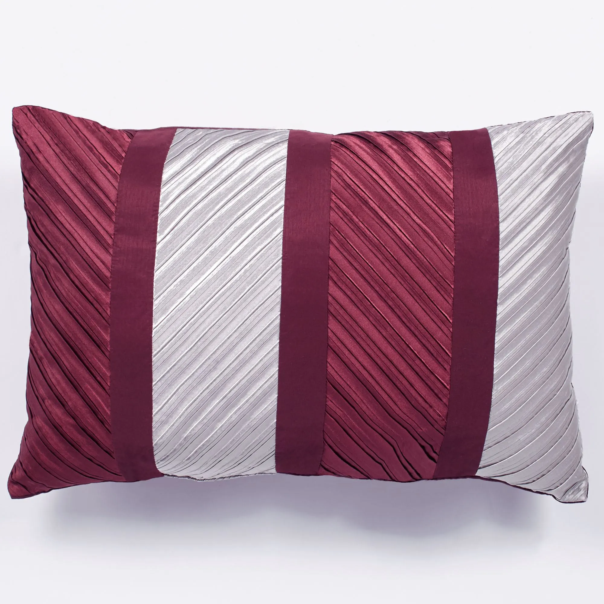 Tailored Pillows: Spot clean. Square has a zipper closure. Square pillow may be monogrammed for an extra charge. Monogramming is shown in the Burgundy thread color. Pleated Rectangle has diagonal designs and dark wine bands. Tailored Rectangle is dark wine with coordinating sequins.