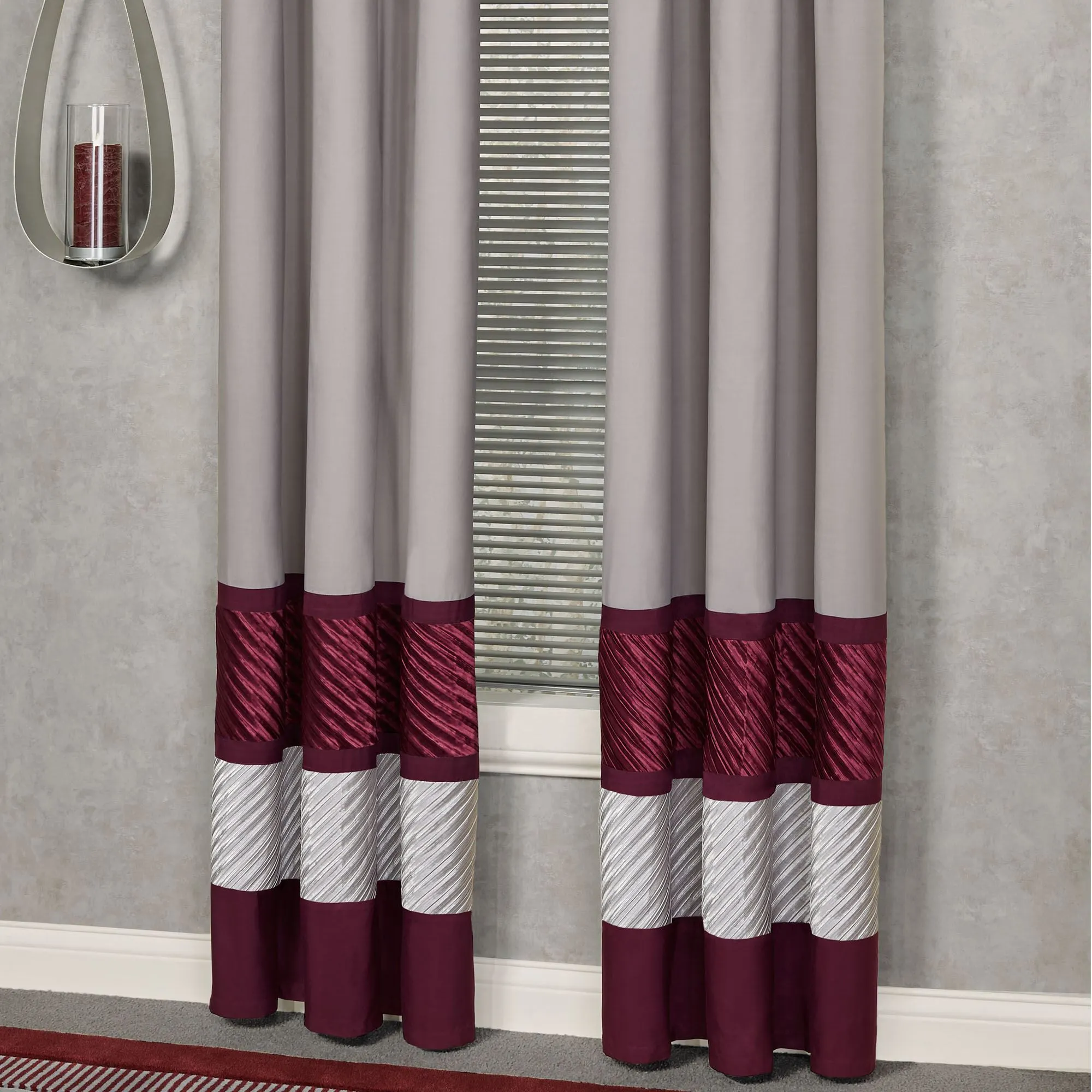 • Contemporary hues of stone, burgundy, and dark wine