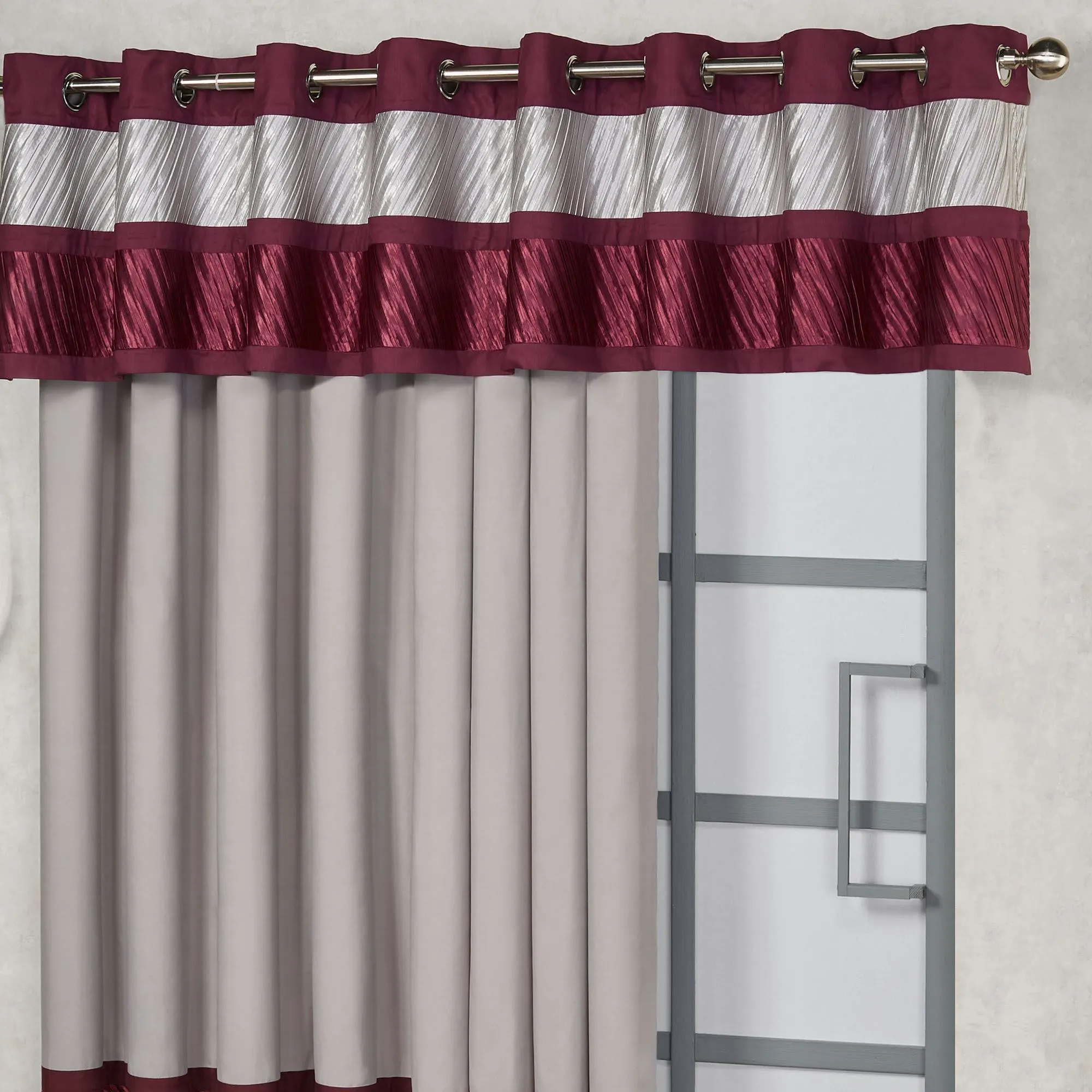 Lined Window Treatments have 1.5" dia. silver metal grommets, except Cornice Set. Grommet Curtains have a solid microfiber top and diagonally-pleated bands. Available in two lengths. The three-piece Cornice Set includes two sides and one center with 1.5" rod pockets. Center piece of the cornice valance set may be monogrammed for an extra charge. Monogramming is shown in the Burgundy thread color. Pieced Grommet Valance has diagonal pleats and brushed dark wine bands. Available in two widths. The Grommet Patio Panel, sold individually, mimics the curtain design.