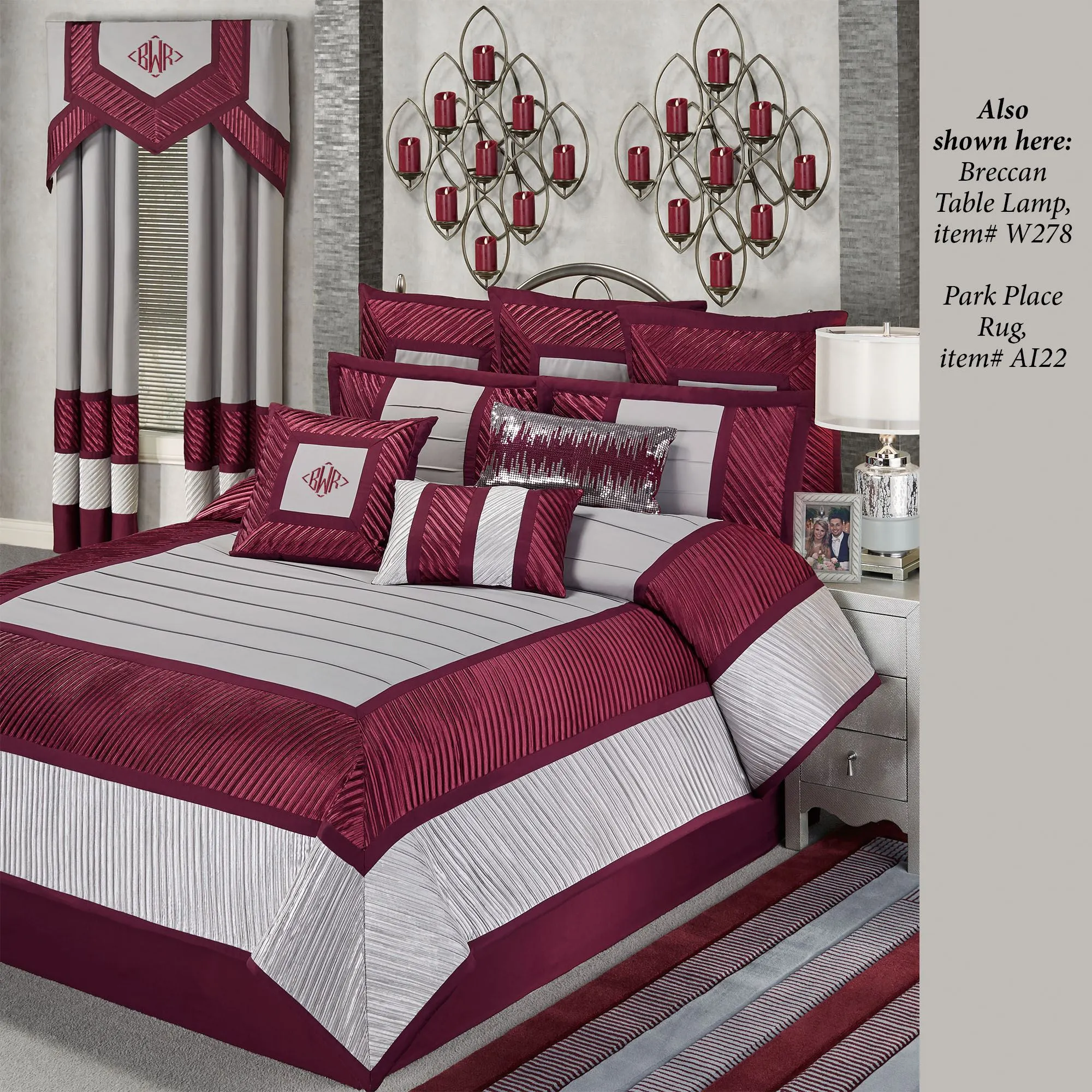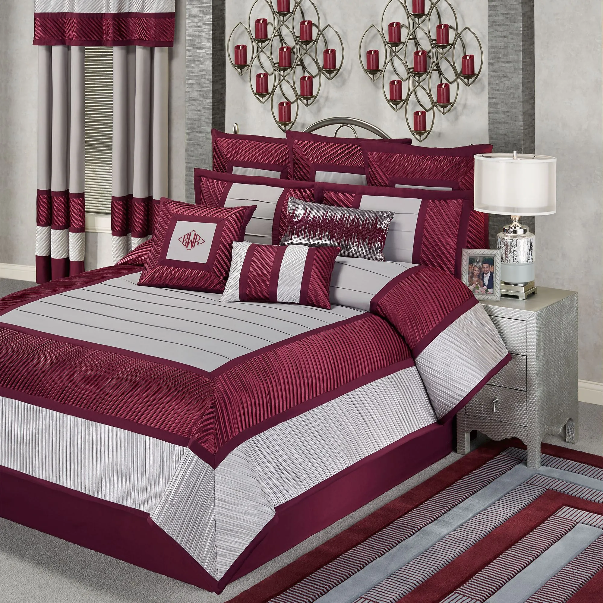 Modern elegance sweeps through the Sigma Comforter Bedding. Oversized, polyester comforter features a stone microfiber pleated center, mitred burgundy and stone diagonal-pleated poly satin frames, and smooth, dark wine bands. Backing is dark wine polyester microfiber. Fill is polyester. Machine washable. Imported.