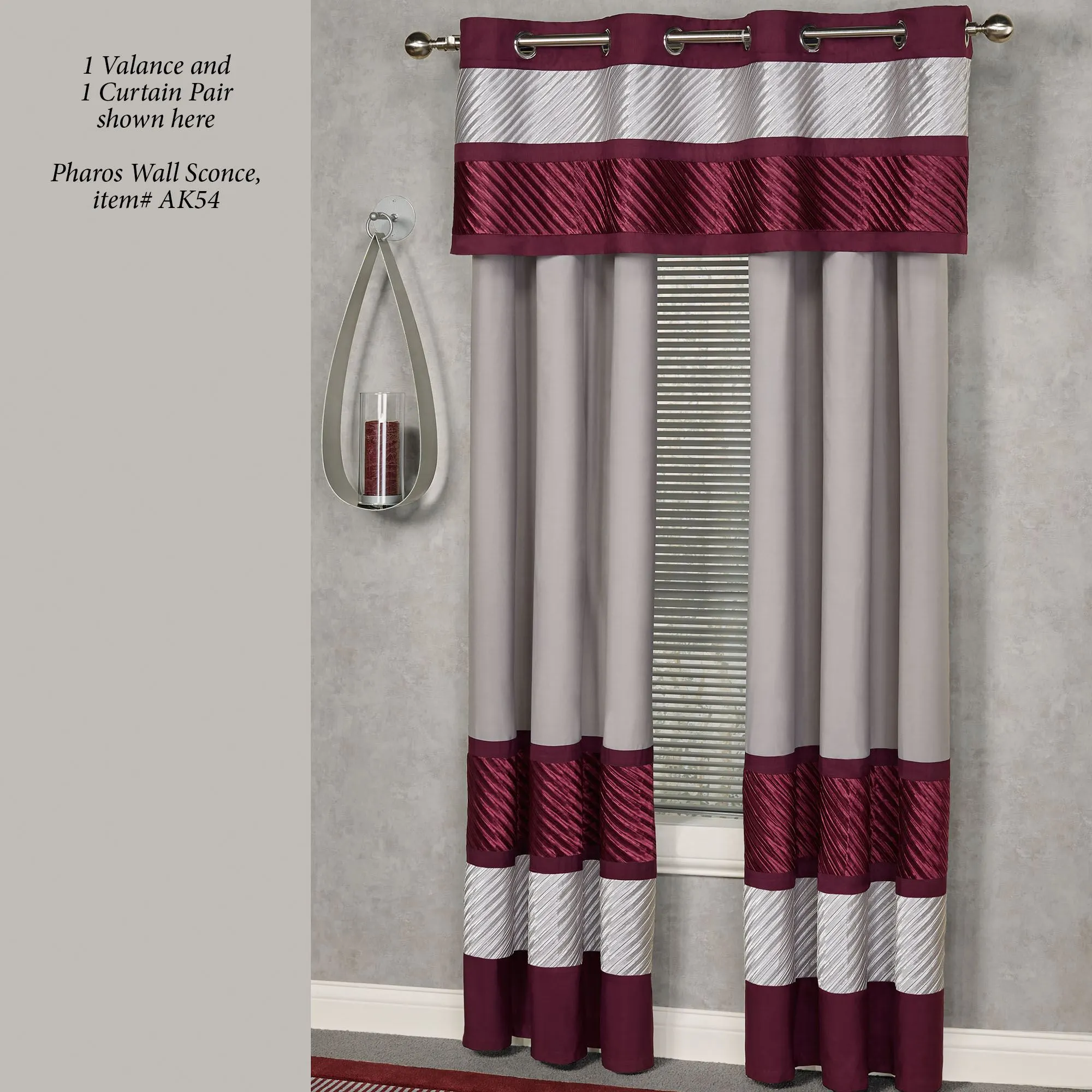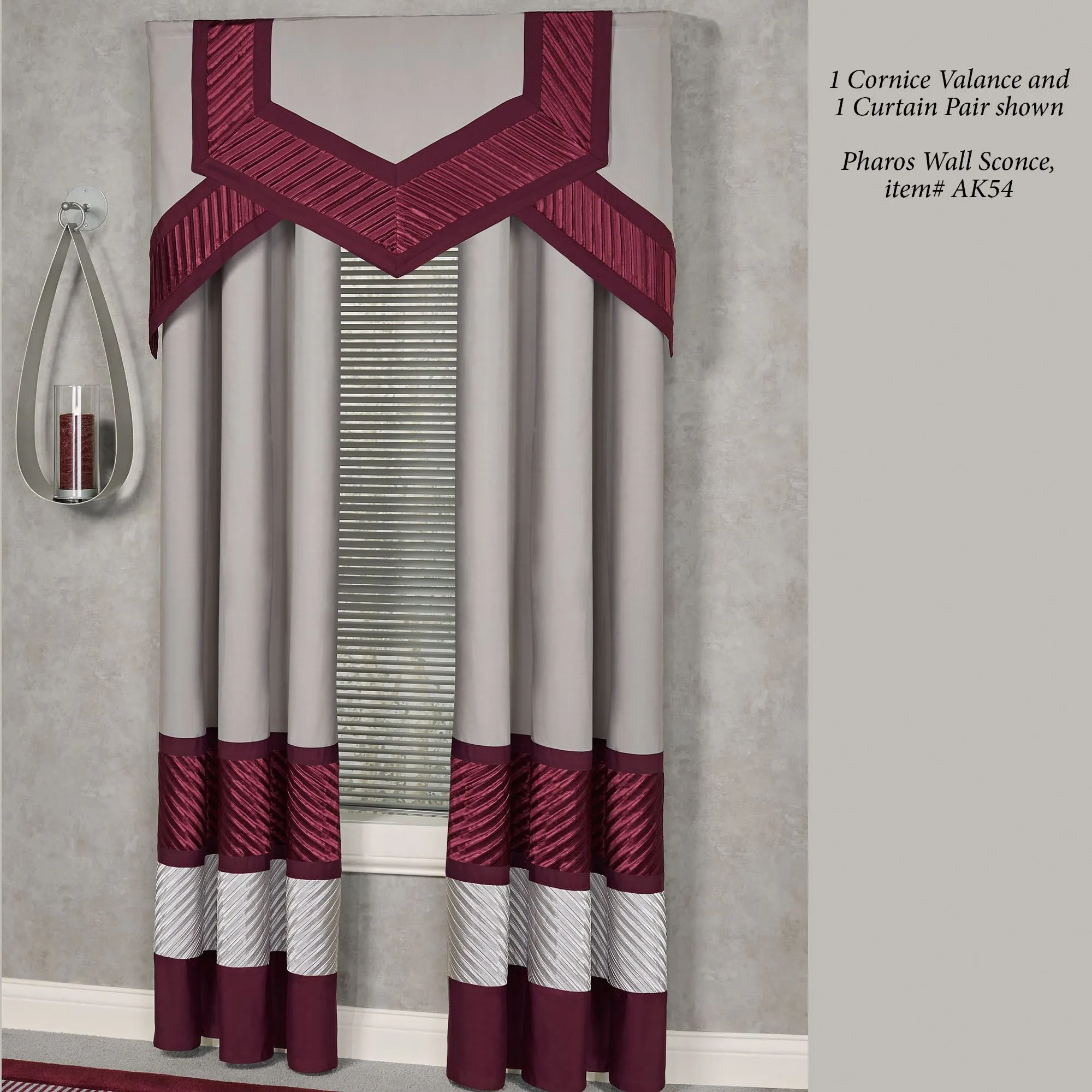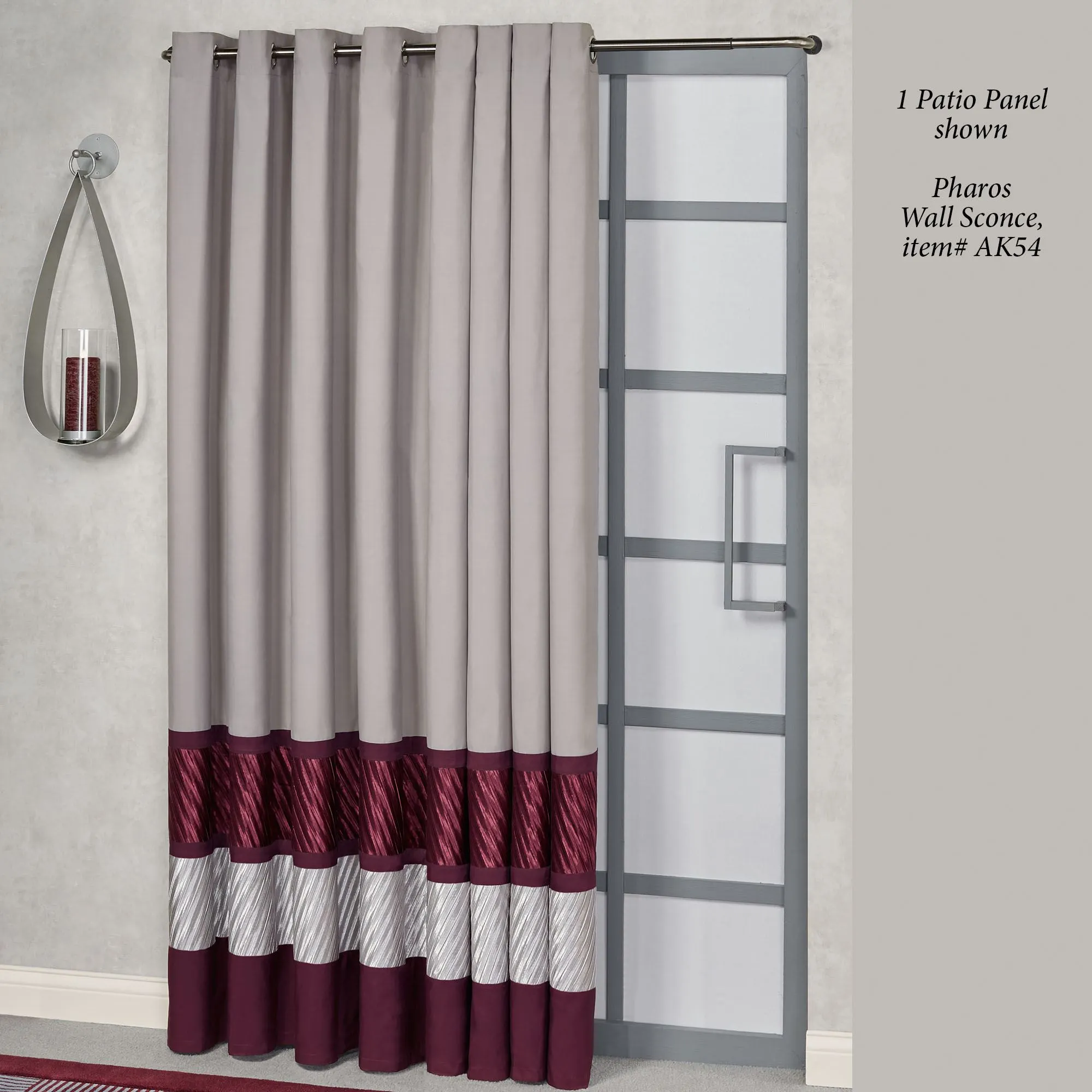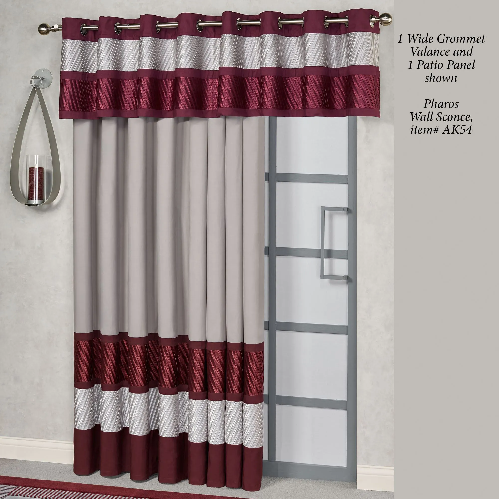 Lined Window Treatments have 1.5" dia. silver metal grommets, except Cornice Set. Grommet Curtains have a solid microfiber top and diagonally-pleated bands. Available in two lengths. The three-piece Cornice Set includes two sides and one center with 1.5" rod pockets. Center piece of the cornice valance set may be monogrammed for an extra charge. Monogramming is shown in the Burgundy thread color. Pieced Grommet Valance has diagonal pleats and brushed dark wine bands. Available in two widths. The Grommet Patio Panel, sold individually, mimics the curtain design.