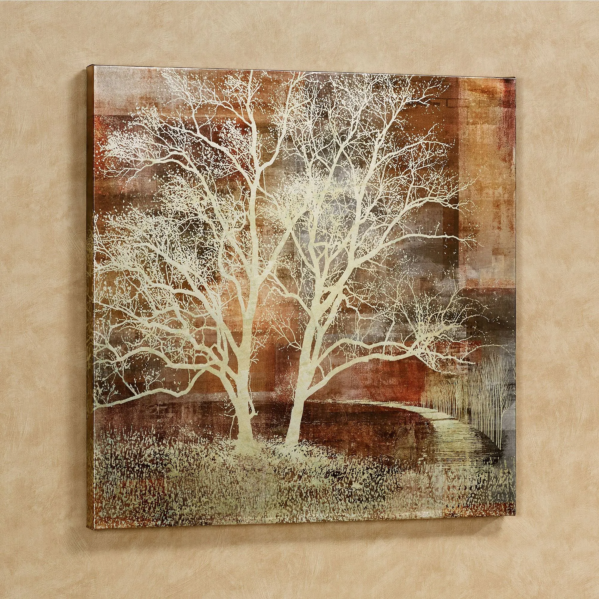 The Silhouette Tree Canvas Wall Art brings to mind lovely crisp days at the end of autumn's reign. Gallery-wrapped over a wood frame, the silver giclee canvas features the silhouette of trees, grasses, and a stretching sidewalk against rich hues of russet, bronze, and burgundy. Measures 32"sq.x2"D.