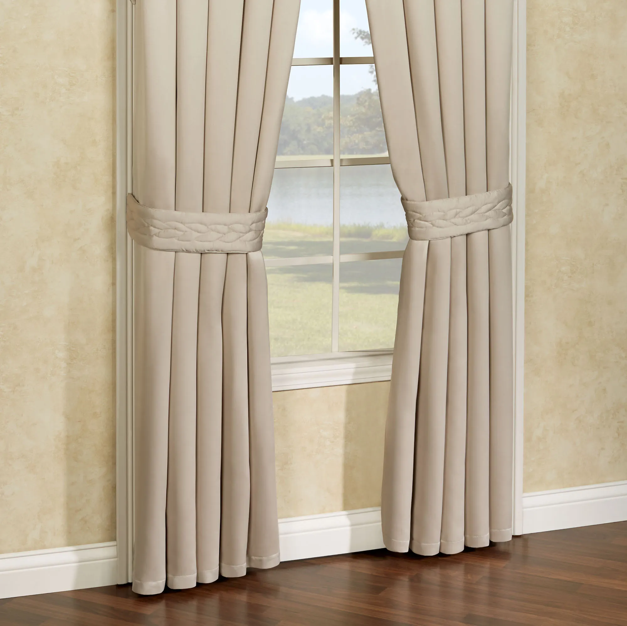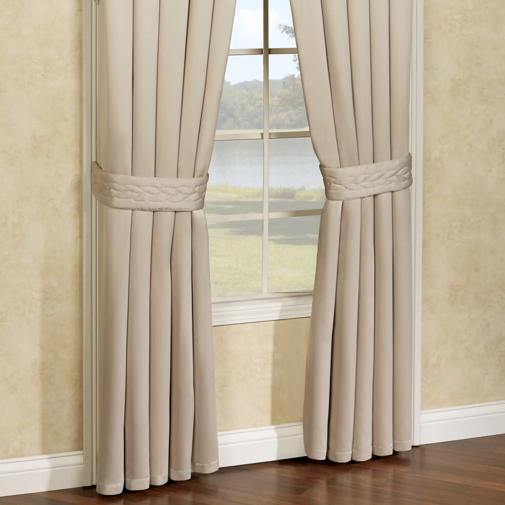 Fall in love with the incredibly smooth and soft Silk Allure Curtain Pair. This luxurious window treatment is polyester silk. The tailored, lined curtains are a solid color. The included tiebacks have a quilted braid design with a trapunto effect. Curtain pair is 84"Wx84"L; rod pocket size is 3". Machine wash. Imported. The curtain pair width is the total width of two panels together.