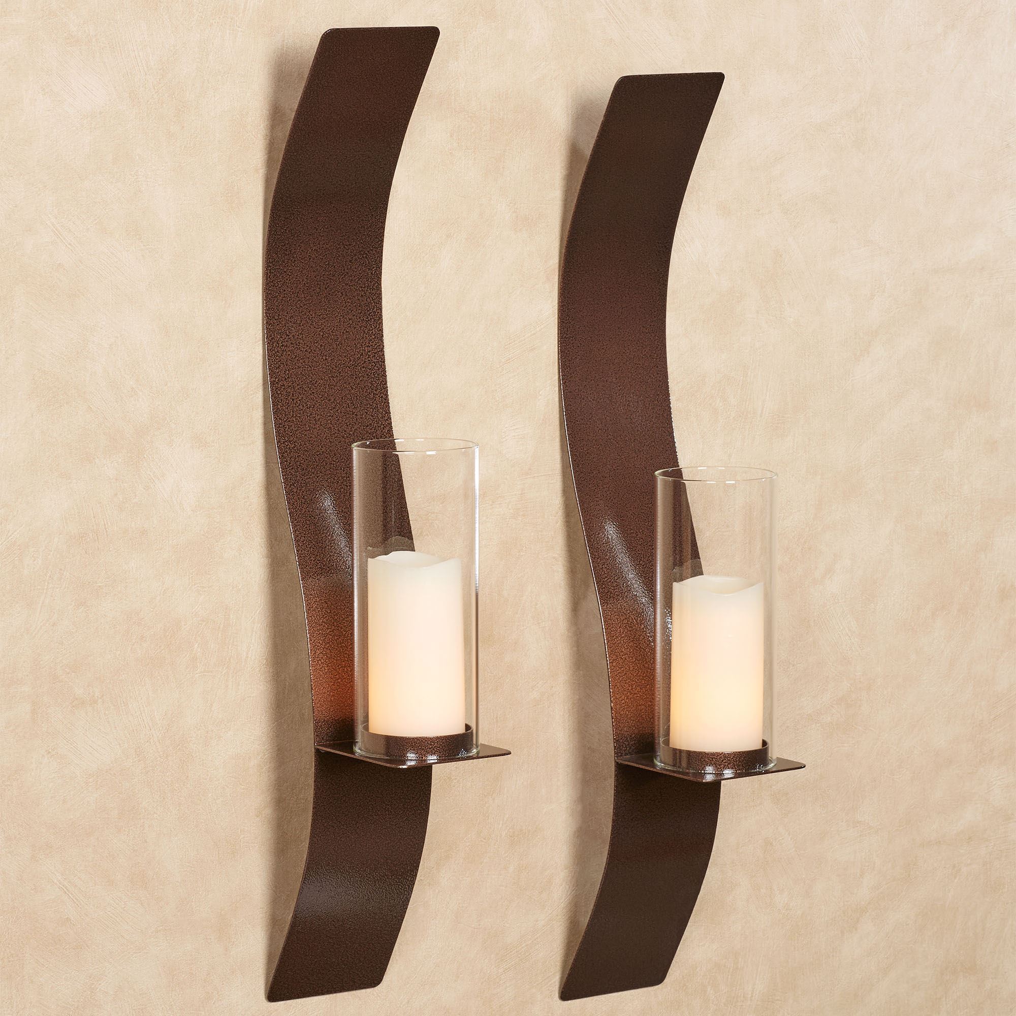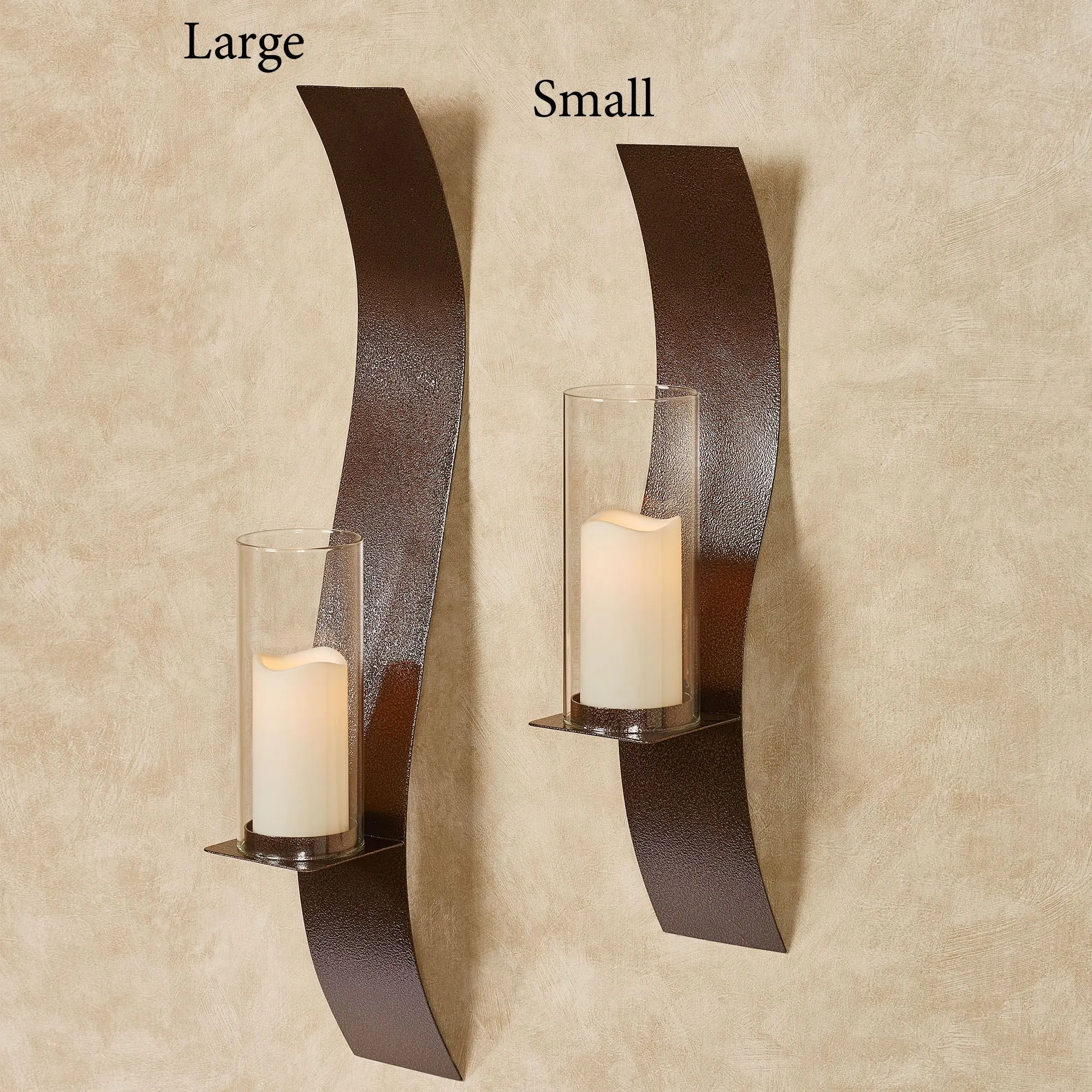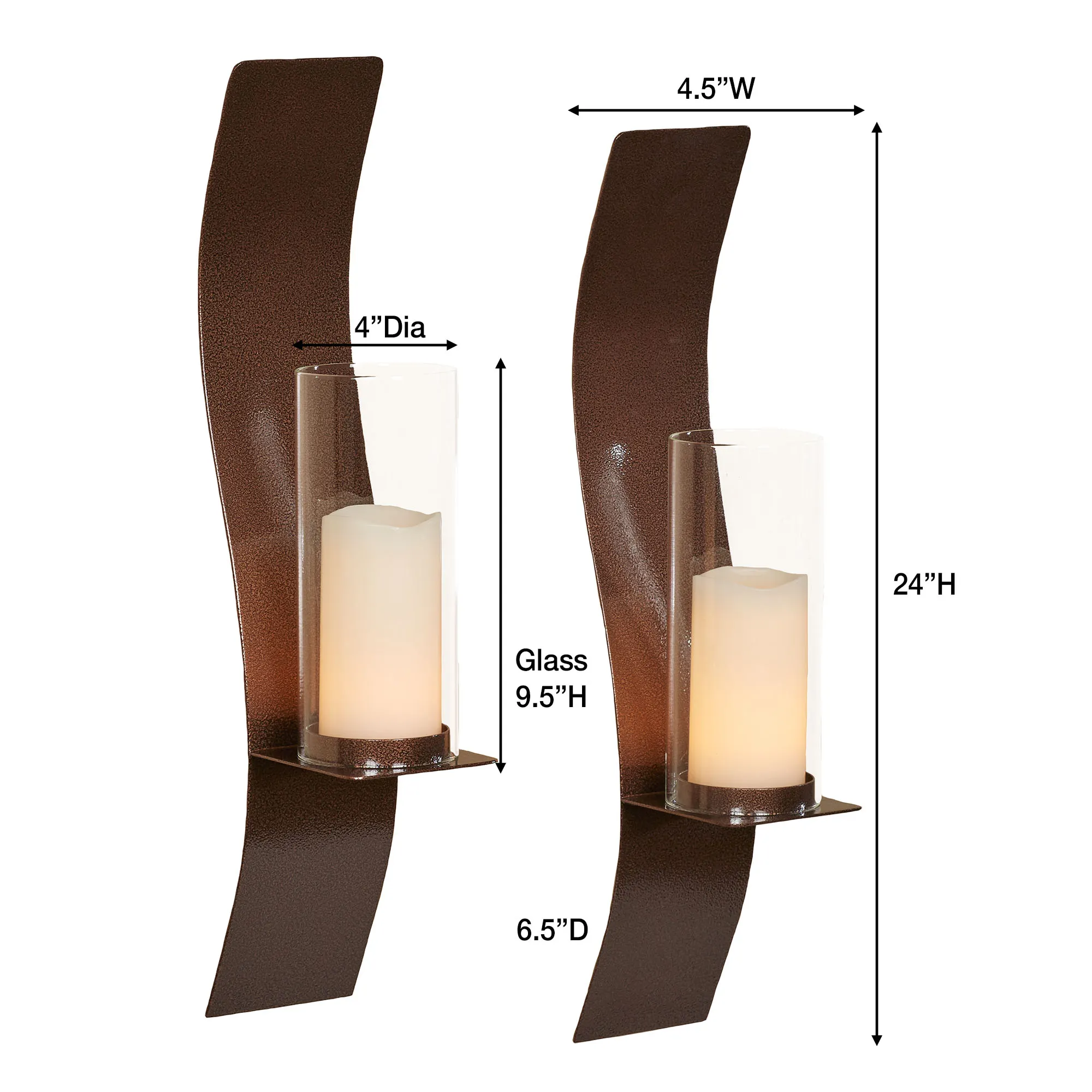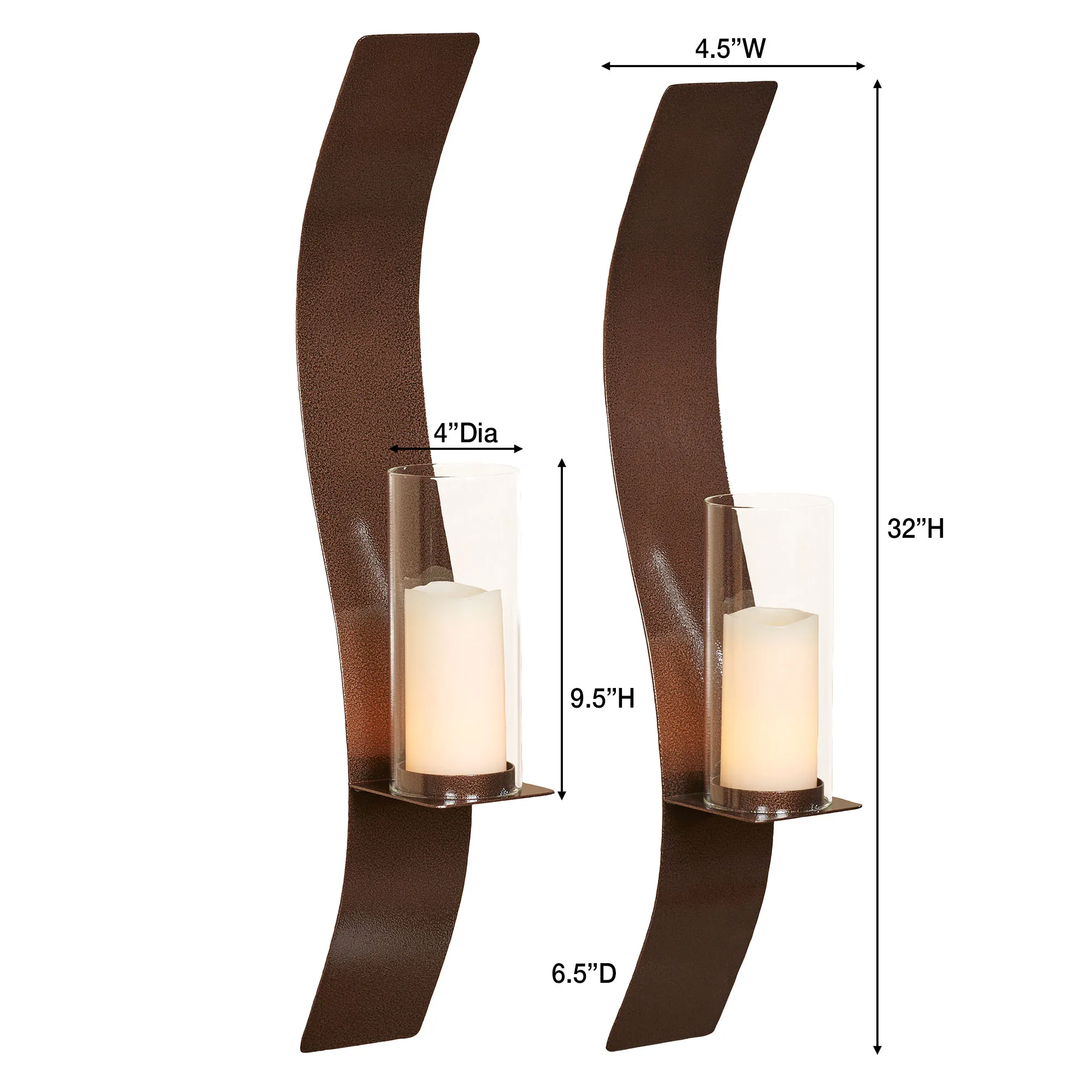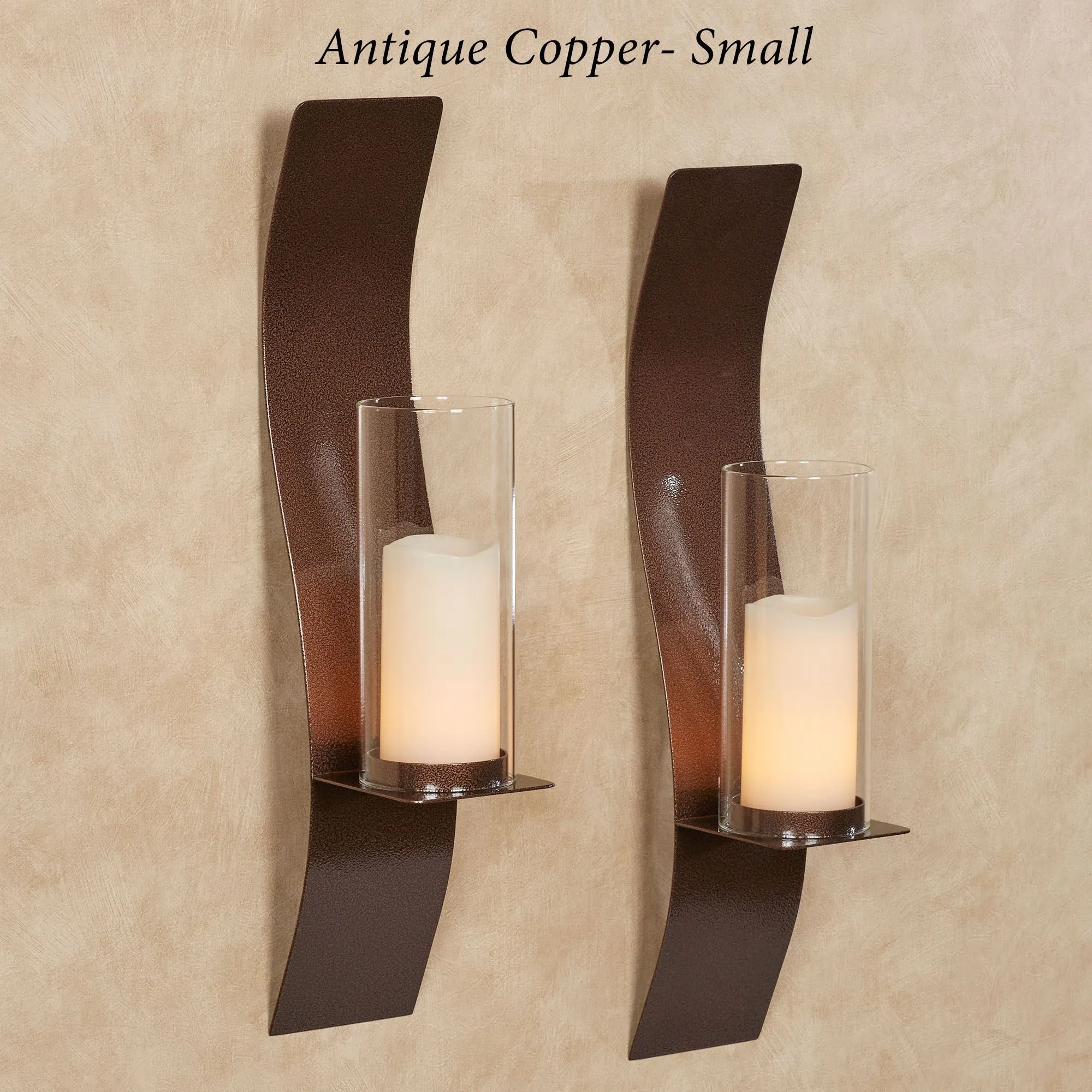 The graceful Sinuous Wall Sconce Pair refines modern style with its soft, flowing curves. This alluring, handcrafted, 14-gauge steel wall sconce pair features a powder-coated, antique copper finish that is UV-resistant, weather-resistant, and tarnish-resistant. The included 4"dia.x9.5"H clear glass hurricanes will hold your pillar candles up to 3" dia. Small Pair is 4.5"Wx6.5"Dx24"H each. Large Pair is 4.5"Wx6.5"Dx32"H each.