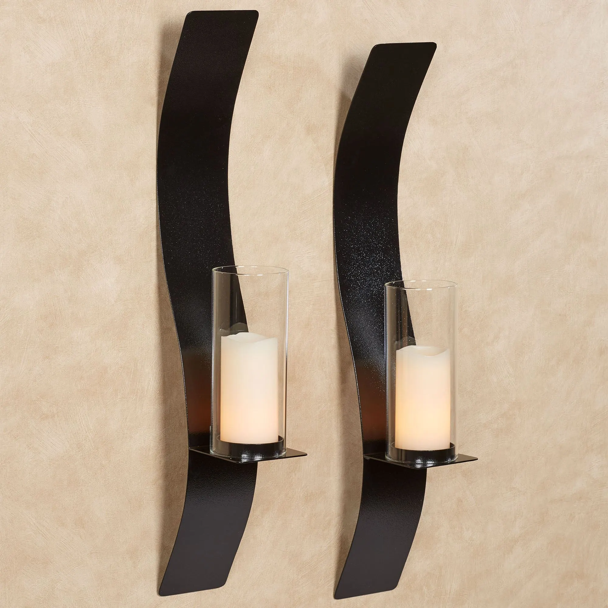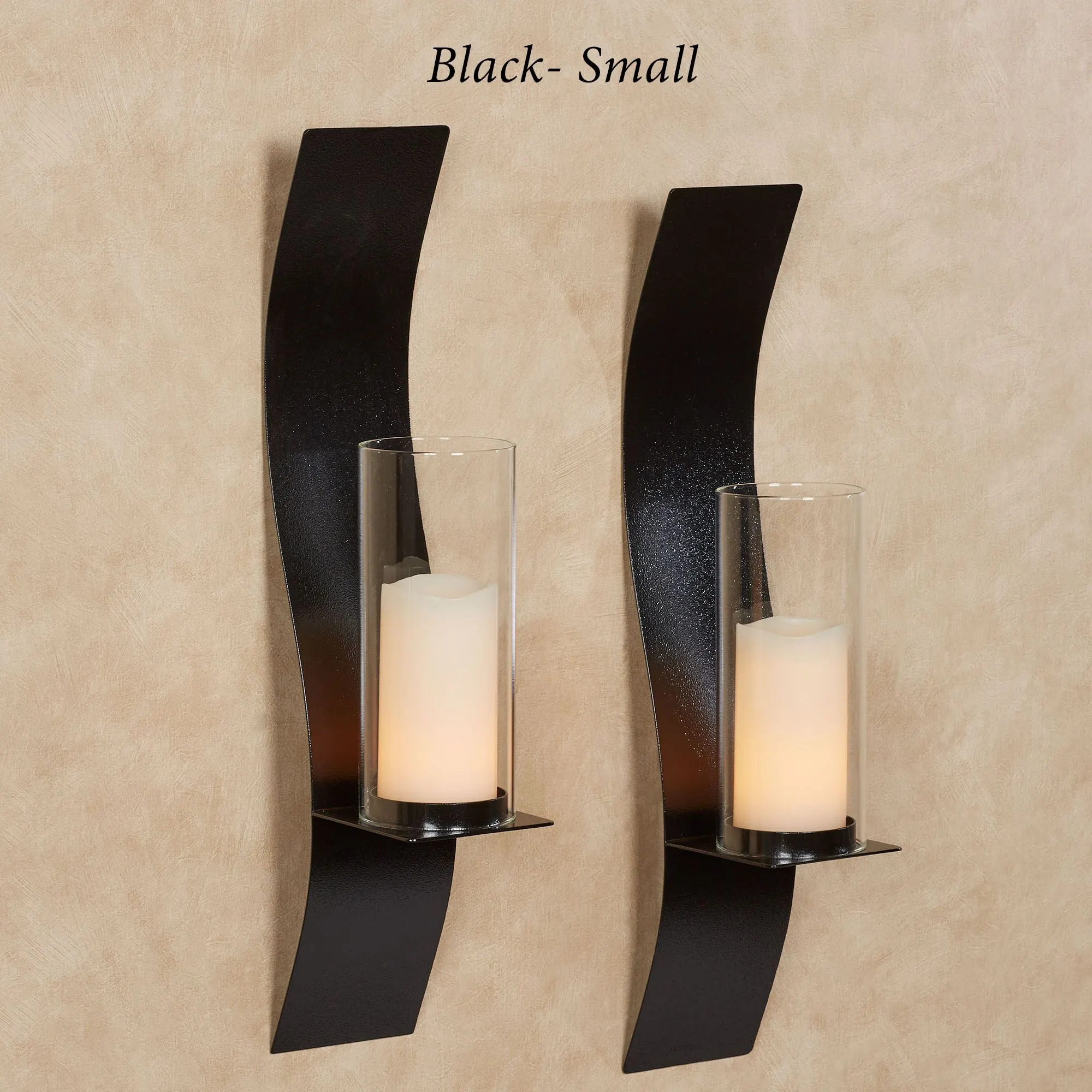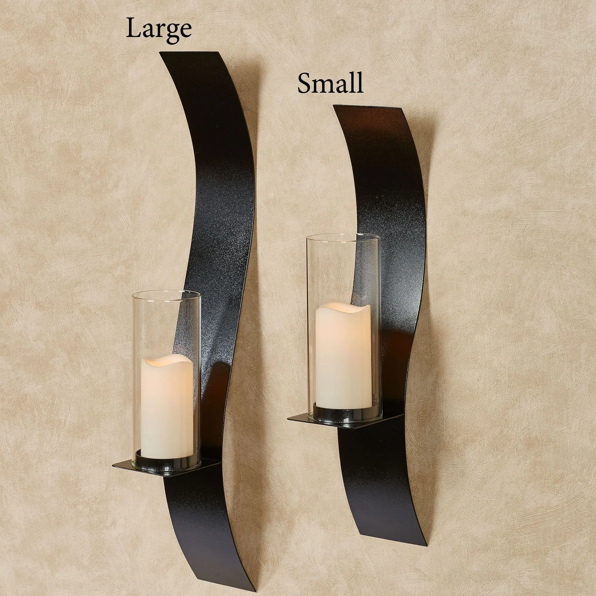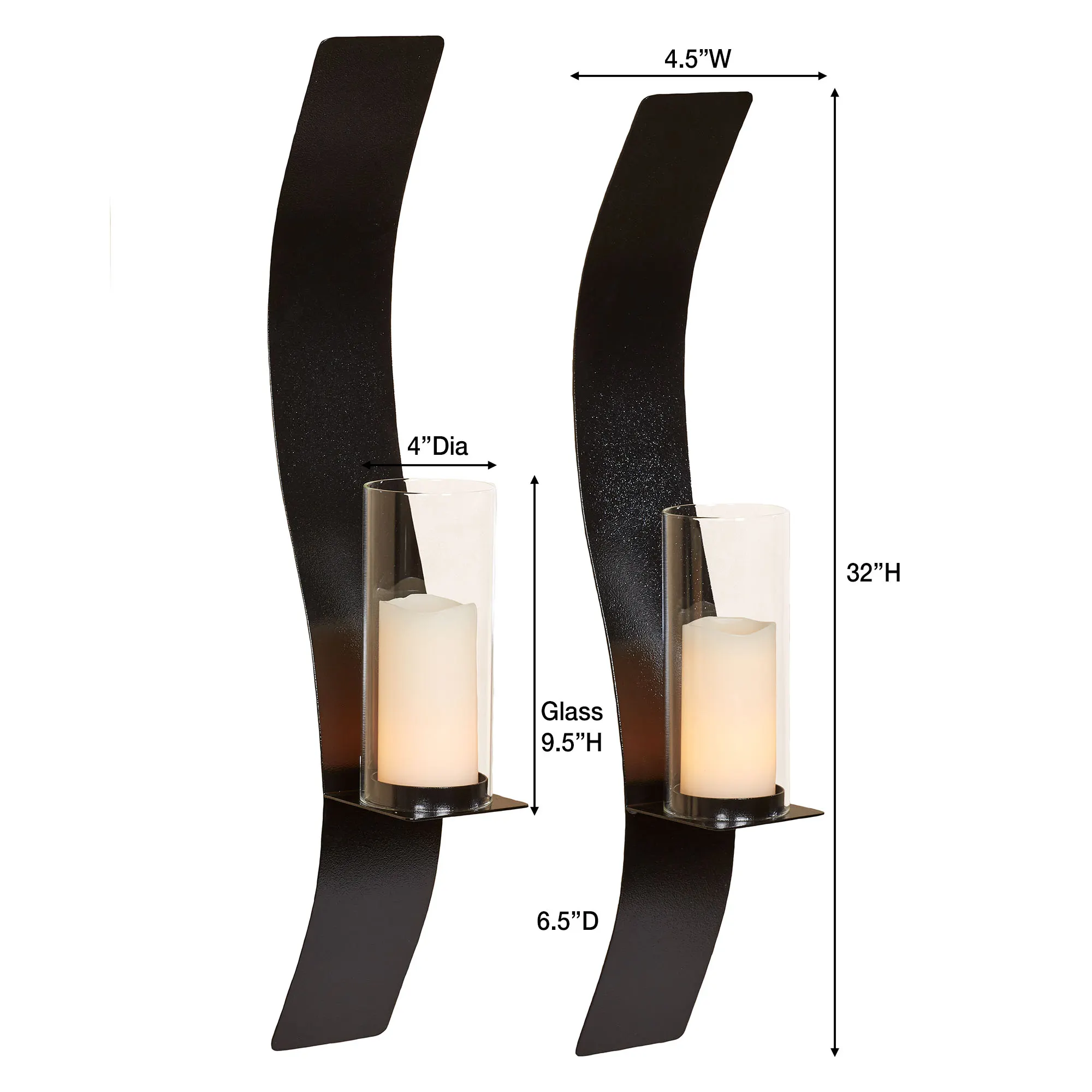 The graceful Sinuous Wall Sconce Pair refines modern style with its soft, flowing curves. This alluring, handcrafted, 14-gauge steel wall sconce pair features a powder-coated black finish that is UV-resistant, weather-resistant, and tarnish-resistant. The included 4"dia.x9.5"H clear glass hurricanes will hold your pillar candles up to 3" dia. Small Pair is 4.5"Wx6.5"Dx24"H each. Large Pair is 4.5"Wx6.5"Dx32"H each.