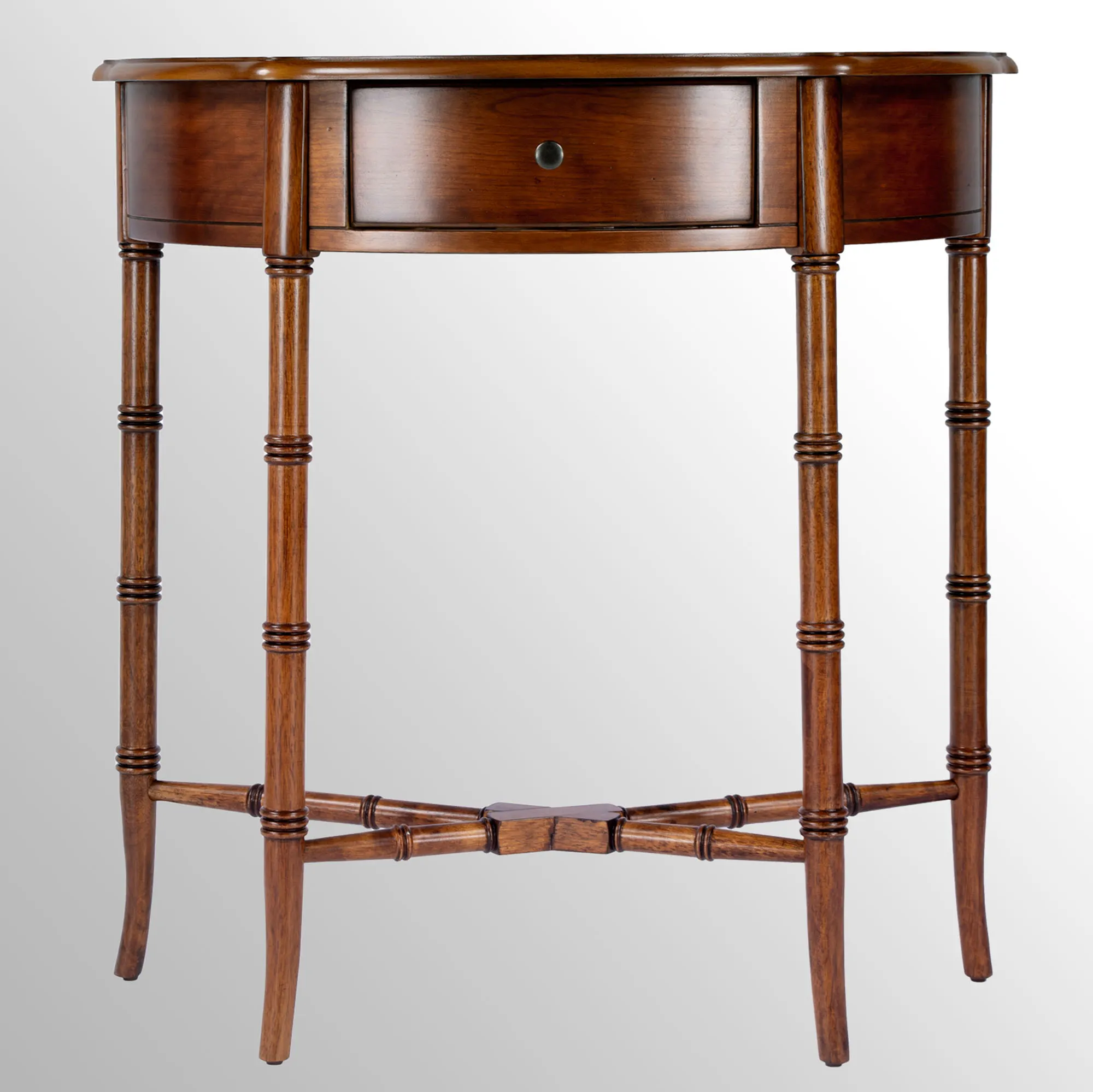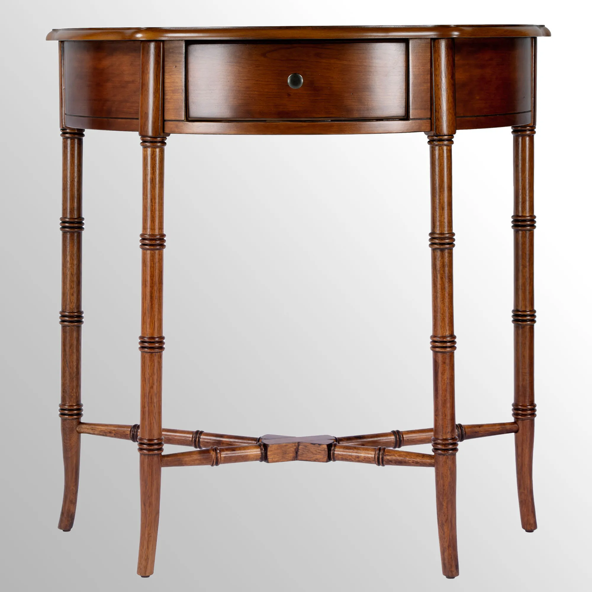 Beautiful detailing styles the Skilling Console Table with undeniable charm. From Butler Specialty, the wooden table features a classic demilune shape, cherry and oak veneers, four tapered legs, a crossing brace, and bamboo-like ring accents. The drawer, 9.5"Wx9"Dx2.5"H, adds extra function to the furnishing. The wood-toned designs showcase the natural wood variation protected under a clear lacquer. Maximum recommended weight is 80 lbs. Overall, the console table measures 31"Wx14"Dx32"H and weighs 21 lbs.