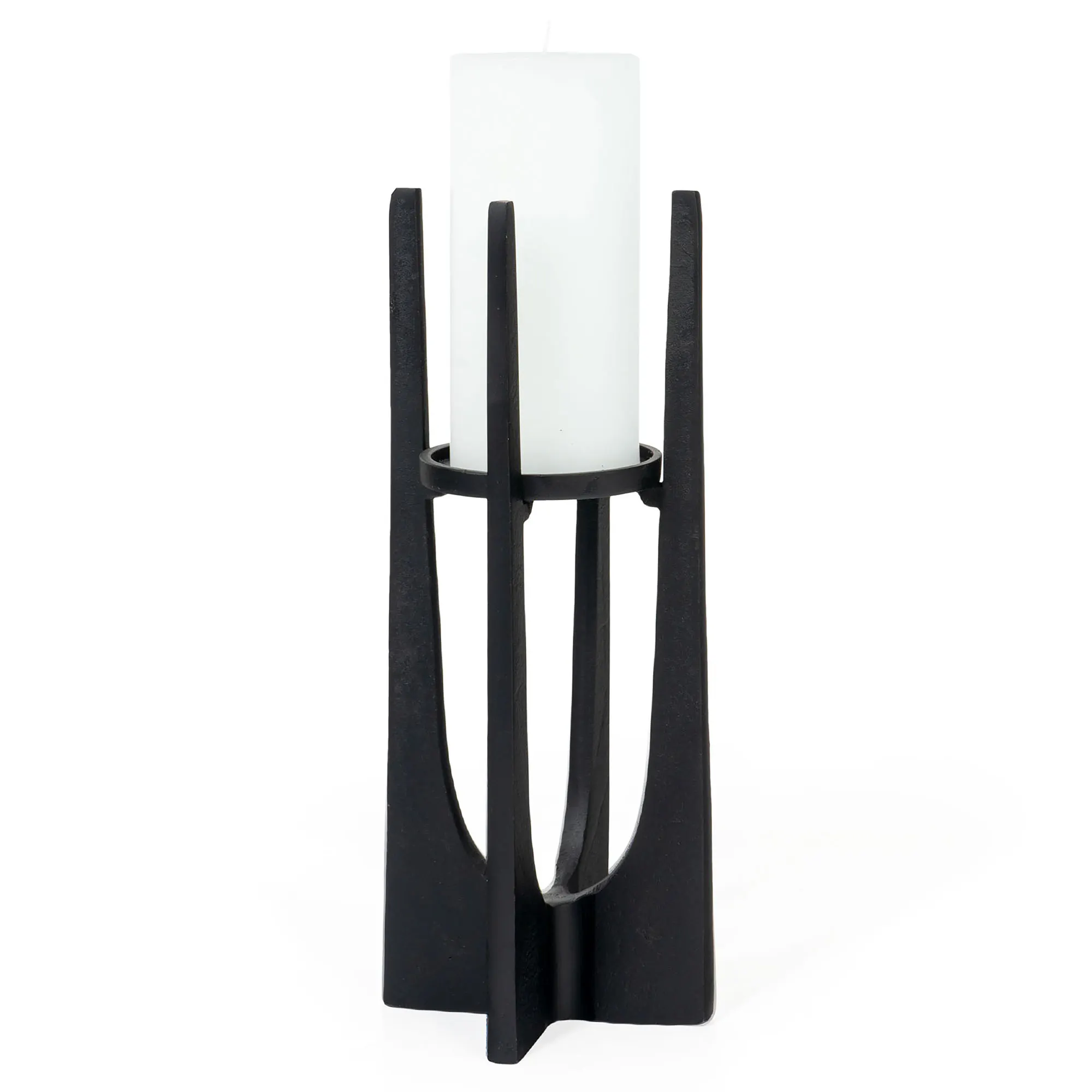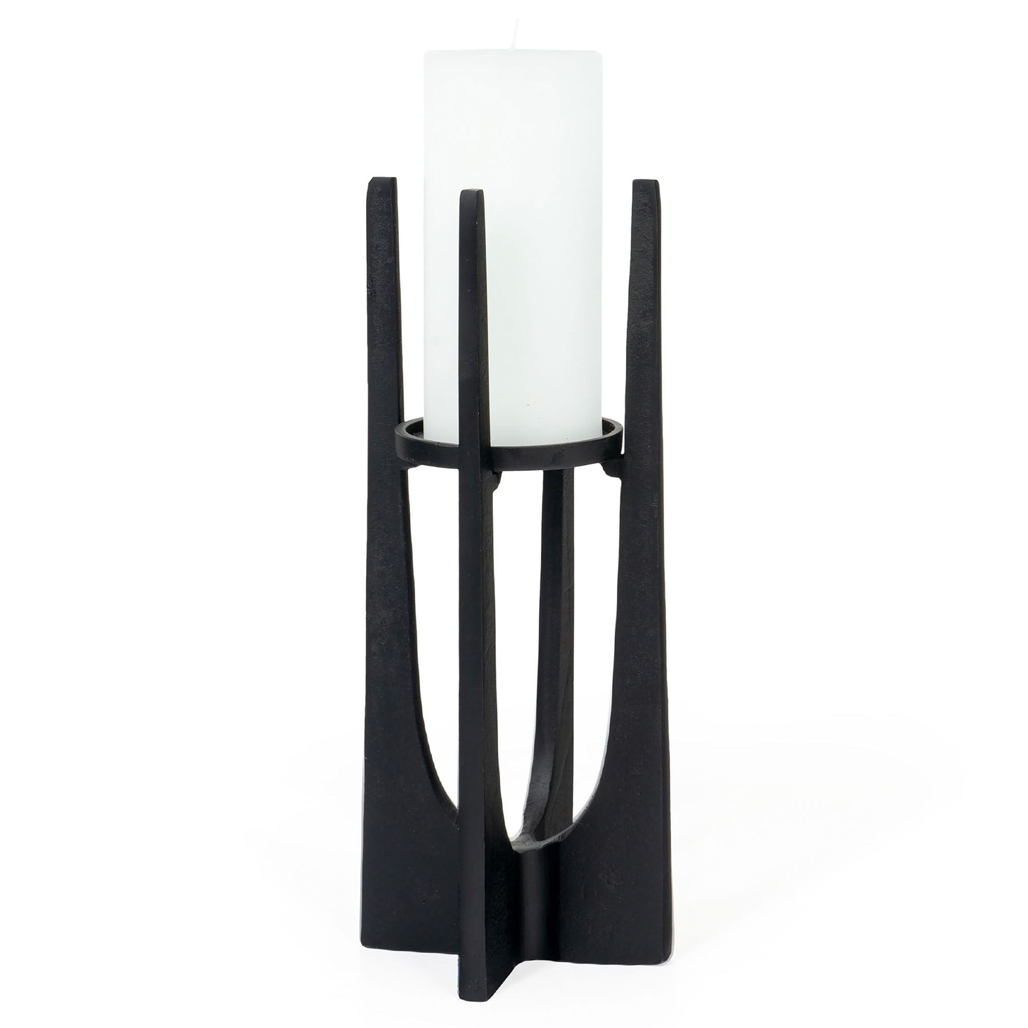 The Skye Candleholder has a modern style that is visually stunning. This metal candleholder features a unique design with an X-cross base and U-shaped arms. Candleholders are sold individually. Each will hold your one 3" pillar candle. Small has a black finish and is 5"sq.x12"H. Large has a gold finish and is 5"sq.x16"H.