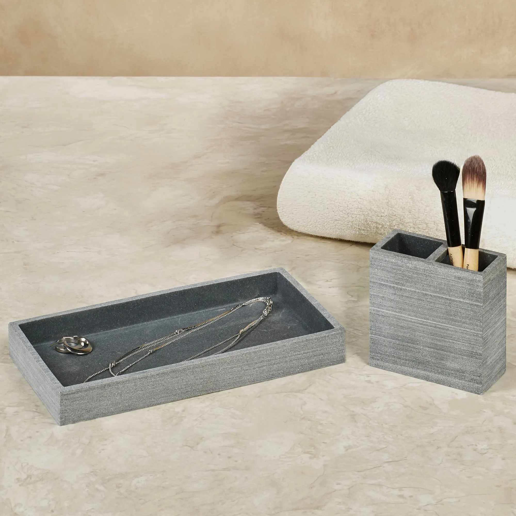 Sleek lines define the Slate Bath Accessories. With a modern style, each resin accent features subtle platinum gray and dark gray striations that resemble natural slate. The Brush Holder, 4"Wx2"Dx4"H, can be used to hold your toothbrushes or makeup brushes. Tray is 10"Wx5.5"Dx1"H.