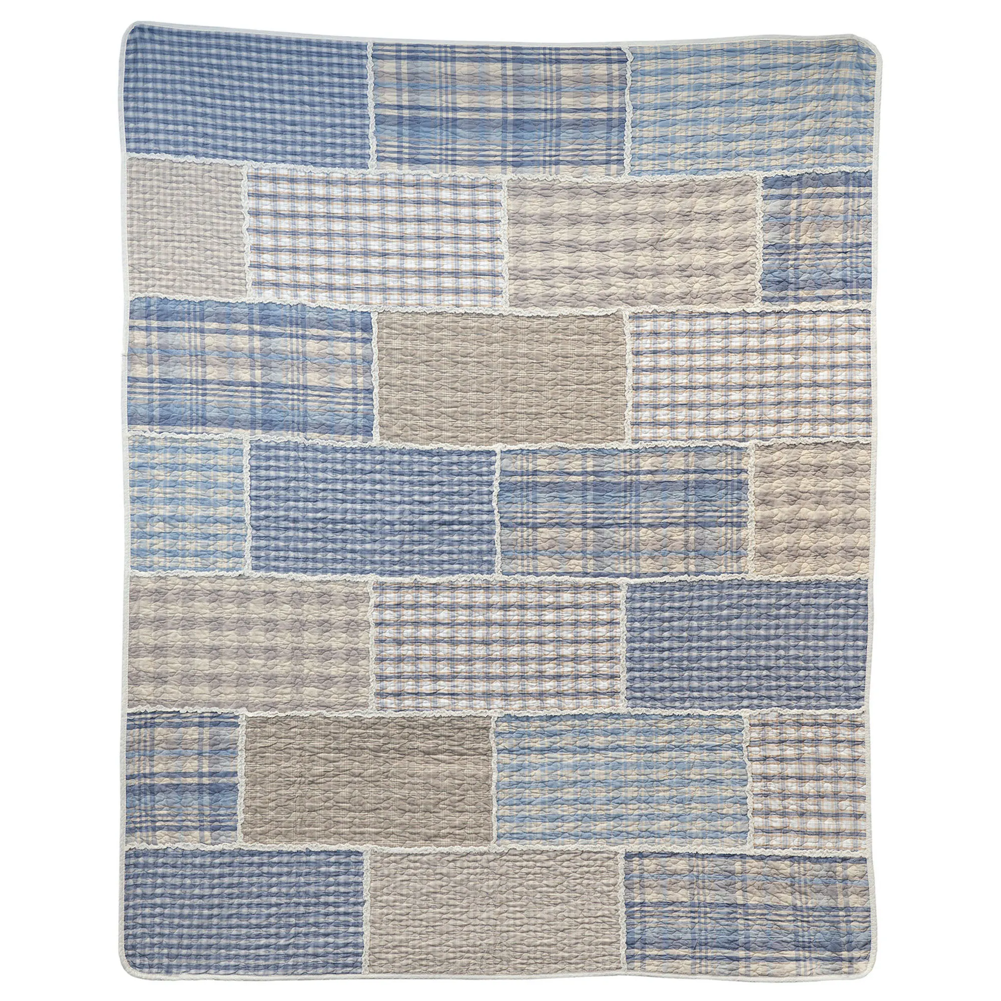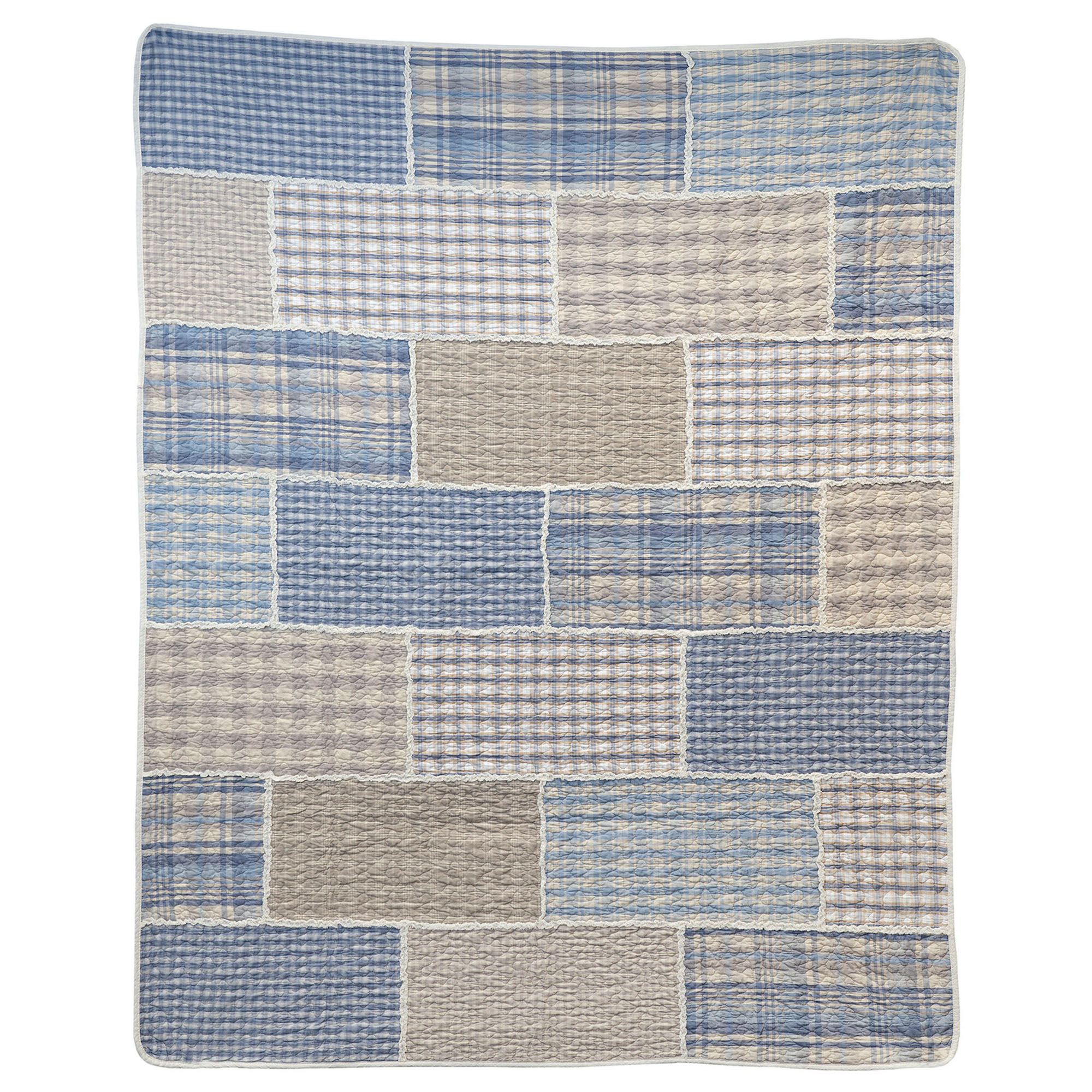 Timeless charm fills the Slate Cobblestone Bedding with a relaxed air. From Your Lifestyle(R) by Donna Sharp(R), the pre-washed and preshrunk cotton ensemble features a multitude of blue and beige printed plaid patchwork blocks joined with soft ivory rag edges. Vermicelli quilting and bound edges complete each element with classic detailing.