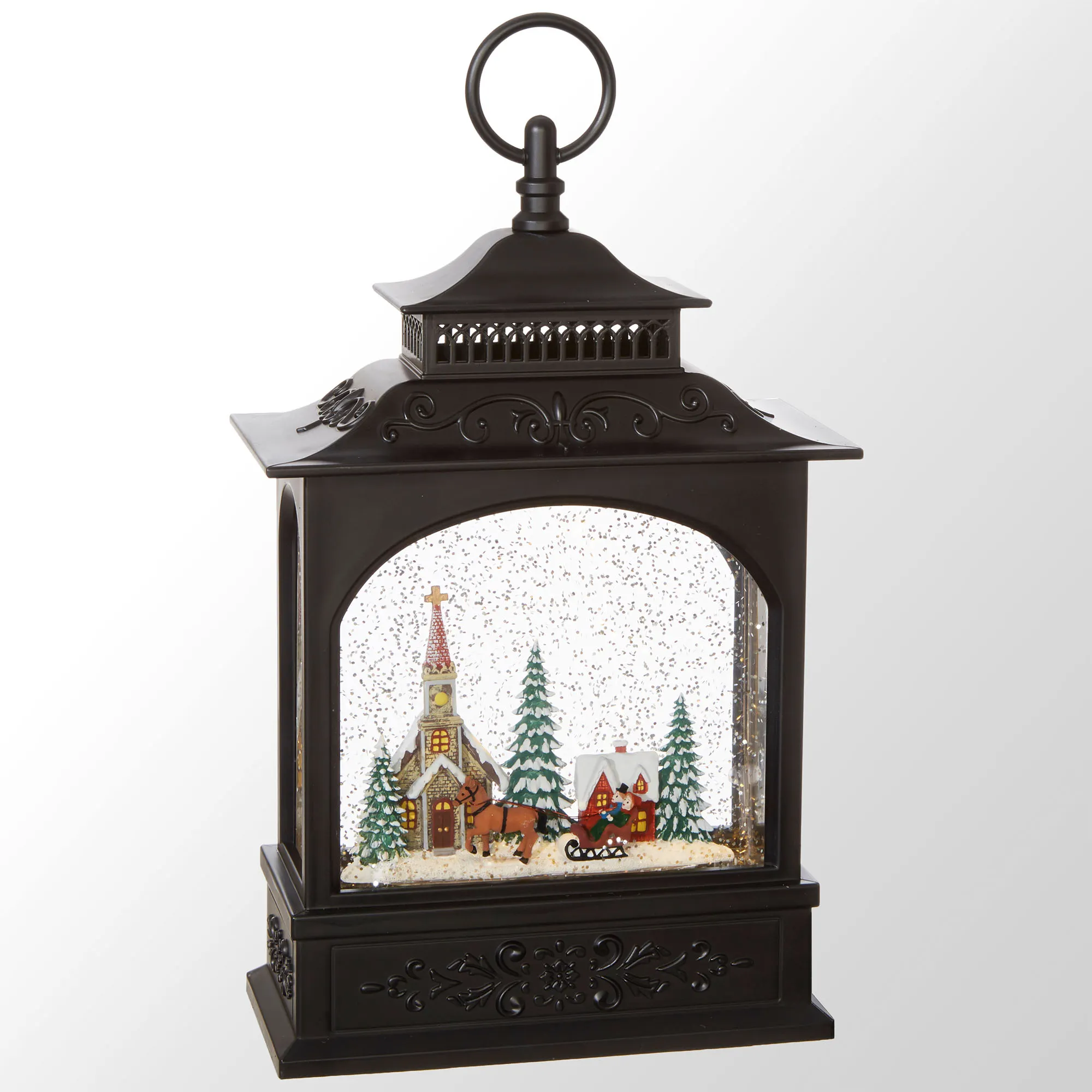Enjoy a Sleigh Ride this holiday season. This molded plastic swirl lantern has a liquid-filled center with a church, a house, trees, and a horse-drawn sleigh. Glitter swirls beautifully when the LED light shines brightly. Black lantern has ornate designs and plays "Jingle Bells," "We Wish You a Merry Christmas," "Silent Night," "Deck the Halls," "Joy to the World," "The First Noel," "Hark! The Herald Angels Sing," and "O Christmas Tree." Requires three of your C batteries or your USB power adapter; a USB cord is included. The on/off/six-hour timer switch is located on the bottom. Measures 7"Wx3.5"Dx12"H.