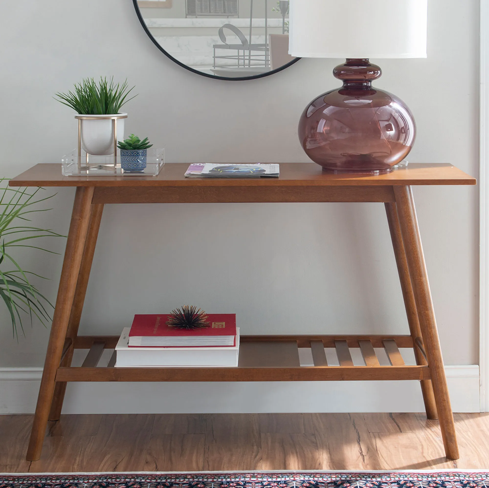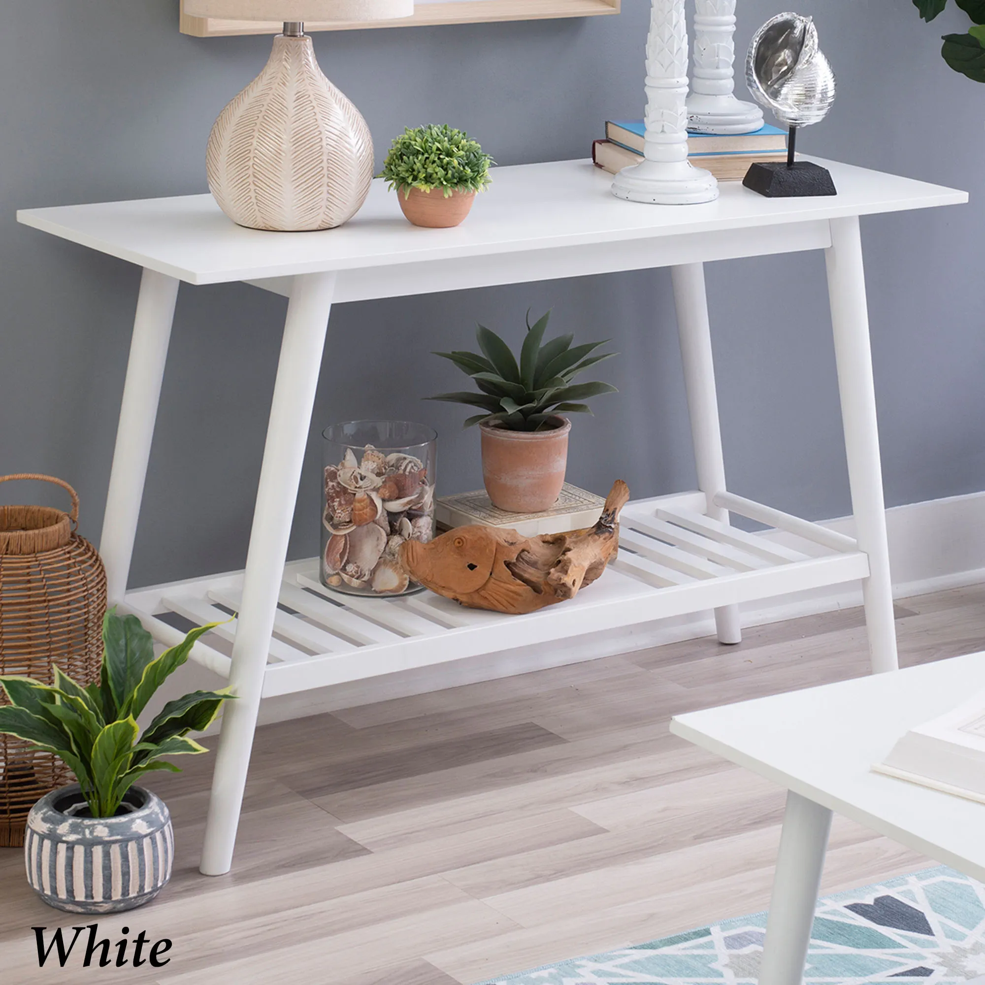 Complete a space with the chic simplicity of the Sloane Console Table. Finished in walnut or white, the wooden table features a mid-century modern style, a wide display top, angled tapered legs, and a slatted lower shelf. Overall, the console table measures 47"Wx18"Dx30"H and weighs approx. 30 lbs.