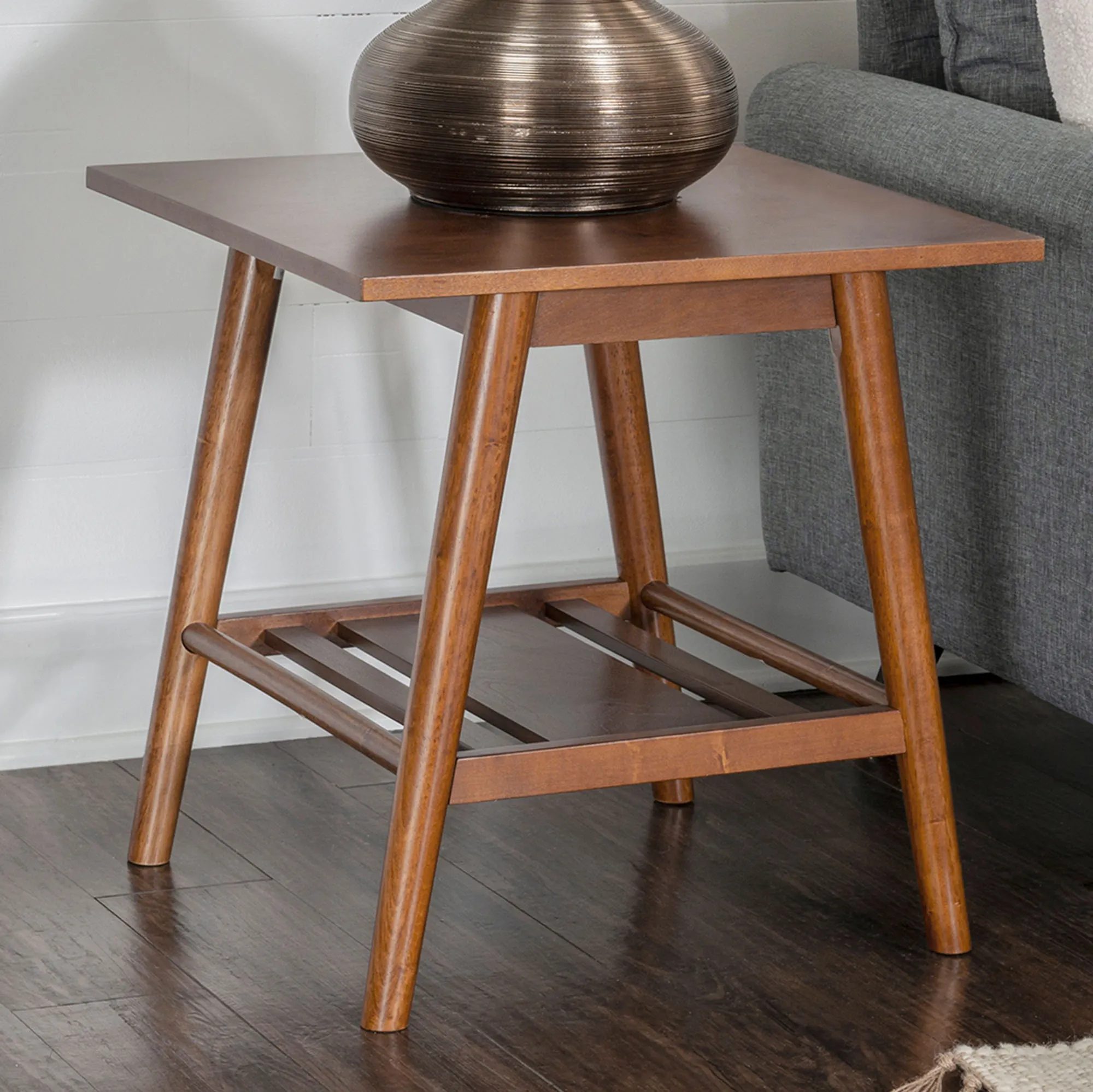Enjoy the mid-century modern style of the Sloane Side Table. This wooden table has an extended top surface, a partially slatted bottom shelf, and tapered legs. The weight capacity for the top is 50 lbs., and the weight capacity for the bottom is 20 lbs. Measures 22"sq.x22"H; weighs 21 lbs.
