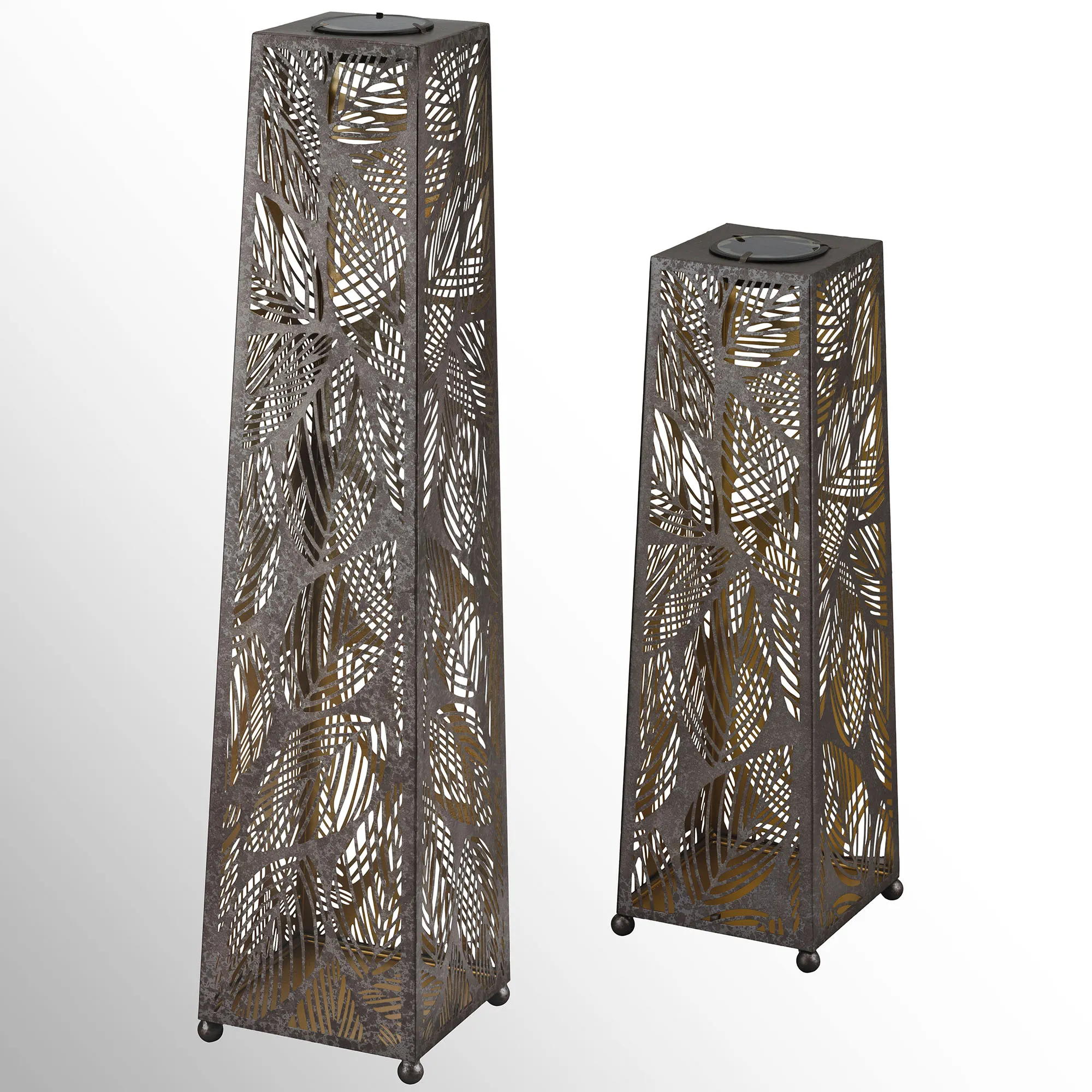 The Leaf Outdoor Solar Lantern celebrates nature's beauty into the nighttime. With a bronze and pewter exterior, the unique tapered metal lantern features a variety of openwork leaf silhouettes and a highly reflective metallic gold interior. The built-in solar-powered LED light at the top then creates 360 degrees of beautiful leafy projections across your tabletop surface or the ground for 6-8 continuous hours. Perfect for your patio, pool side, porch, or garden, the waterproof solar panels make the weather- and fade-resistant lantern a beautiful accent outdoors year round. Rechargeable battery is included. Small measures 8.5"sq.x24"H. Large measures 9"sq.x36"H.