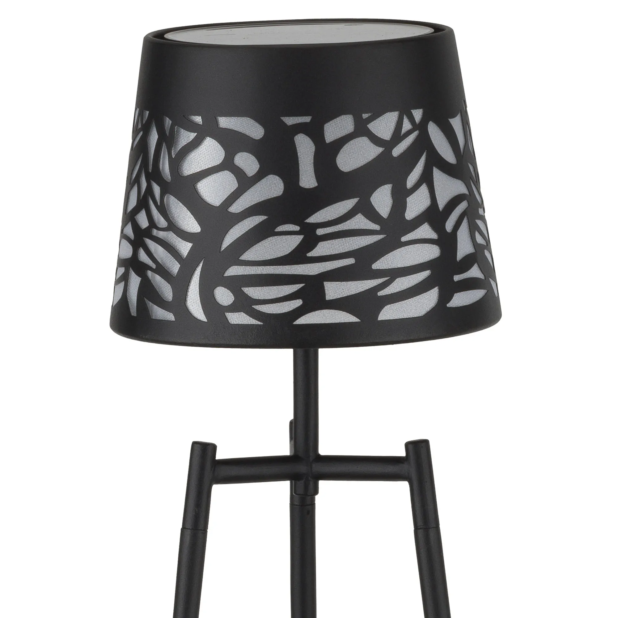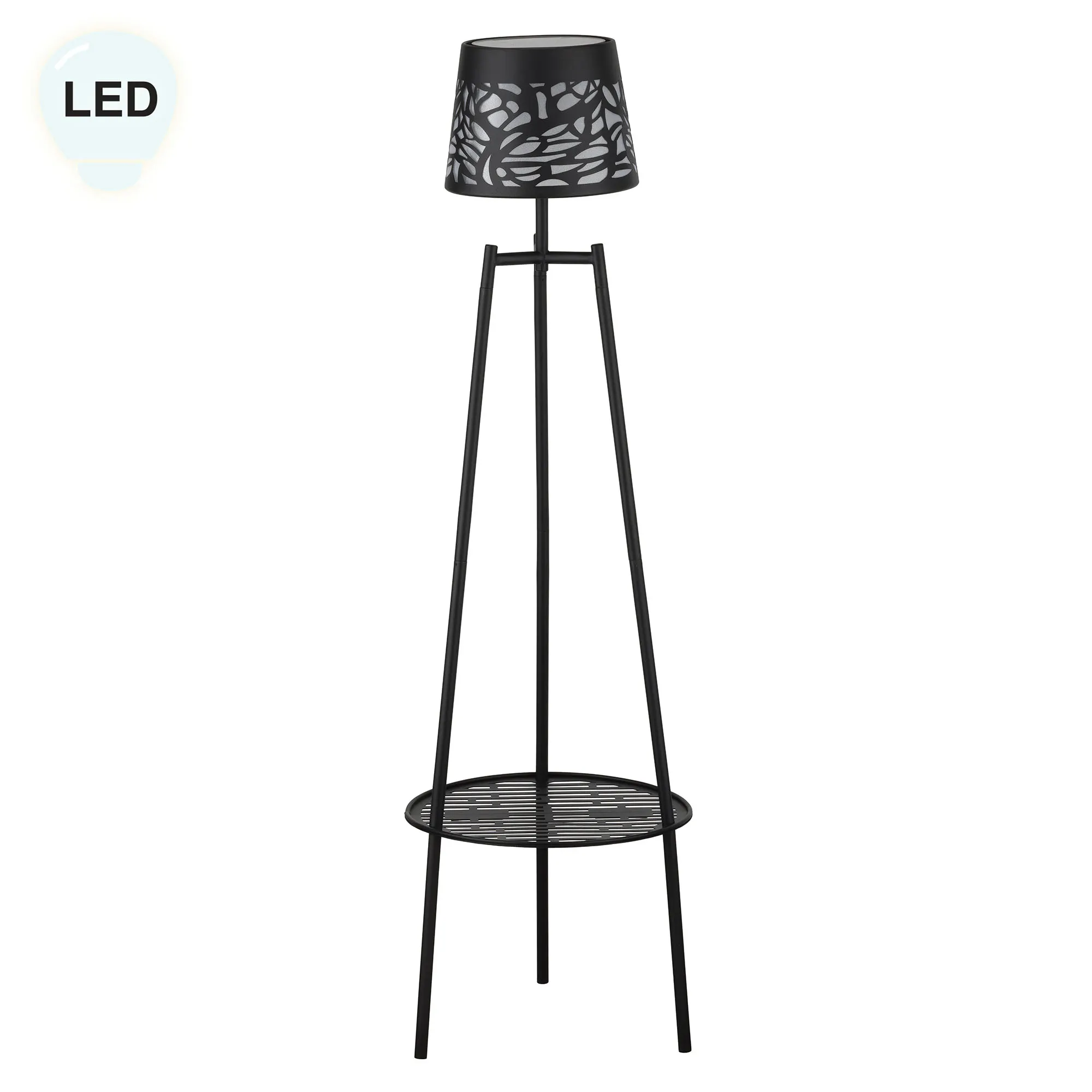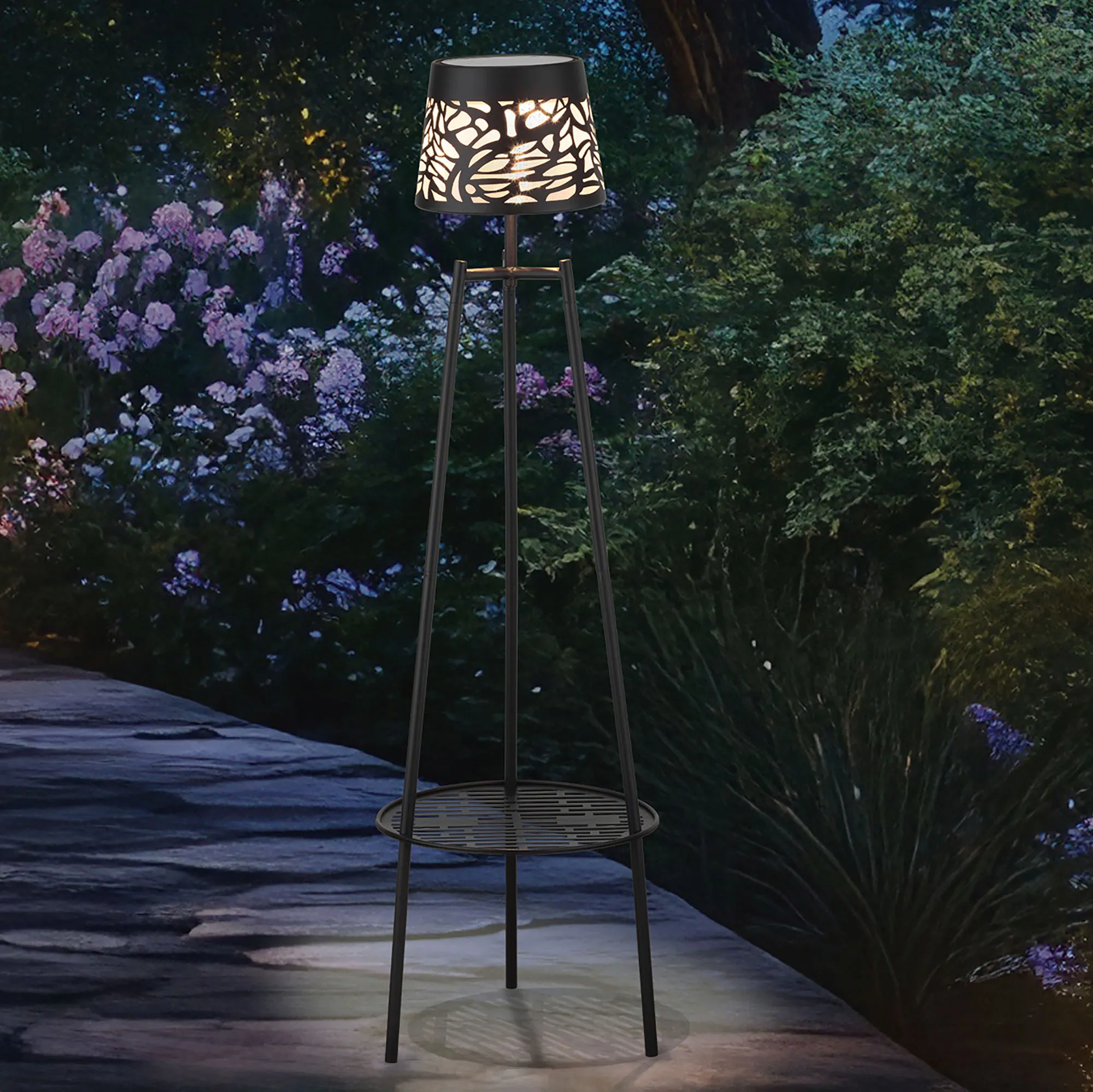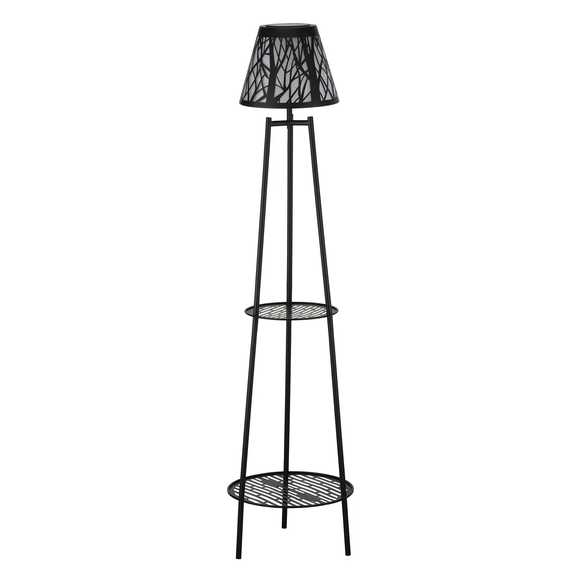 Transform your outside area into a true outdoor living space with an Outdoor Solar Floor Lamp. Finished in matte black, the round metal floor lamp features a tripod-style base that leads to a laser-cut metal shade patterned with tree branches. The built-in solar-powered LED light at the top then creates a beautiful glow through the acrylic panels and throughout your space for 6-8 continuous hours. Perfect for your patio, pool side, porch, or garden, the waterproof solar panels make the weather- and fade-resistant floor lamp a lovely accent outdoors year round. A rechargeable battery is included. The circular shelf has openwork slats for easy draining, making it perfect for plants or other decorative items. Small floor lamp measures 11"dia.x38"H overall.