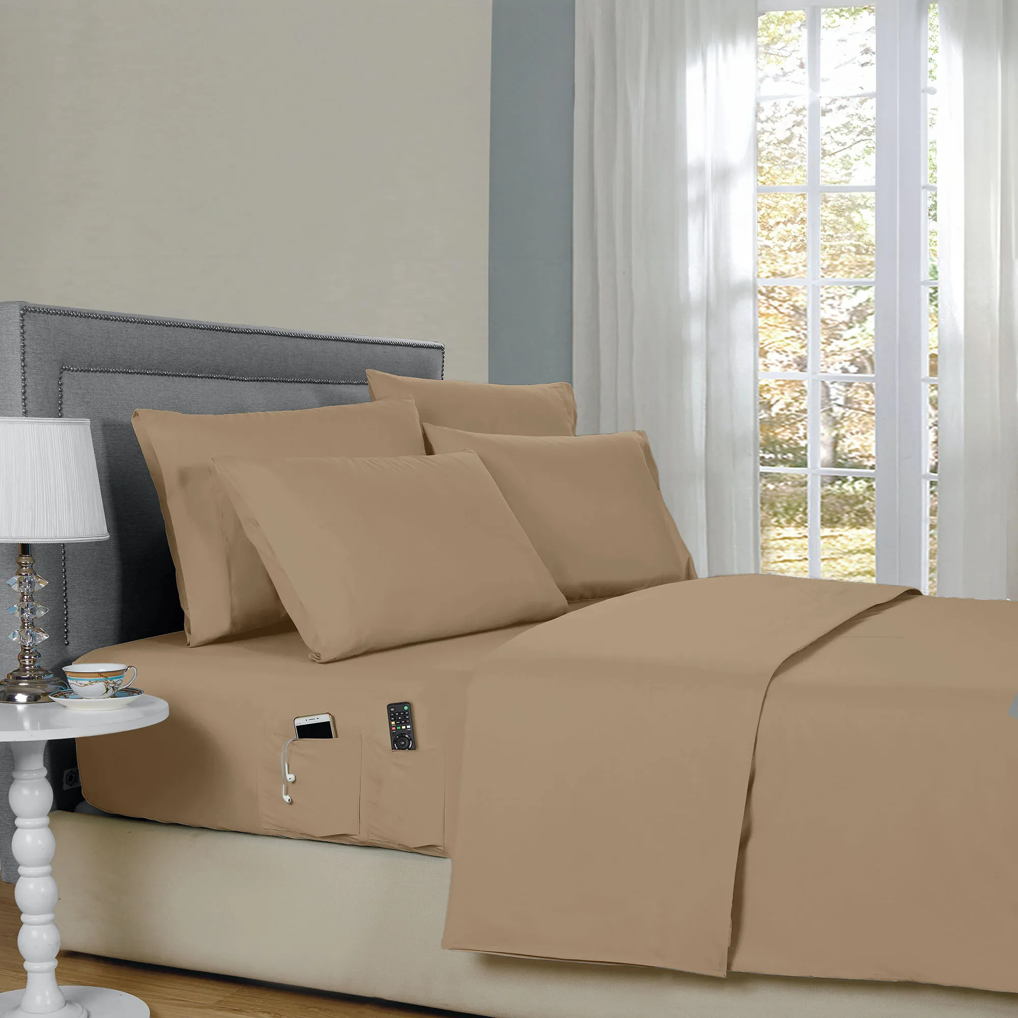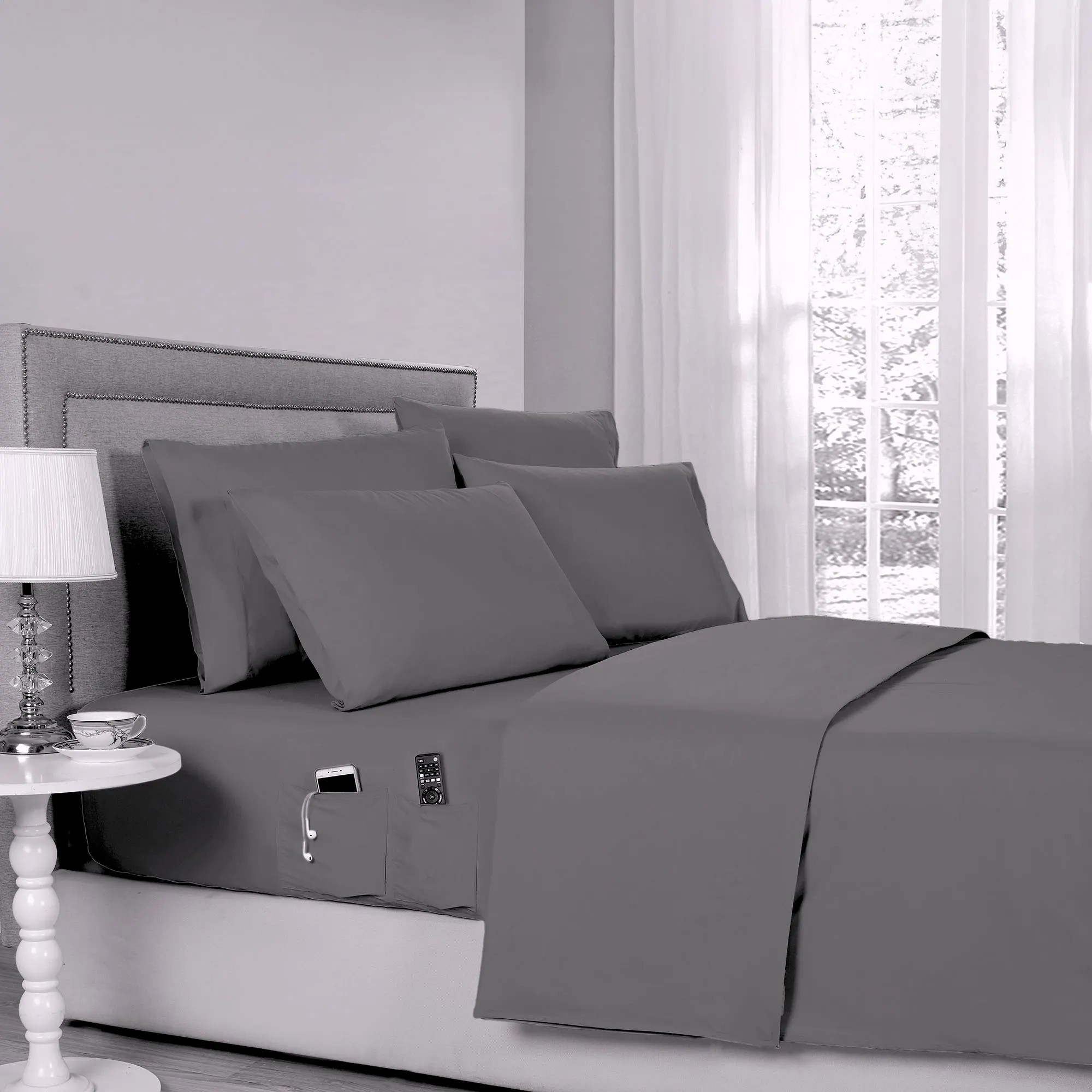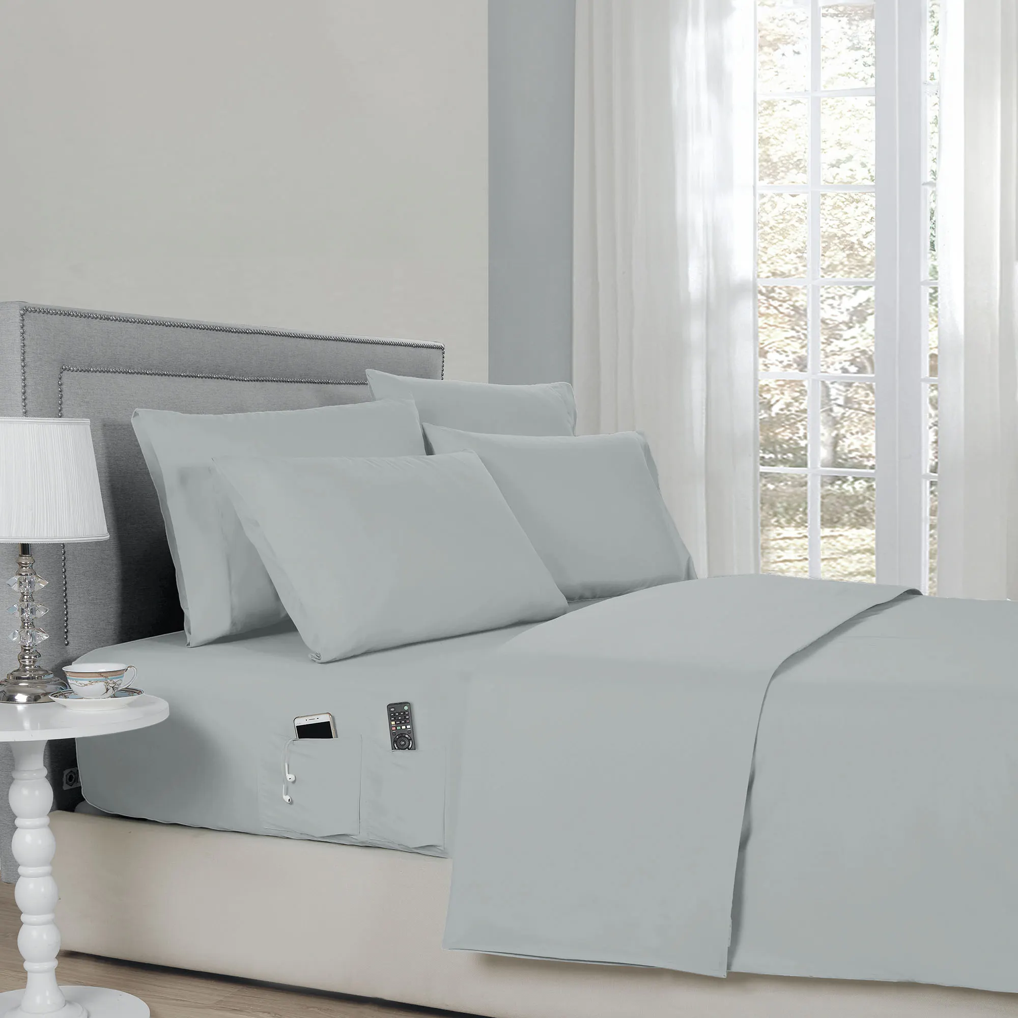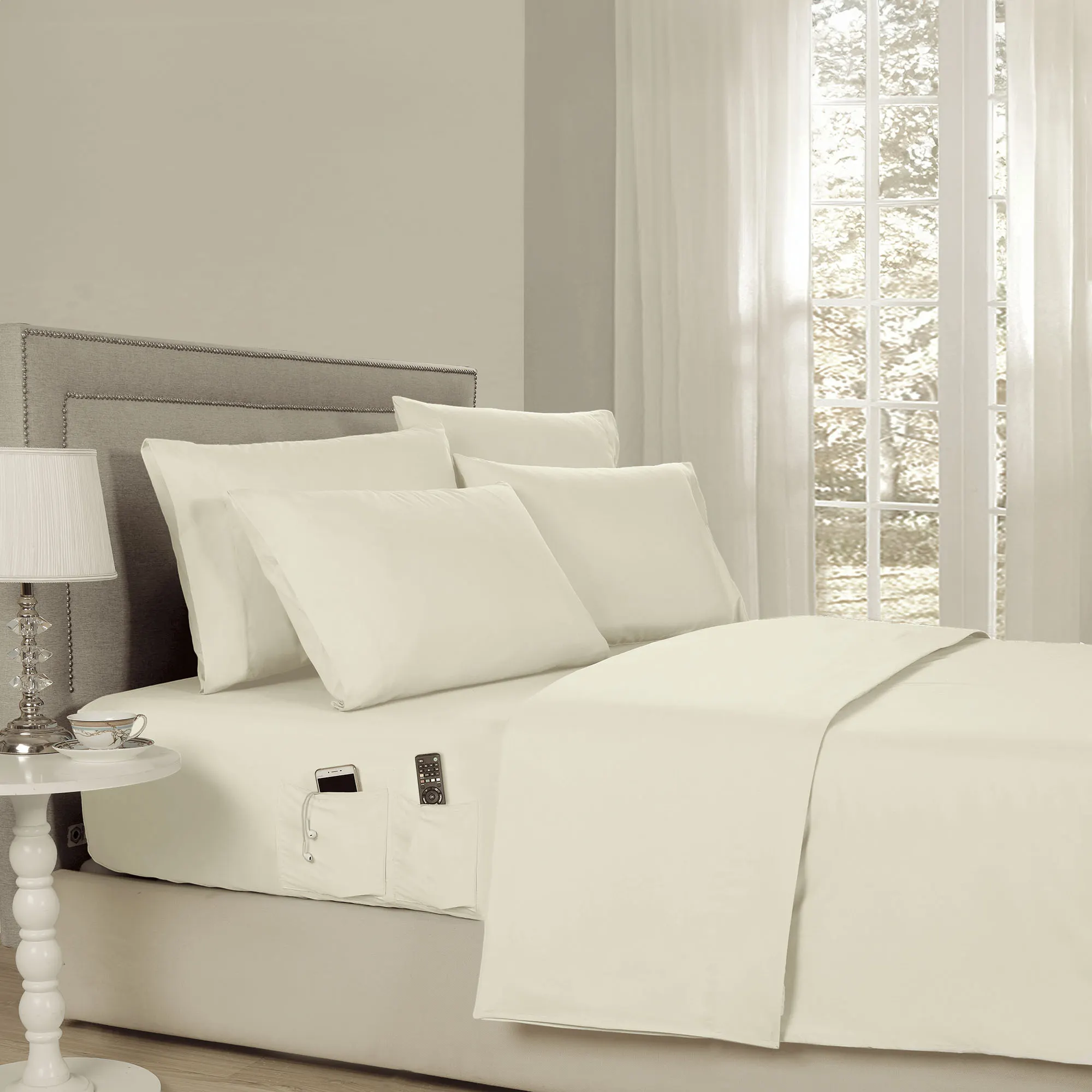 Relax in true comfort with the Smart Pocket Sheet Set. These hypoallergenic, wrinkle-resistant, polyester microfiber sheets, from Kathy Ireland Home(R), are a solid color with a 4" hem on the flat sheet and pillowcases. The pillowcases also have a French cuff to hold your pillow in place. The fitted sheet has elastic all around with 14" deep pockets to fit mattresses up to 16" deep. The fitted sheet also has two side pockets on each side that are 8" deep to fit personal items like cell phones, reading glasses, TV remotes, medication, or a water bottle when in bed. Sheet set includes a fitted sheet, a flat sheet, and four pillowcases (two in Twin and Twin XL). Specify Midnight Blue, Dark Gray, Fern, Ivory, Pastel Blue, Silver, Taupe, or White. Machine washable. Imported.