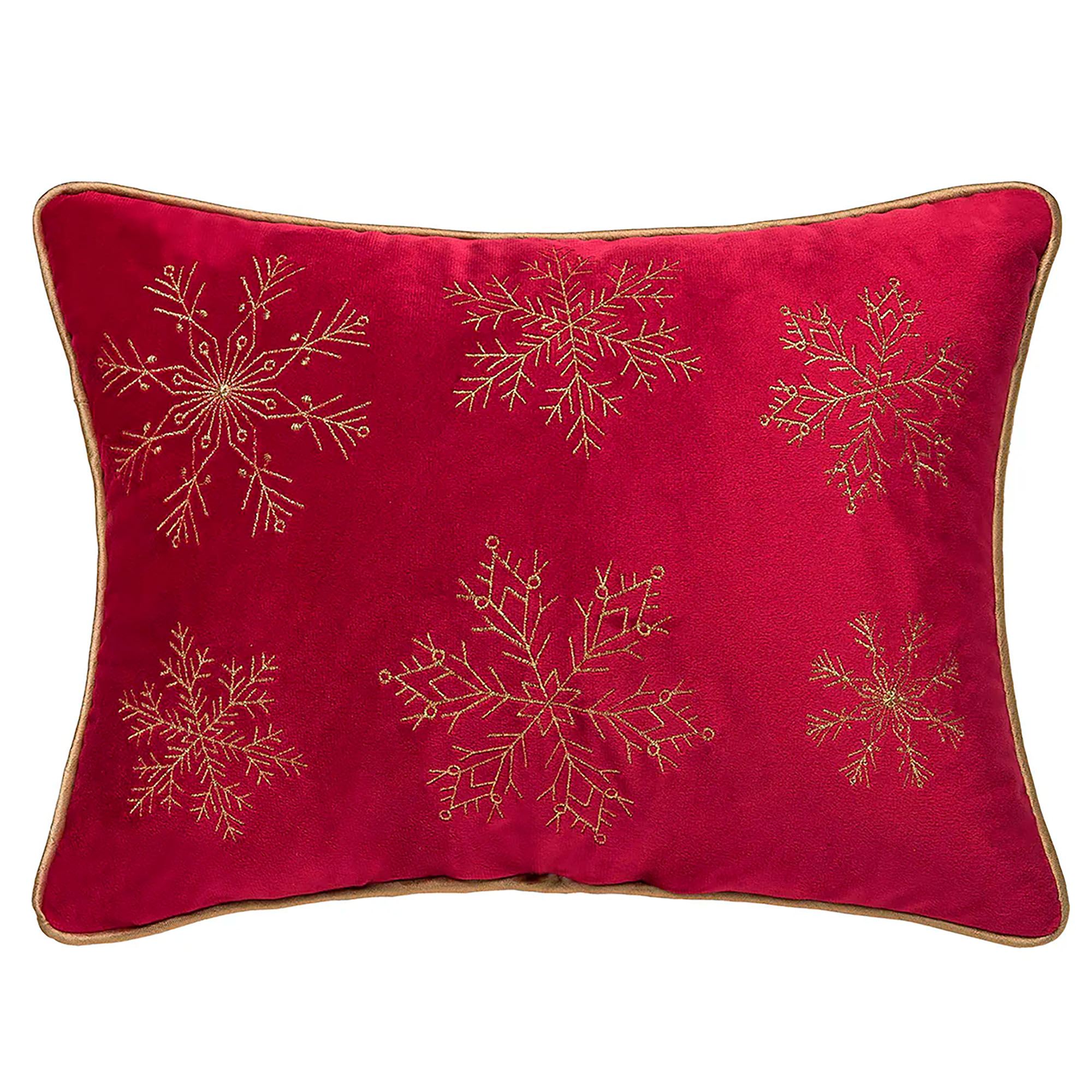 The Snowflakes Rectangle Pillow decorates any winter wonderland with elegance. This polyester pillow has intricate embroidered snowflake designs and piping in metallic gold on a red background. Measures 16"x12". Fill is polyester. Spot clean. Imported.