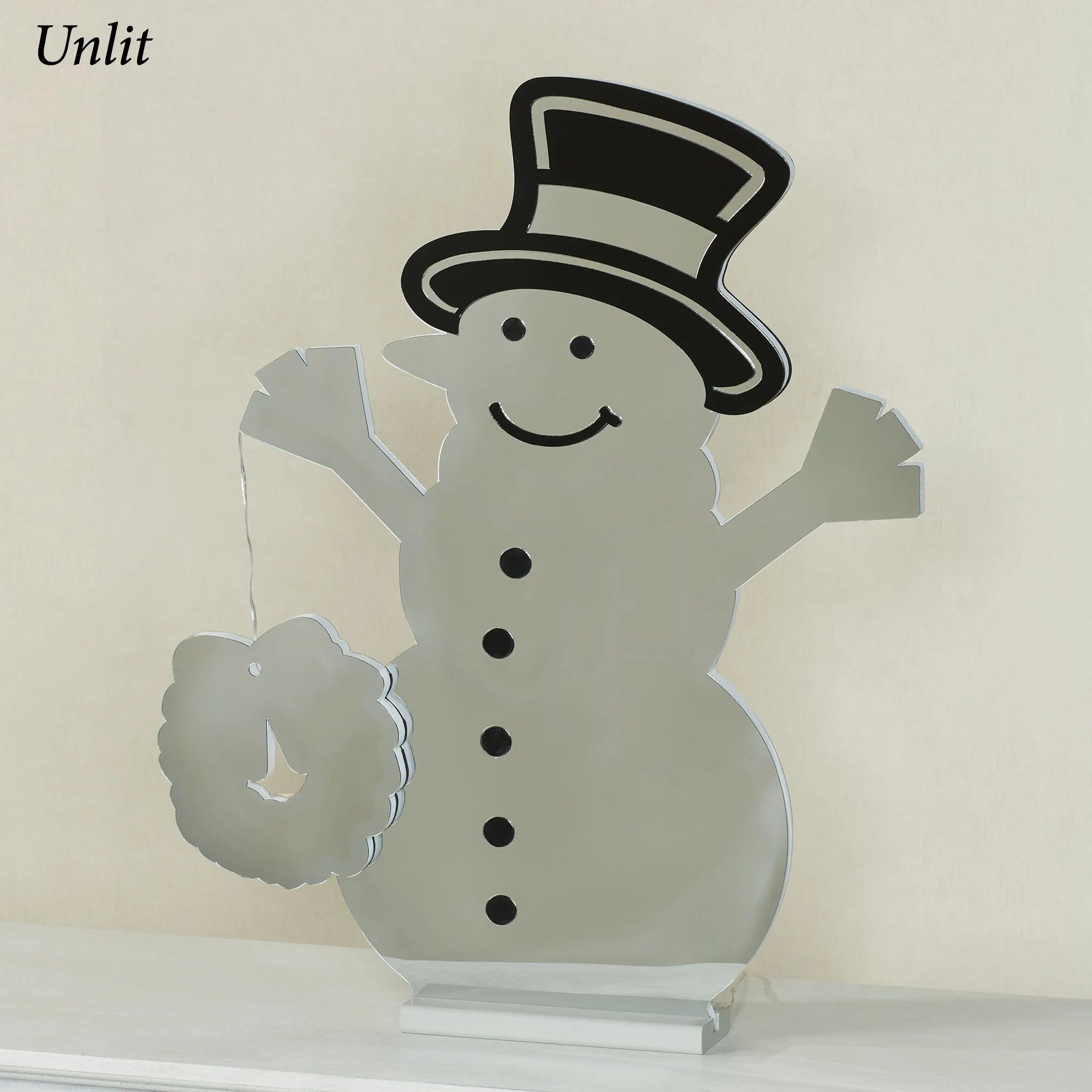 Nothing says winter wonder like the Snowman LED Infinity Light. Crafted from acrylic, the unique LED light resembles everyone's favorite frosty friend complete with a wreath, twig arms, scarf, carrot nose, smiling face, and black top hat. Snowman stands on a gray wooden base. UL listed. Indoor use only. Overall, the decorative holiday light measures 20.5"Wx.05"Dx24"H; base is 8"Wx2.5"D.