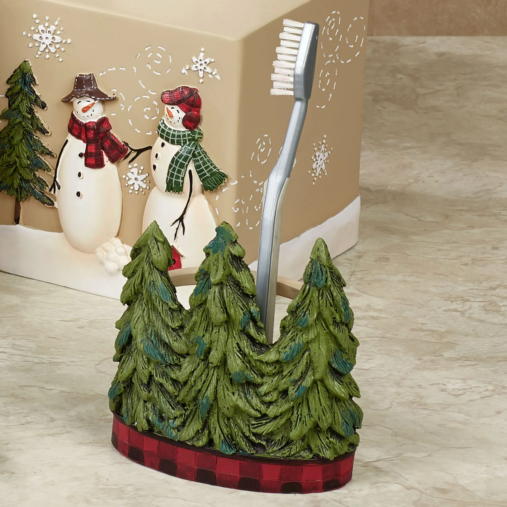 Always on the first snowfall of the season, the annual Snowmen Gathering promises a day of fun, friendship, and joy surrounded by winter's beauty. Invite this same frivolity to your daily routine with these charming bath accessories designed by (C)Linda Spivey. With dimensional handpainted designs, each natural-colored resin accent features white snowflakes, snowmen, and pine tree motifs, except the lotion/soap dispenser, toothbrush holder, and soap dish. Lotion/soap dispenser resembles an adorable snowman. Toothbrush holder features three pine trees and plaid trim. Soap dish contains the snowman and plaid trim. Specify Toothbrush Holder or Wastebasket.