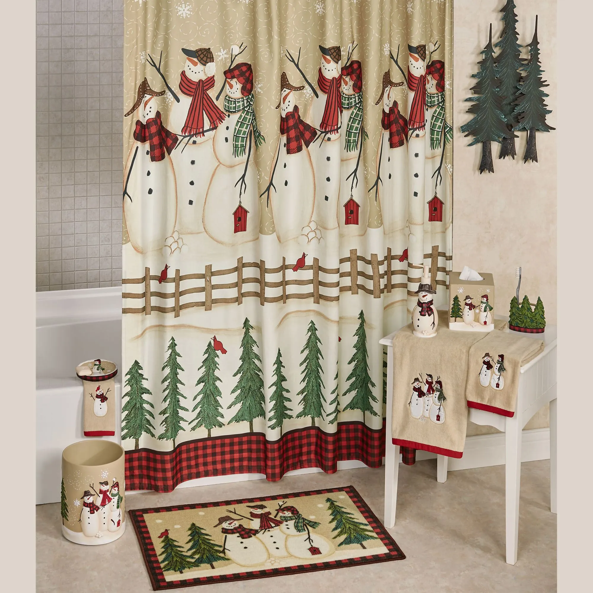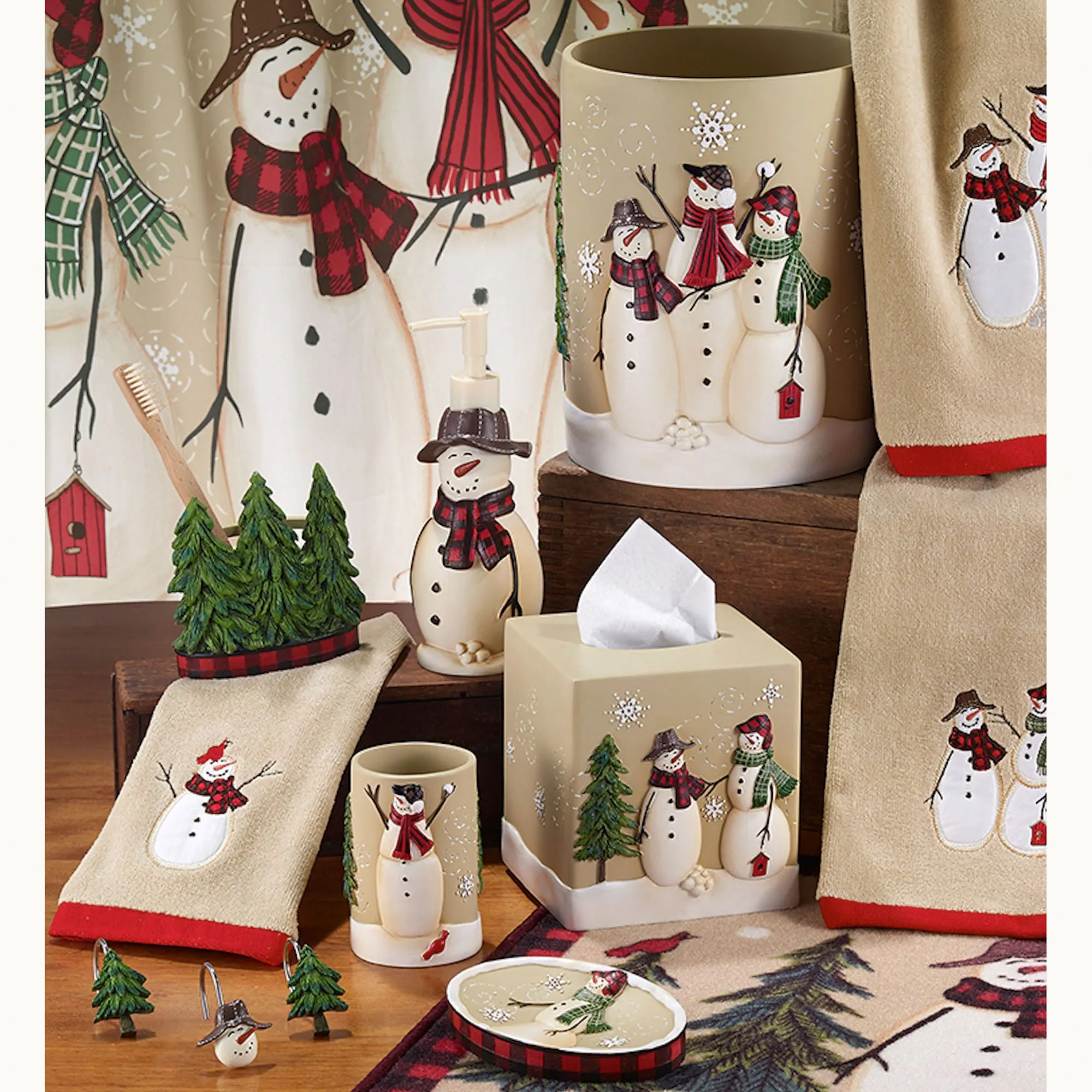 Always on the first snowfall of the season, the annual Snowmen Gathering promises a day of fun, friendship, and joy surrounded by winter's beauty. Invite this same frivolity to your daily routine with these charming bath accessories designed by (C)Linda Spivey. With dimensional handpainted designs, each natural-colored resin accent features white snowflakes, snowmen, and pine tree motifs, except the lotion/soap dispenser, toothbrush holder, and soap dish. Lotion/soap dispenser resembles an adorable snowman. Toothbrush holder features three pine trees and plaid trim. Soap dish contains the snowman and plaid trim. Specify Toothbrush Holder or Wastebasket.