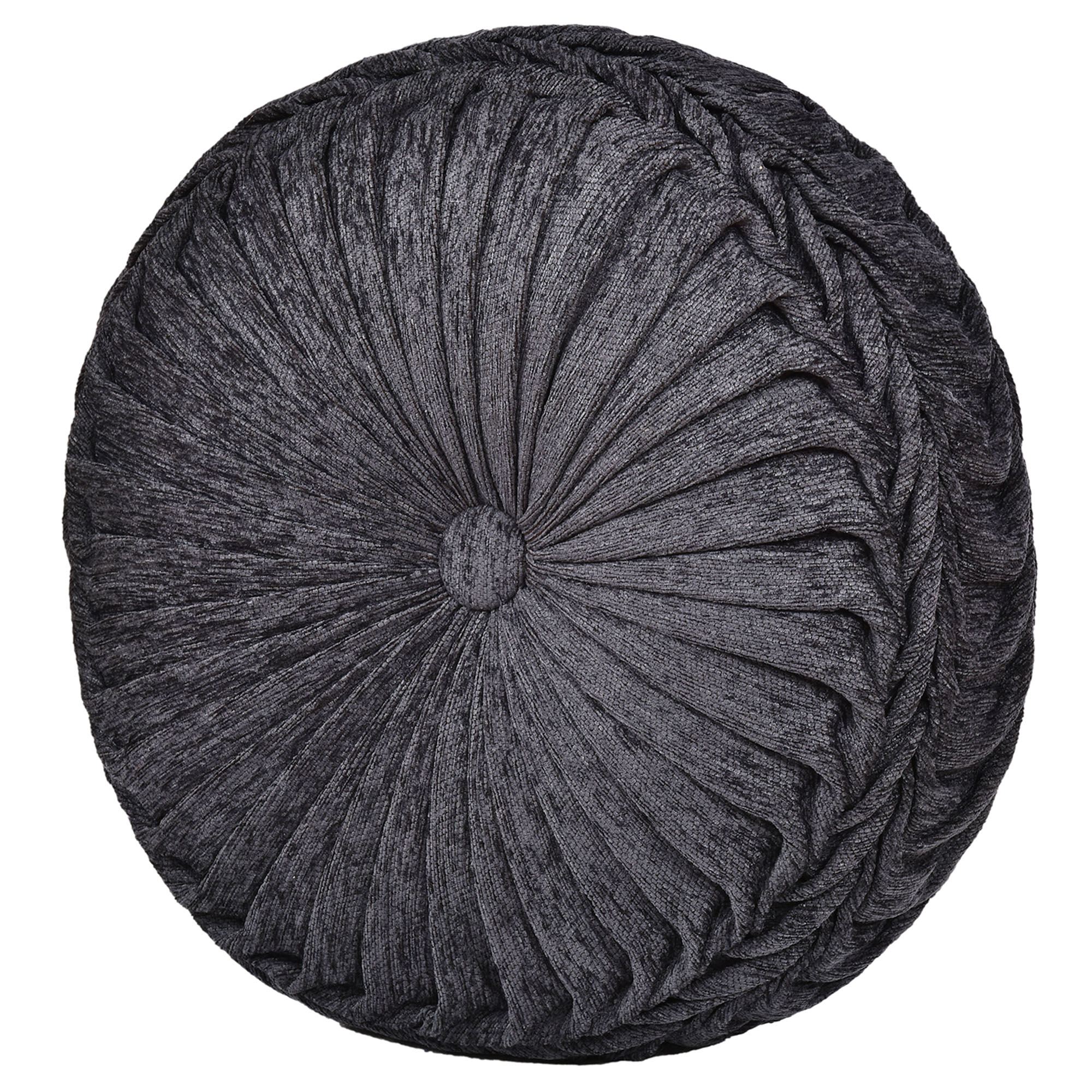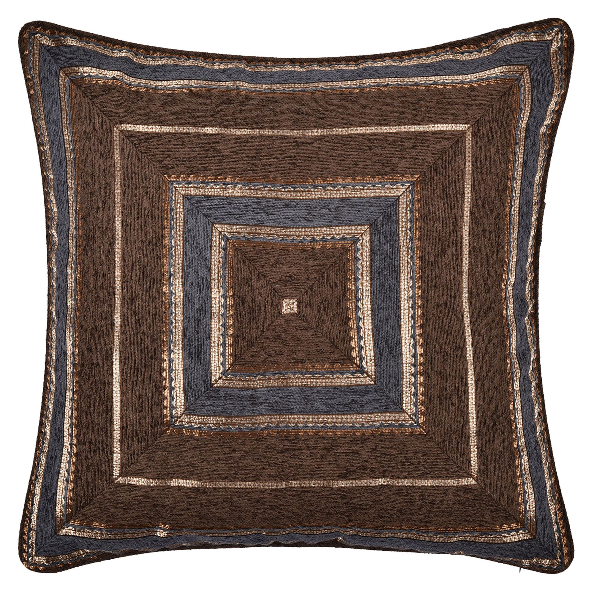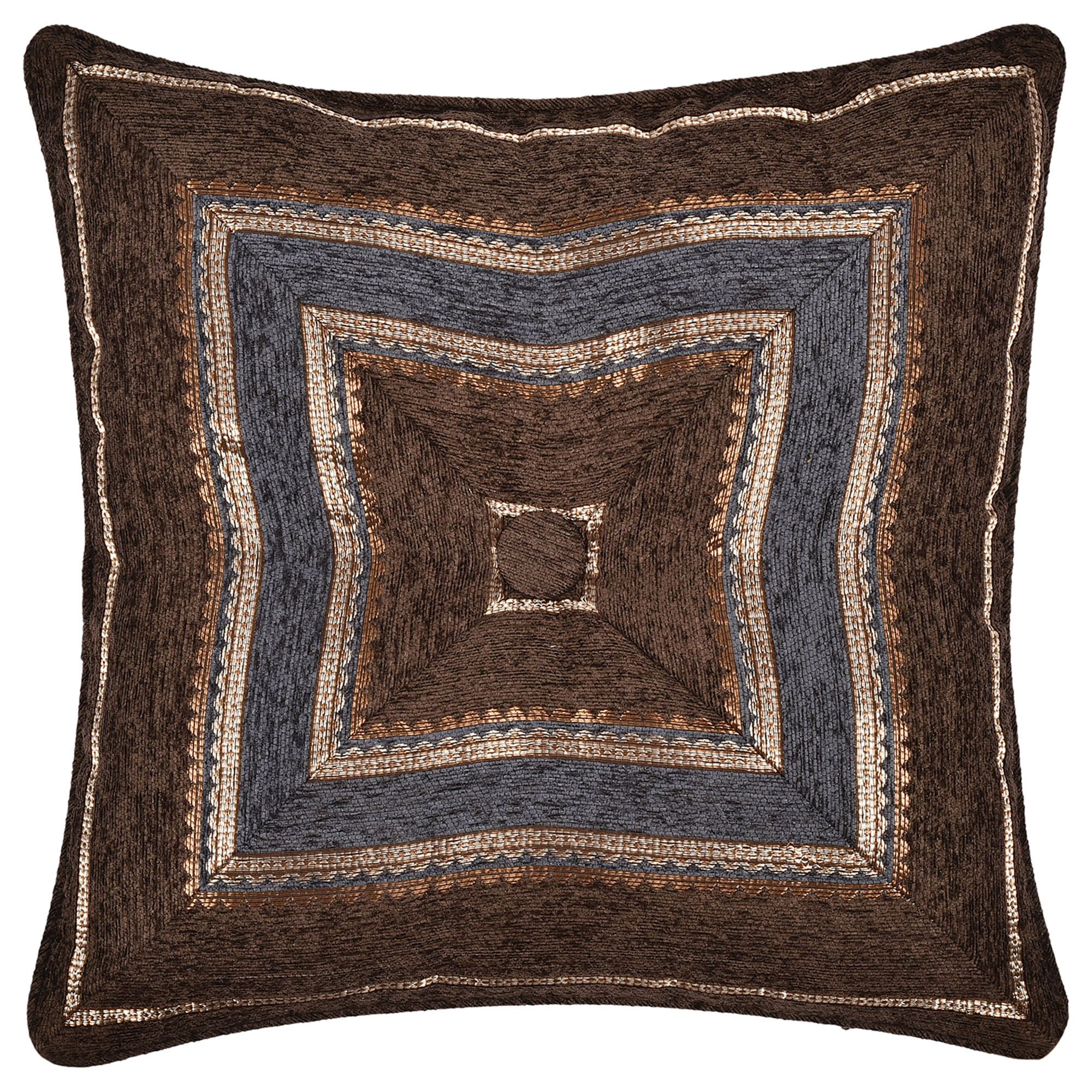 Pillows: Spot clean. The mitred 18" Square has chenille stripes, a central button tuft, and piped ends; backing is chocolate chenille. The 20" Square has woven damask designs encased with chenille accents and piped ends; reverses to woven chenille stripes. The Accent Rectangle has damask and chenille stripe designs with ball tassel trim on the length ends; reverses to woven chenille stripes. The Jumbo Rectangle has chenille stripes, piped ends, a 2.5" side gusset, and a chocolate chenille backing. The reversible, handmade blue Round is shirred chenille with a central button tuft and a 3" side gusset.
