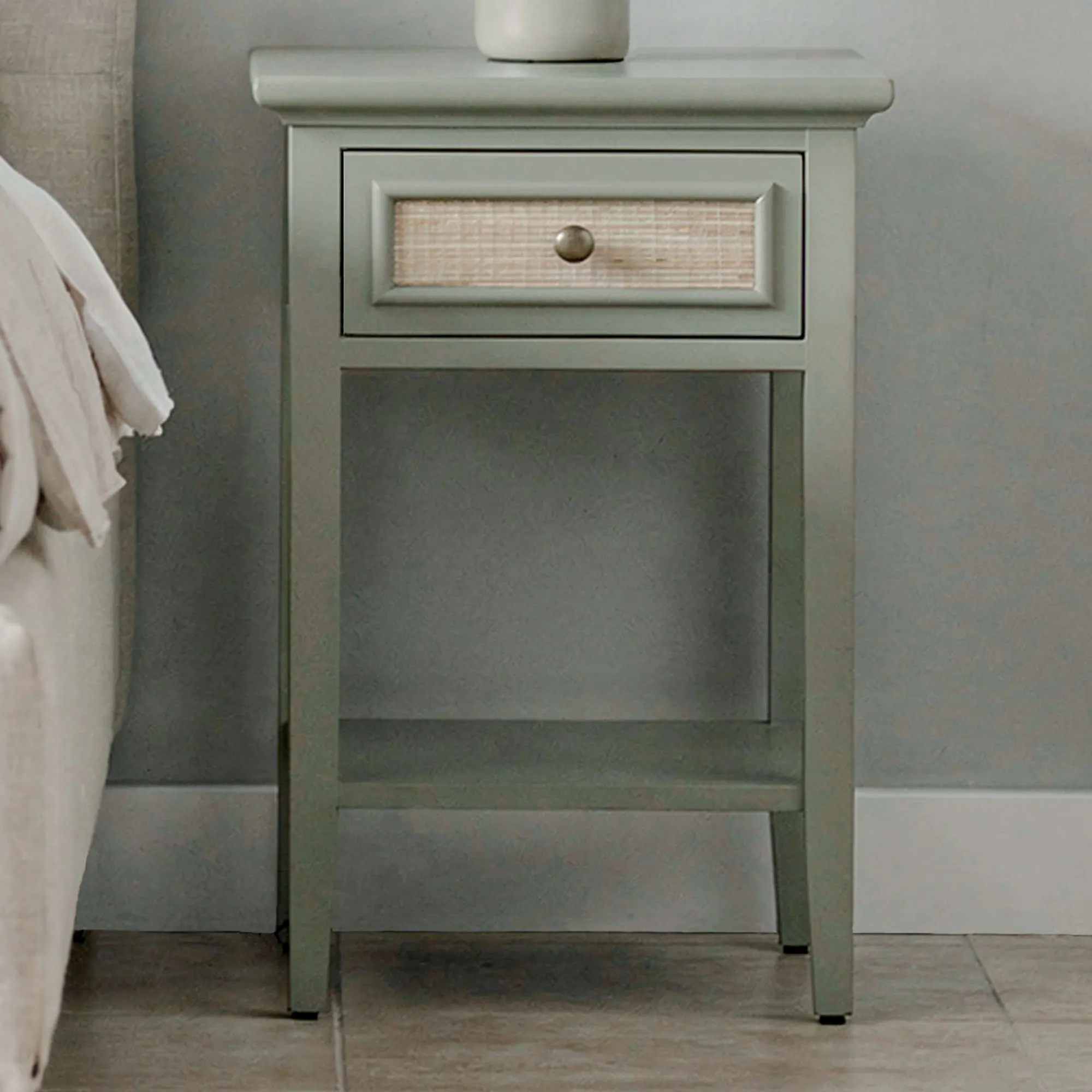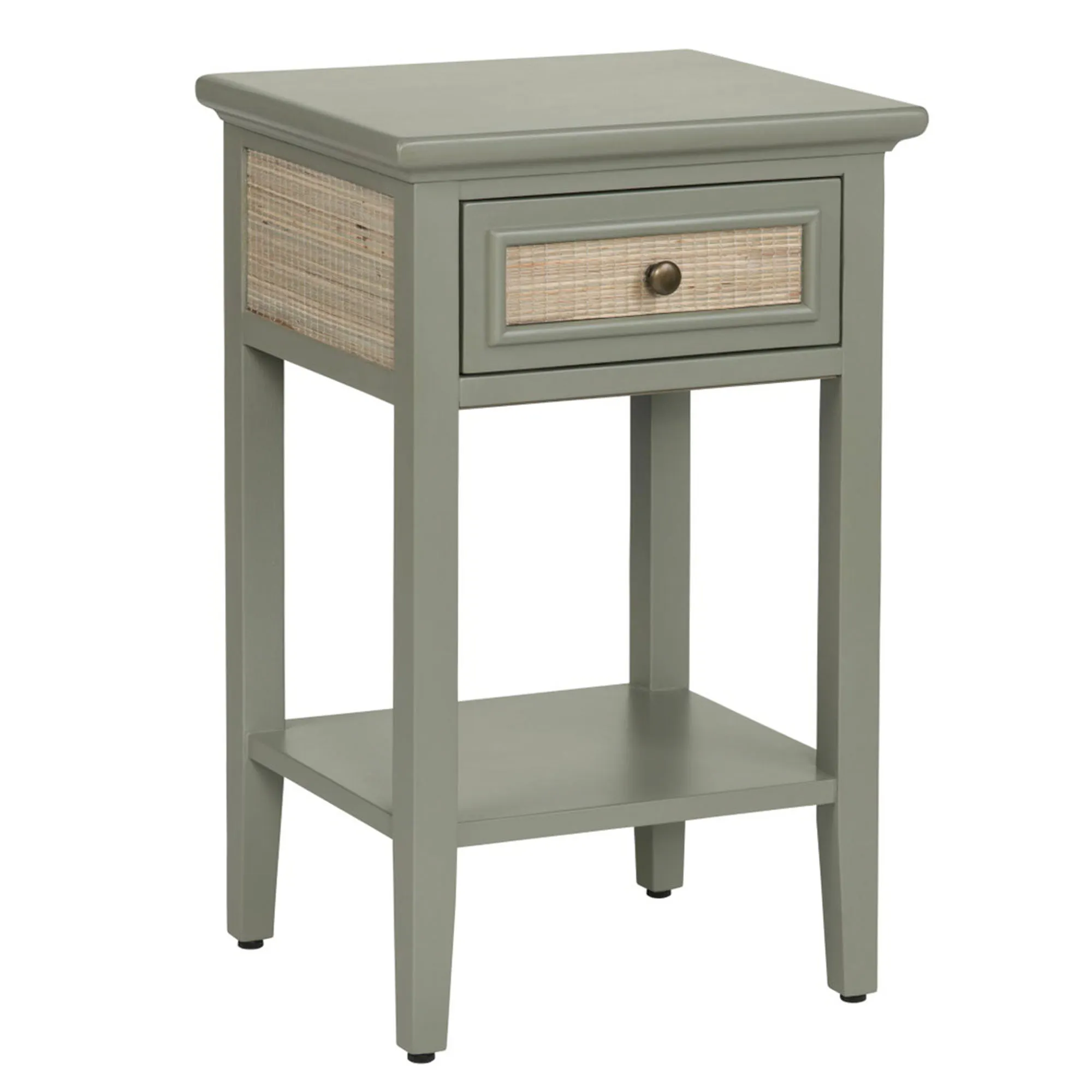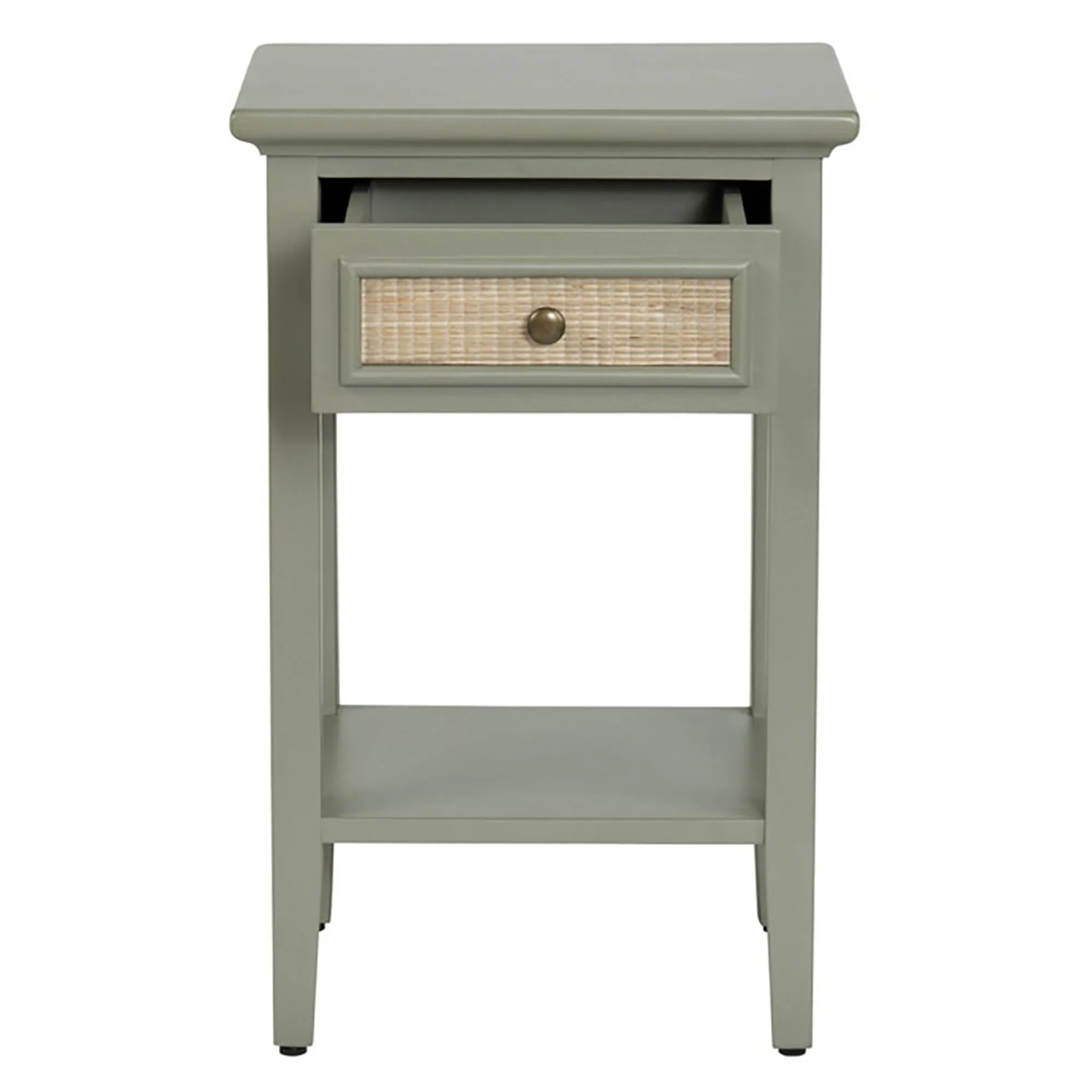 A charming hue and unique texture style the Solace Accent Table with a chic, natural allure. In a compact size, the wooden accent table features a painted green finish, sleek straight lines, a lower display shelf, and a tan rattan-inspired texture adorning the drawer front and sides. A dark brown round metal drawer pull helps to provide easy access and storage inside the pull-out drawer. Perfect for smaller spaces, the end table measures 14"Wx17"Dx26.5"H and weighs approx. 20 lbs.