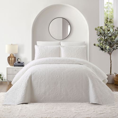A Solid Stitch medallion design accentuates this bedding with subtle charm. The Bedspread Set includes a bedspread and two shams. This lightweight, solid white polyester bedding, from the Modern Heirloom Collection(R), features intricately stitched scrolling motifs and frames and adds just the right amount of warmth for comfort all year long. The bedspread has bound ends and is reversible. Fill is polyester. Machine washable. Imported.