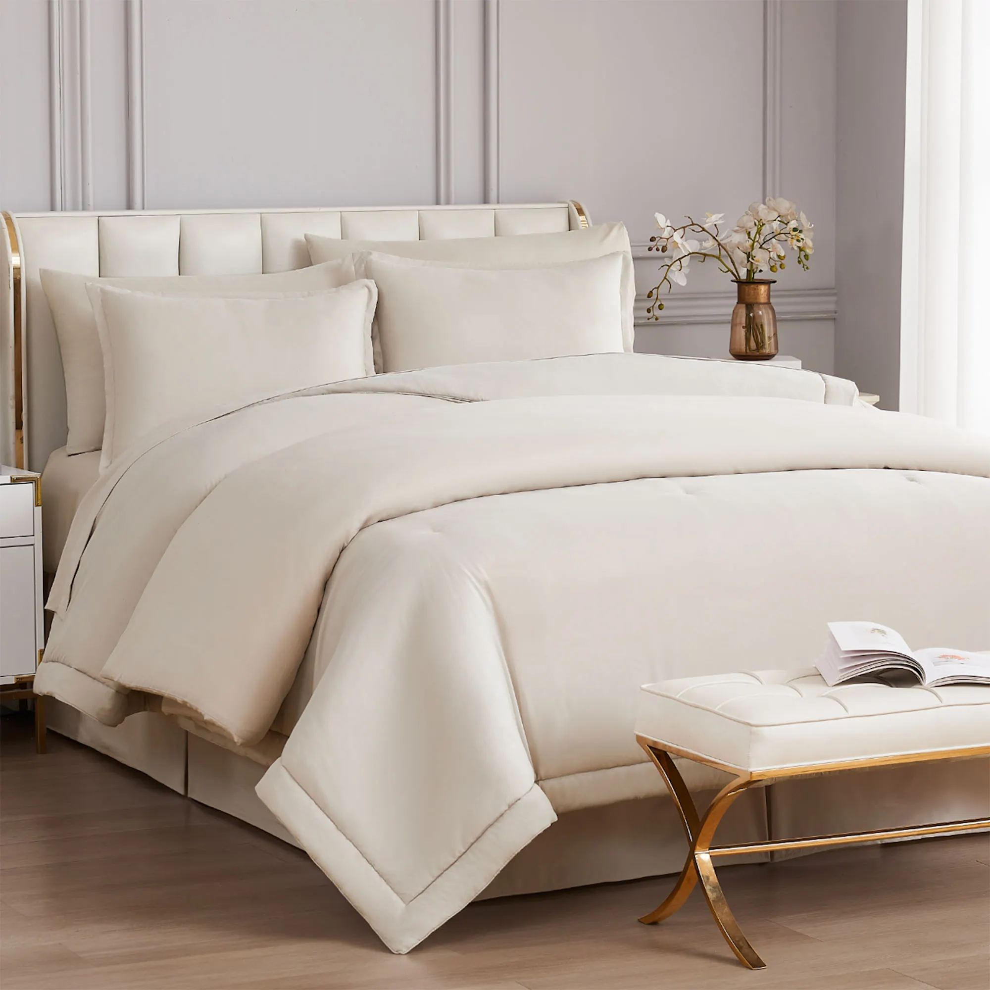 Luxuriate in Solitude, surrounded by a solid beige soothing hue, with this ensemble from Sherry Kline. Perfect for any season, the polyester microfiber bedding features an exceptional quality and lightweight, warm design for year-round use. Meticulously handcrafted in the USA, the comforter and sham(s) are finished with classic flanged edges.