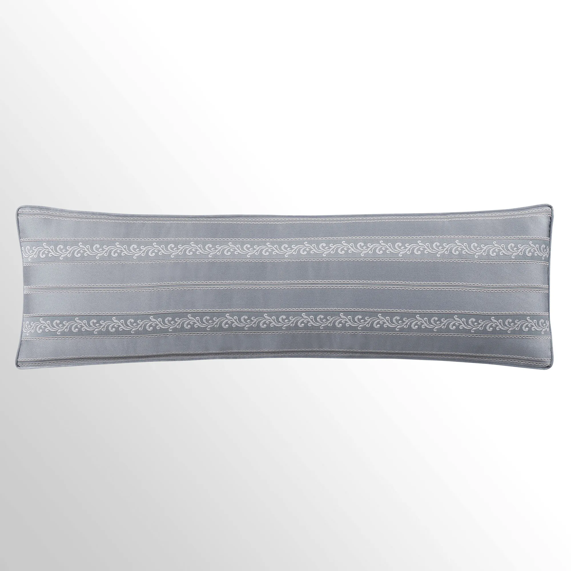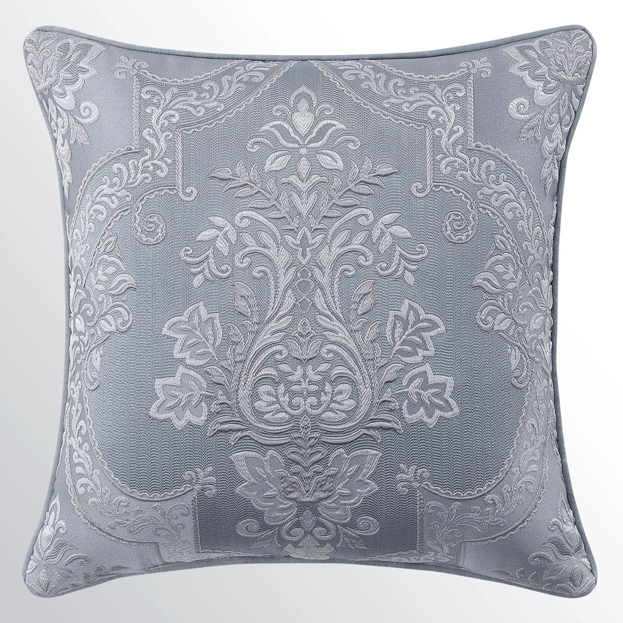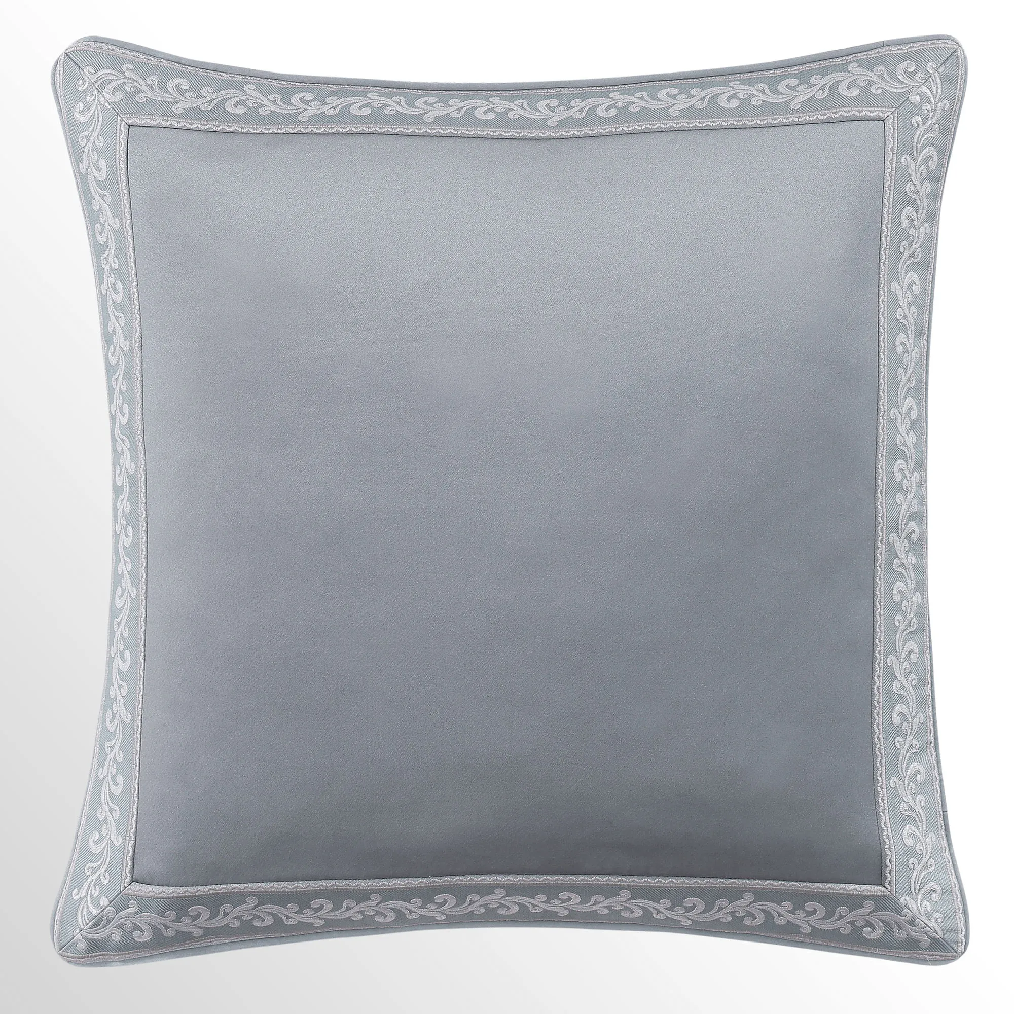 Piped European Sham has a herringbone-textured powder blue center pieced with a mitred leafy scroll frame; reverses to powder blue foulards; zipper closure.