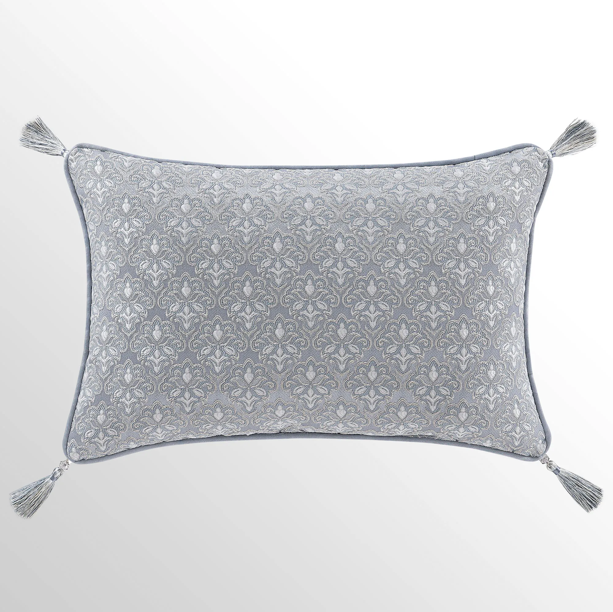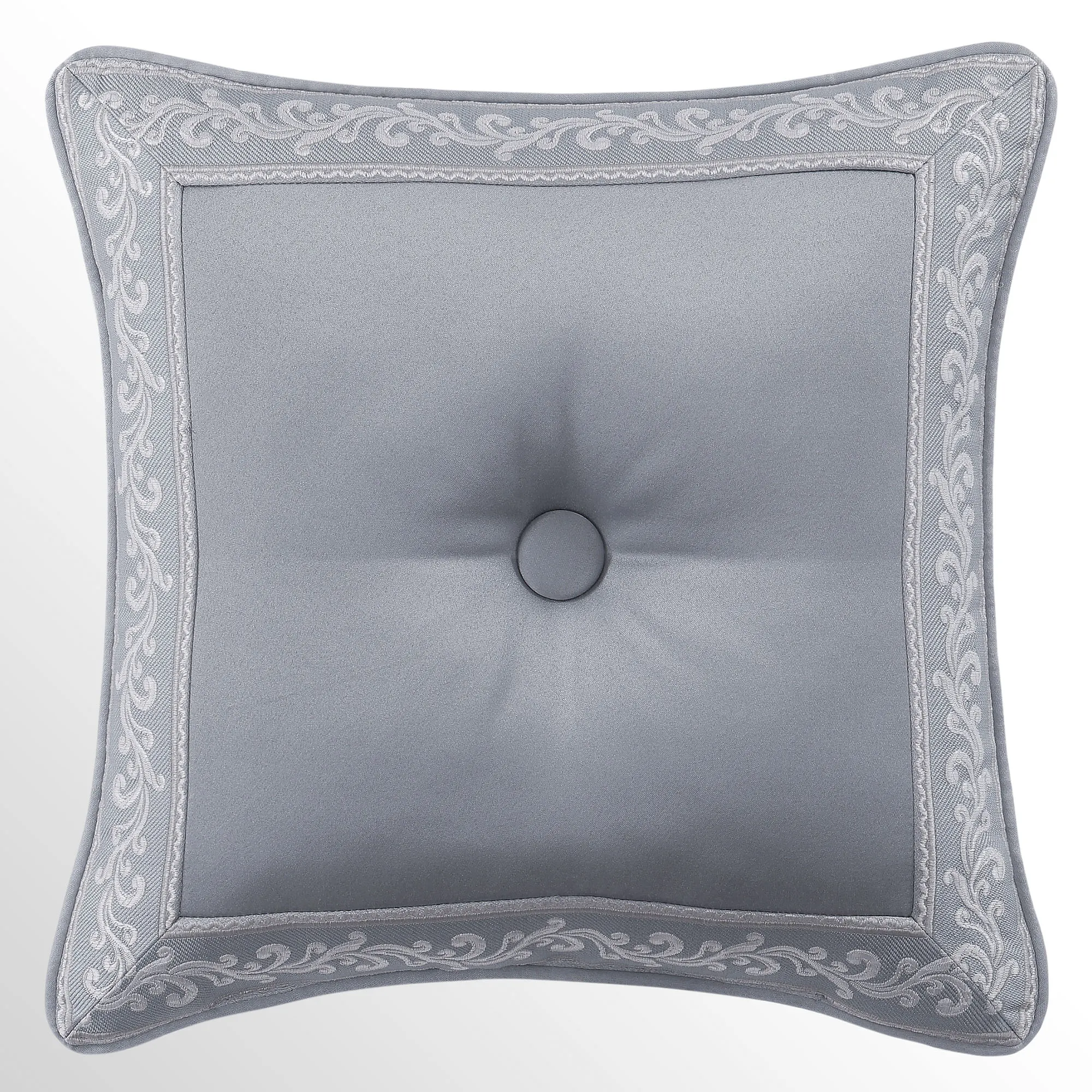 Pillows have piped edges, except the Round. Spot clean. The Tufted Square is powder blue with a center button tuft and a leaf scroll trim frame. The reversible Piped Square has damask; reverses to alternating leafy scroll trim and solid bands. The Embroidered Square features embroidered quatrefoils with leaf and damask accents. The Tasseled Rectangle has foulards and corner tassels with crystal beads. The Jumbo Rectangle has alternating leafy scroll trim and solid bands, a 2.5" side gusset, and a foulard reverse. The reversible, handmade Round is pleated powder blue with a button-tuft center and a 3" side gusset.