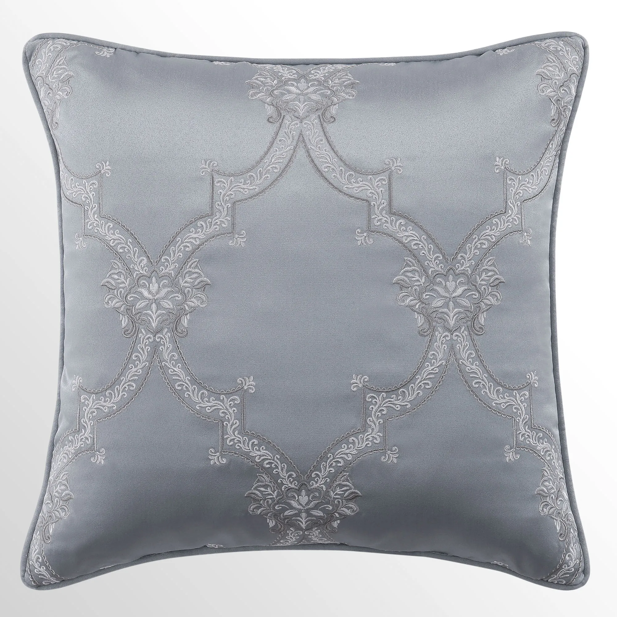Luxuriate in the lavish allure of the Sondra Bedding. From J. Queen New York, the jacquard-woven polyester ensemble features timeless damask encased in quatrefoils on smooth and intricate herringbone-textured grounds. Leafy scrollwork trim creates exquisite borders for the quatrefoils as well as embellishing other elements in a grand design. Hues of powder blue envelop the ensemble in a soothing tone.