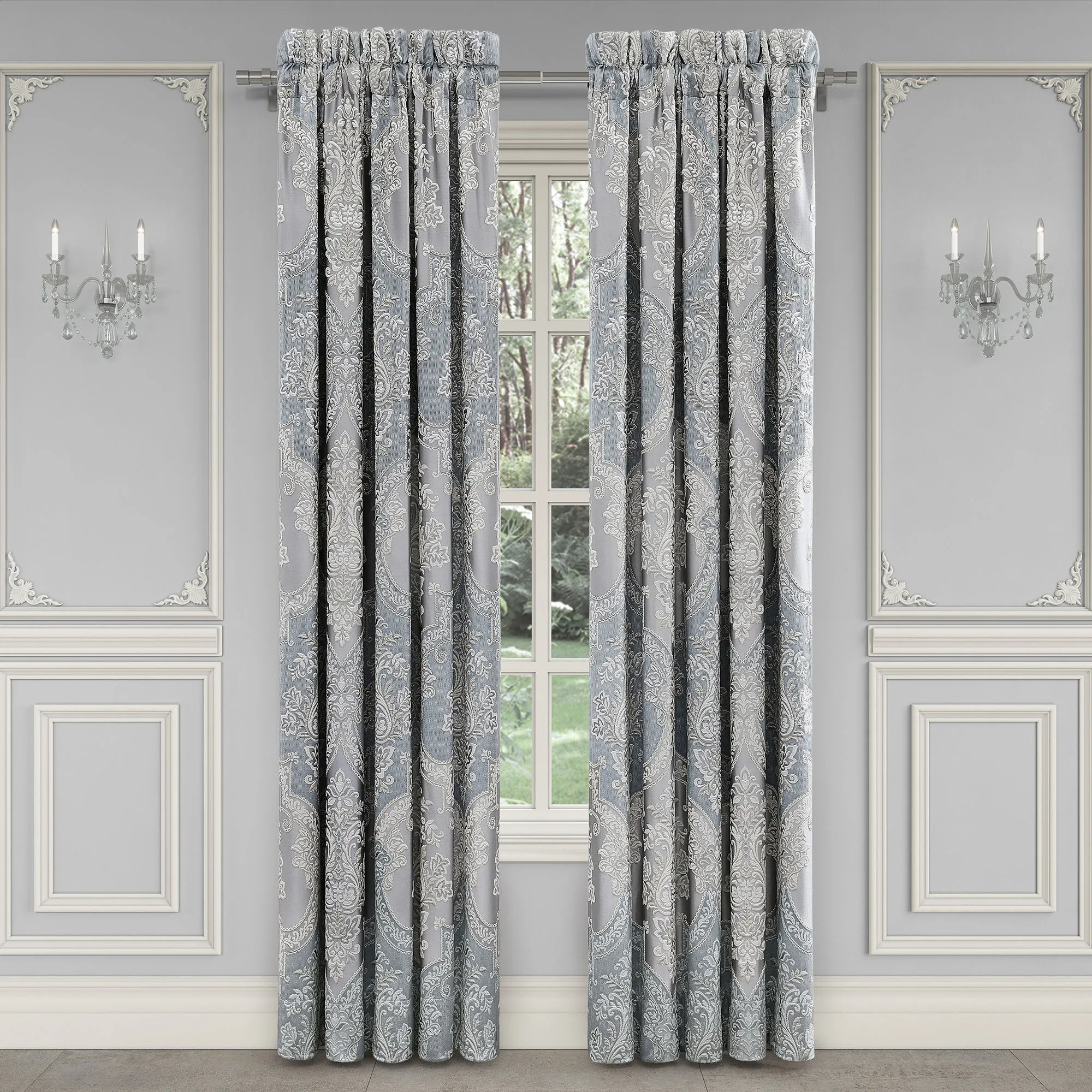 Lined Window Treatments have damask. Wide Curtain Pair has tailored edges, hangs via a 3" rod pocket, and includes tiebacks. Curtains are available in two lengths. Each Waterfall Valance has a pleated bottom edge and a 3.25" rod pocket. We recommend one valance for every 12"-15" of window width.