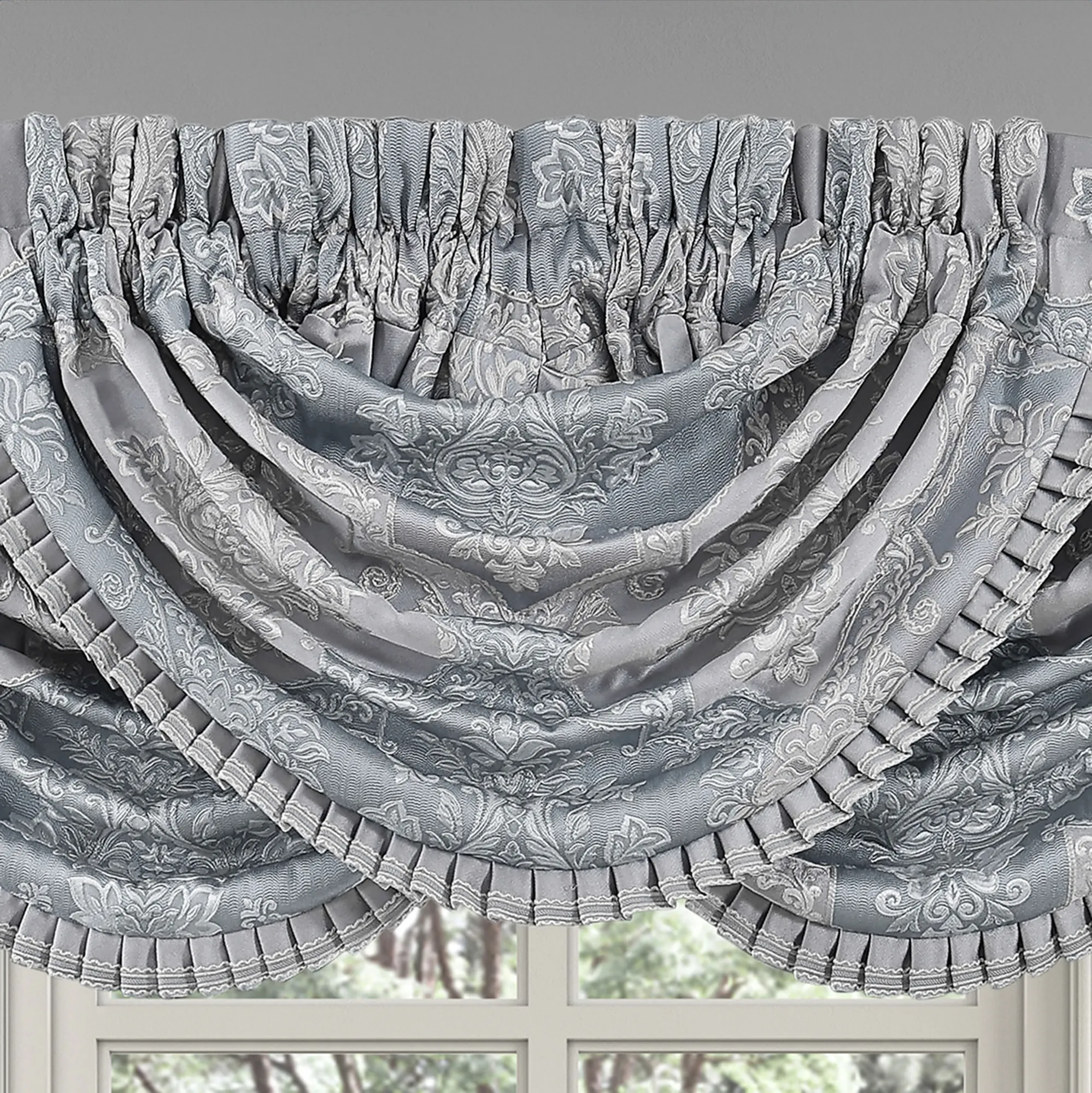 Window Treatment: Wide Curtain Pair has a 3" rod pocket and is 100"W; specify 84"L or 95"L. Each Waterfall Valance has a 3.25" rod pocket and is 49"Wx33"L. We recommend one valance for every 12"-15" of window width.