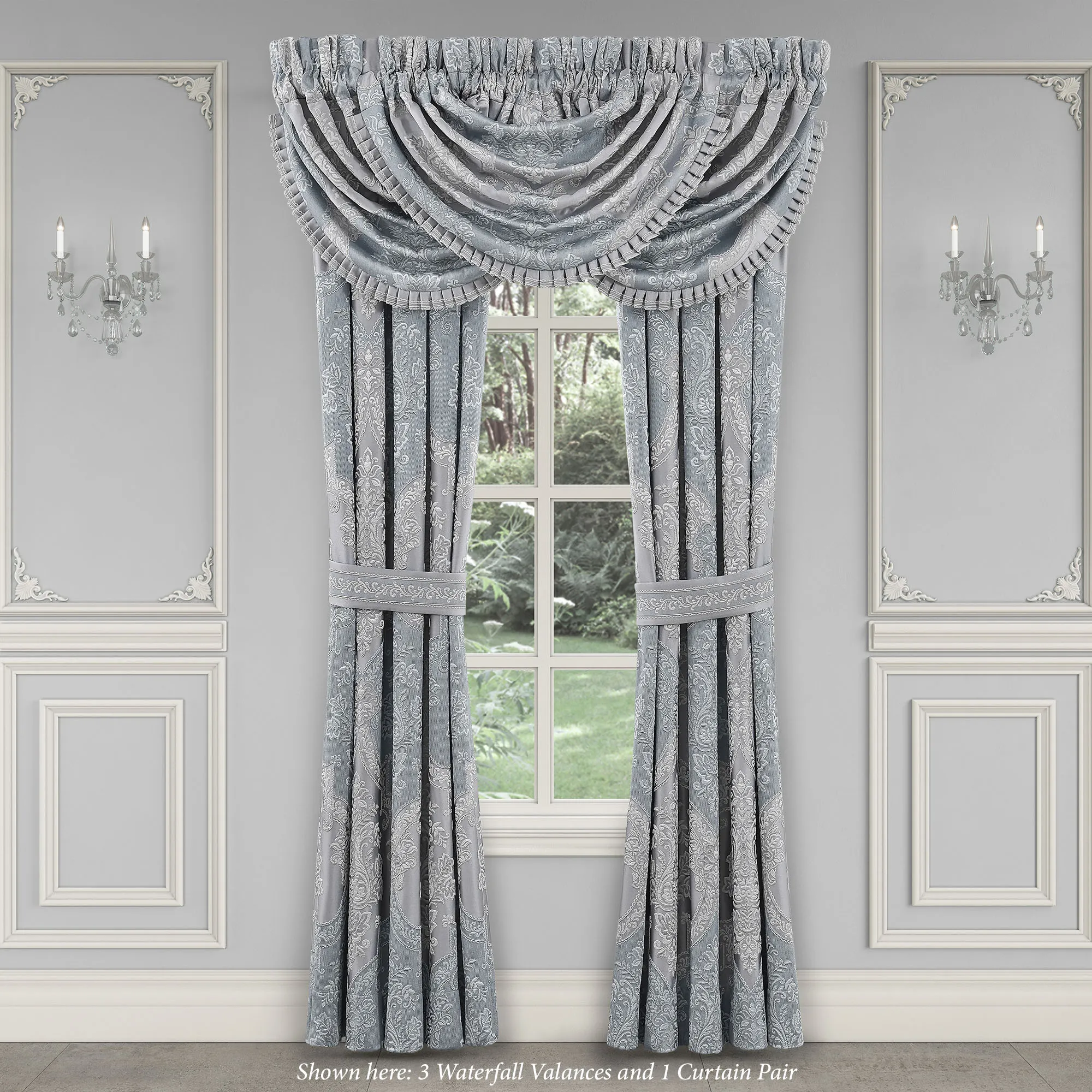 Window Treatment: Wide Curtain Pair has a 3" rod pocket and is 100"W; specify 84"L or 95"L. Each Waterfall Valance has a 3.25" rod pocket and is 49"Wx33"L. We recommend one valance for every 12"-15" of window width.