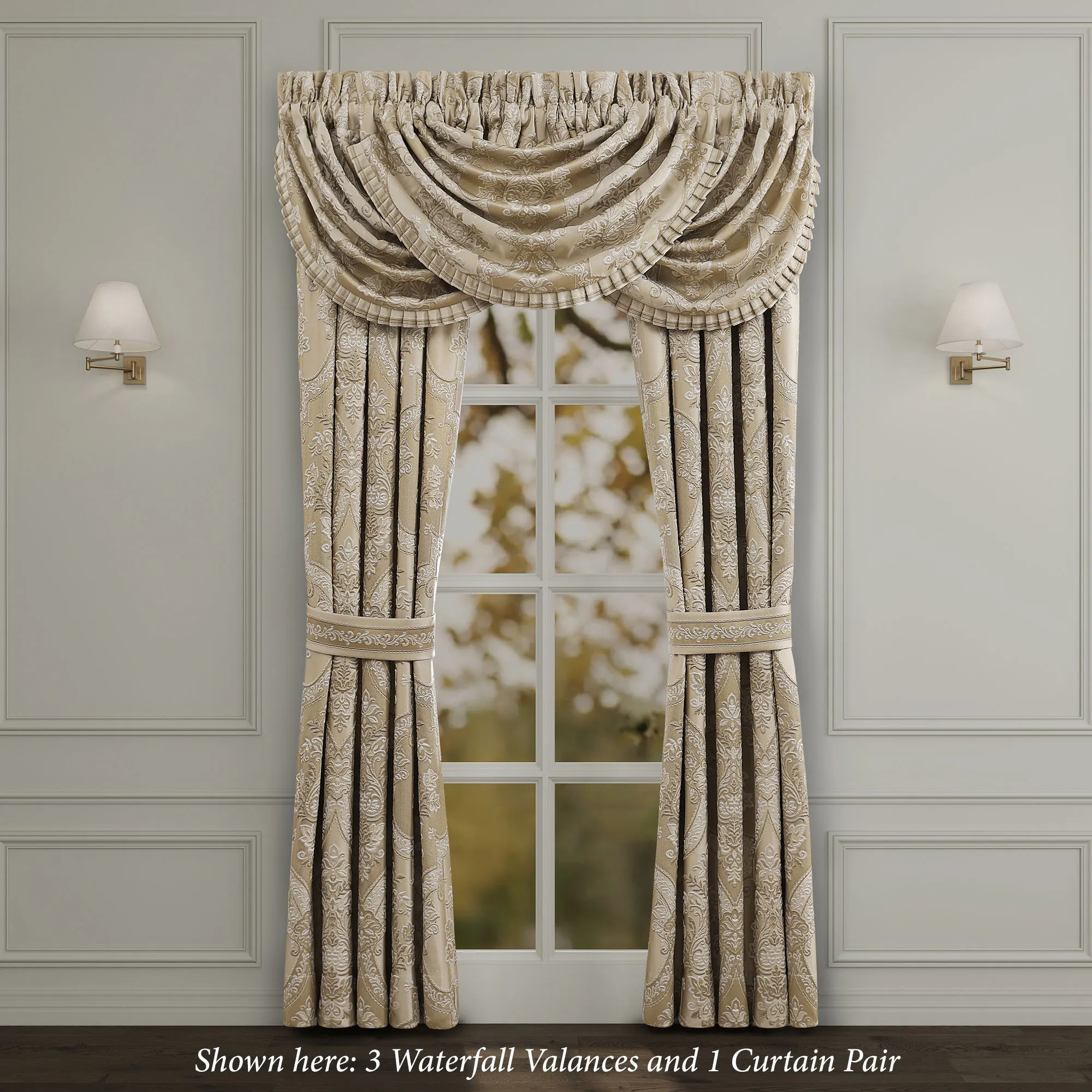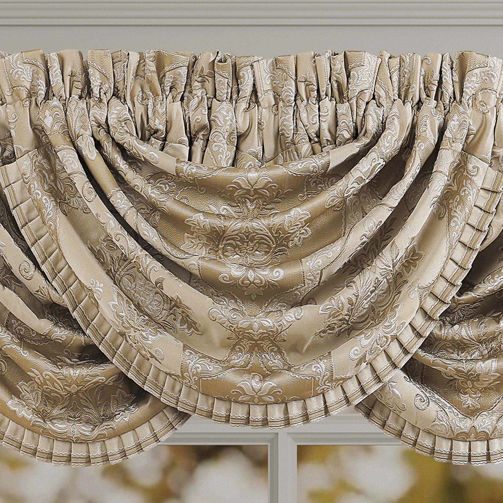 Window Treatment: Wide Curtain Pair has a 3" rod pocket and is 100"W; specify 84"L or 95"L. Each Waterfall Valance has a 3.25" rod pocket and is 49"Wx33"L. We recommend one valance for every 12"-15" of window width.