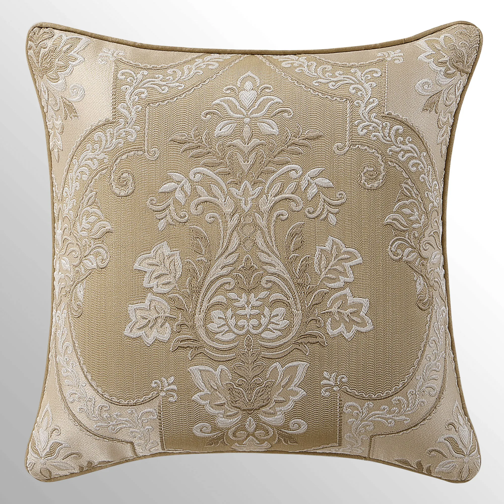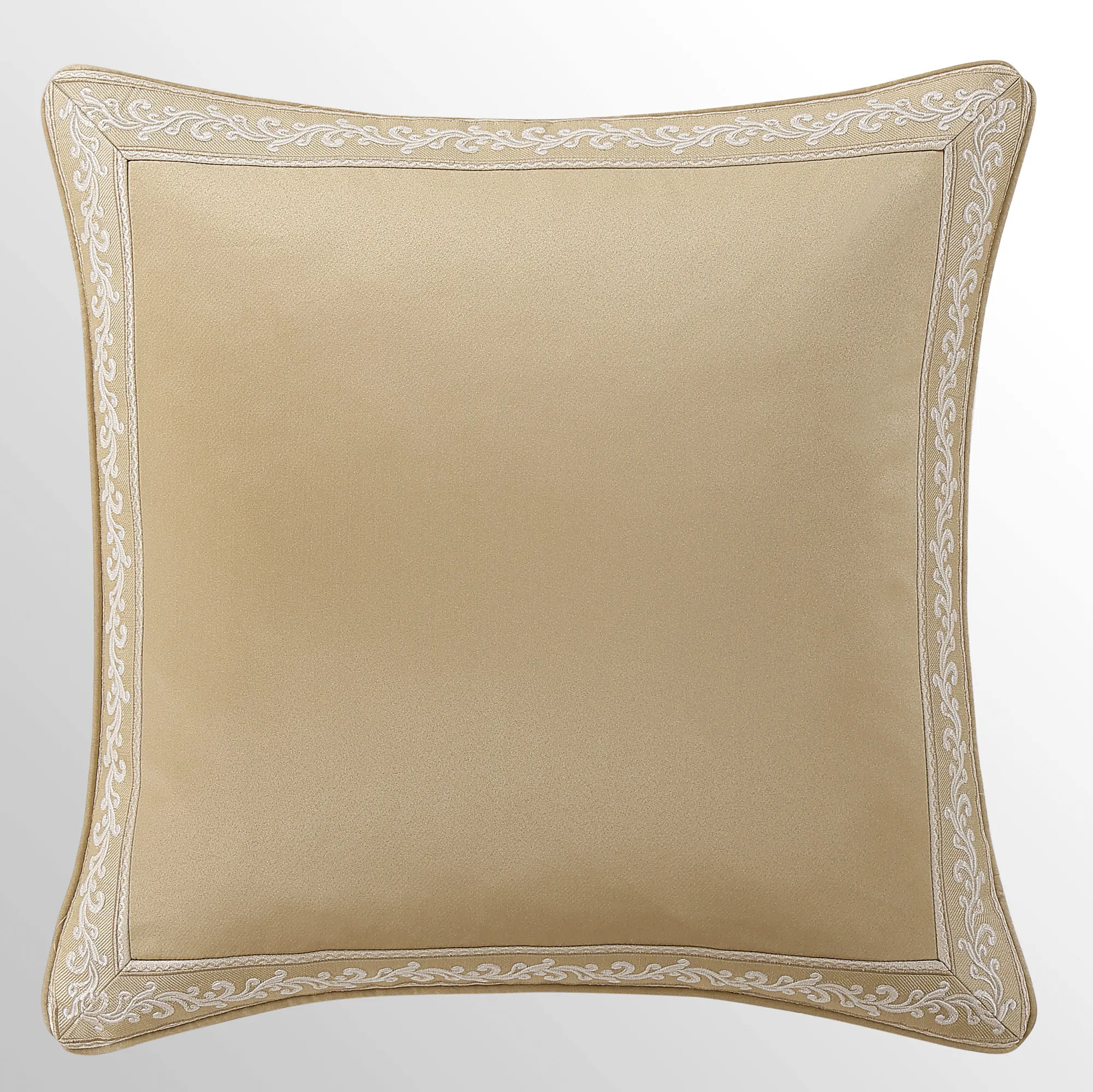 Piped European Sham has a herringbone-textured gold center pieced with a mitred leafy scroll frame; reverses to gold foulards; zipper closure.