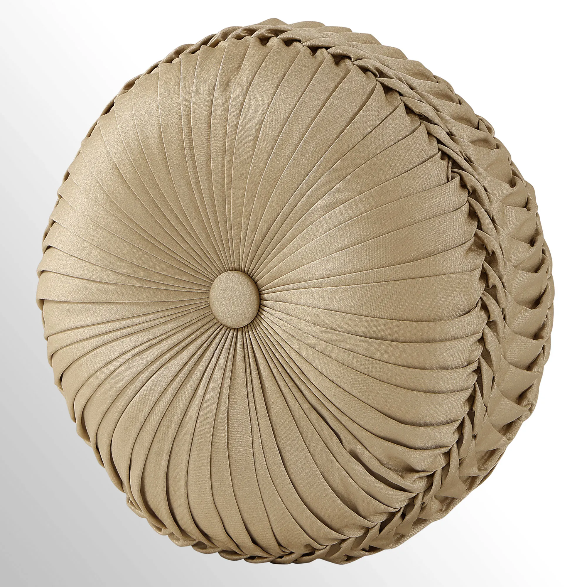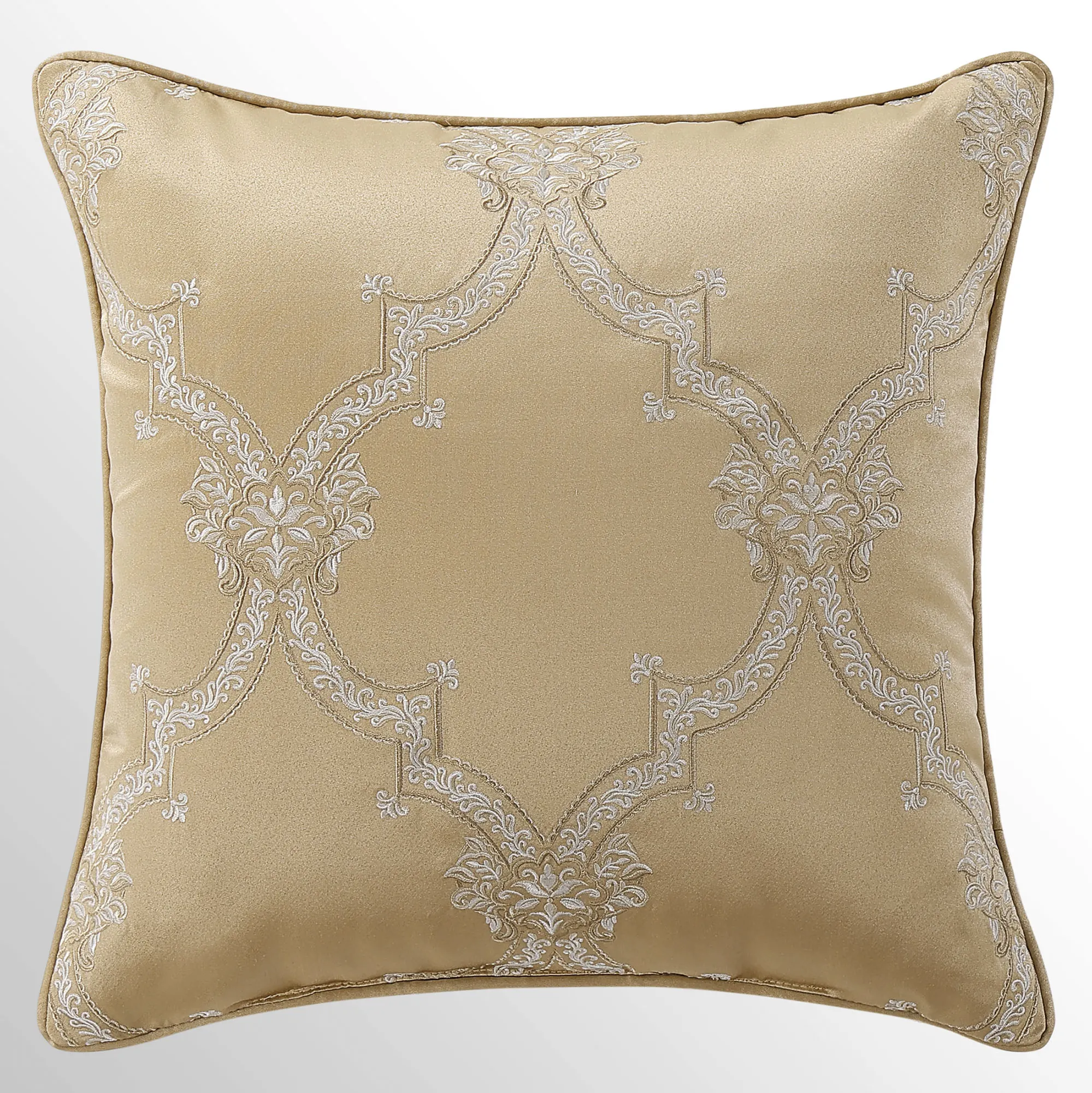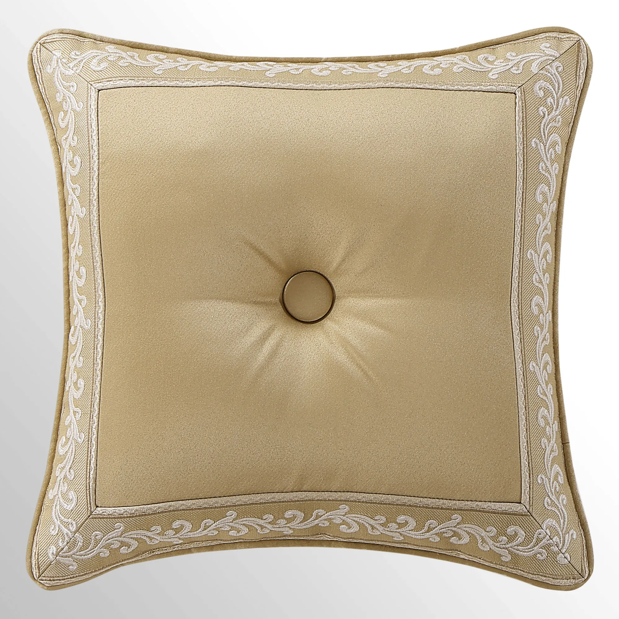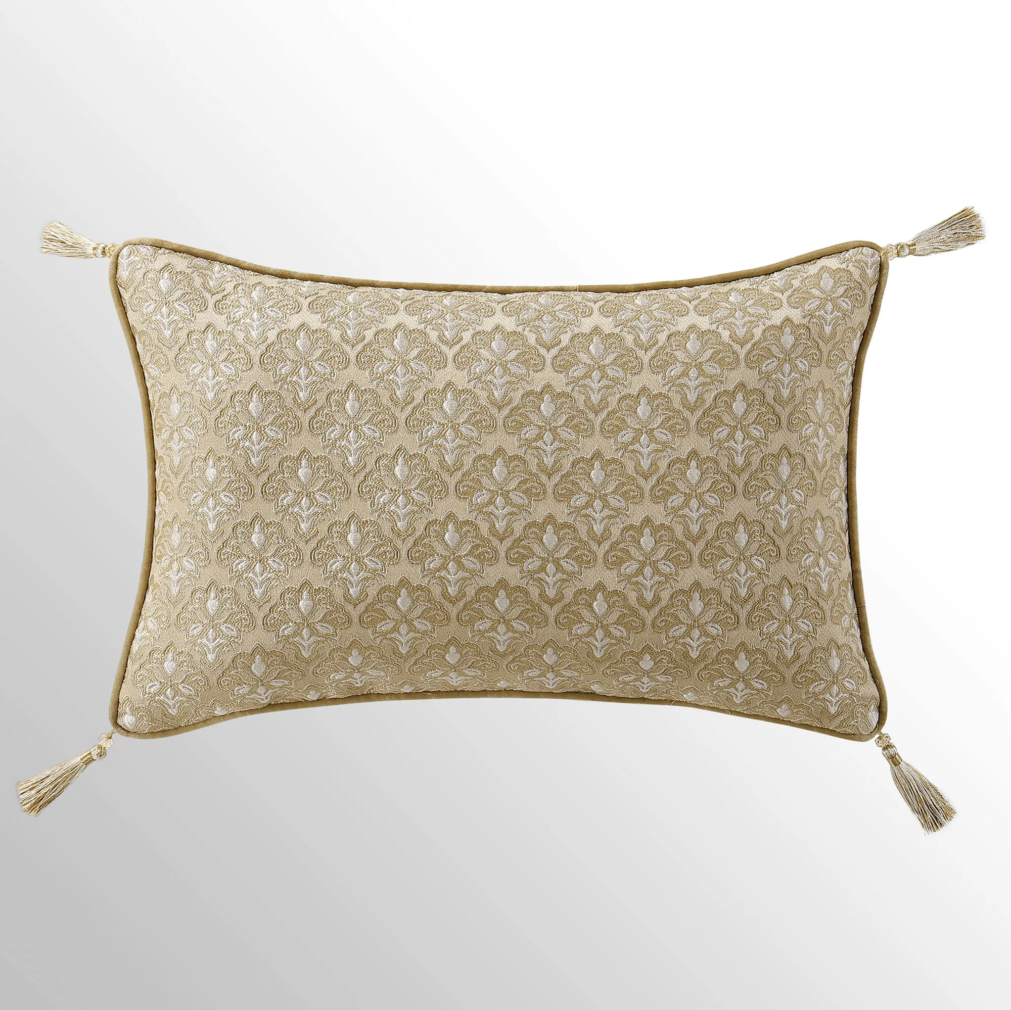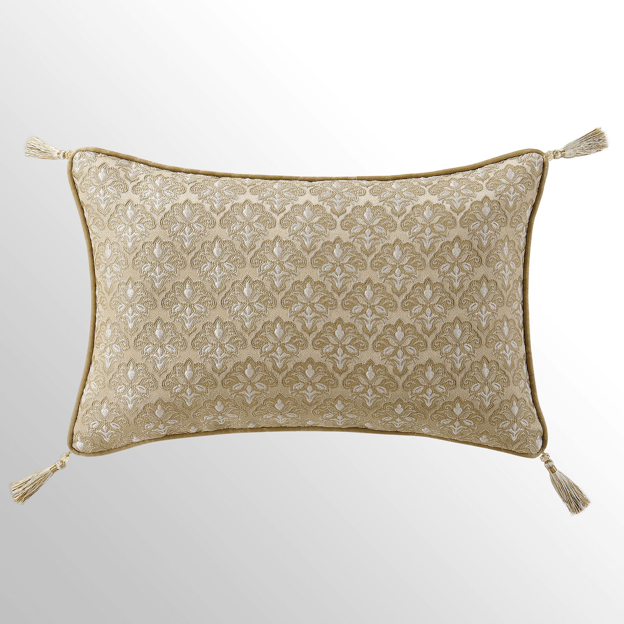 Pillows have piped edges, except the Round. Spot clean. The Tufted Square is gold with a center button tuft and a leaf scroll trim frame. The reversible Piped Square has damask; reverses to alternating leafy scroll trim and solid bands. The Embroidered Square features embroidered quatrefoils with leaf and damask accents. The Tasseled Rectangle has foulards and corner tassels with crystal beads. The Jumbo Rectangle has alternating leafy scroll trim and solid bands, a 2.5" side gusset, and a foulard reverse. The reversible, handmade Round is pleated gold with a button-tuft center and a 3" side gusset.