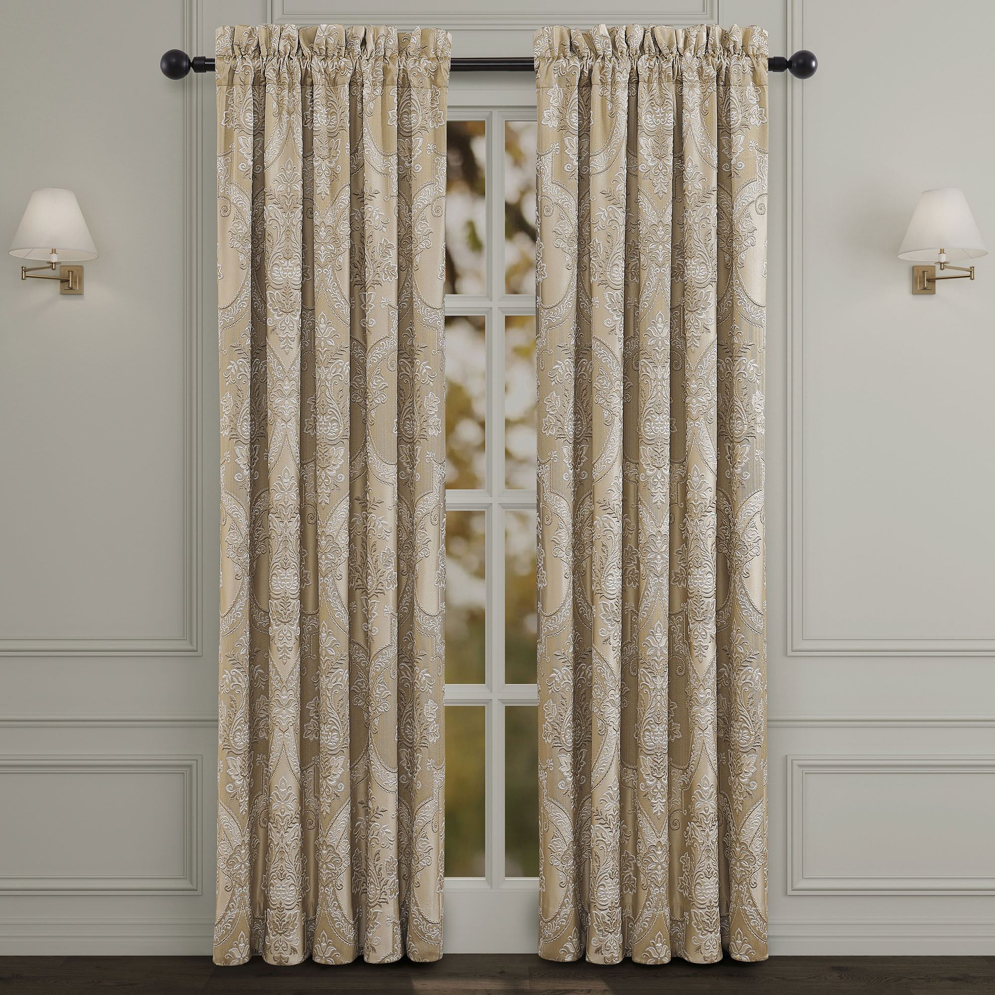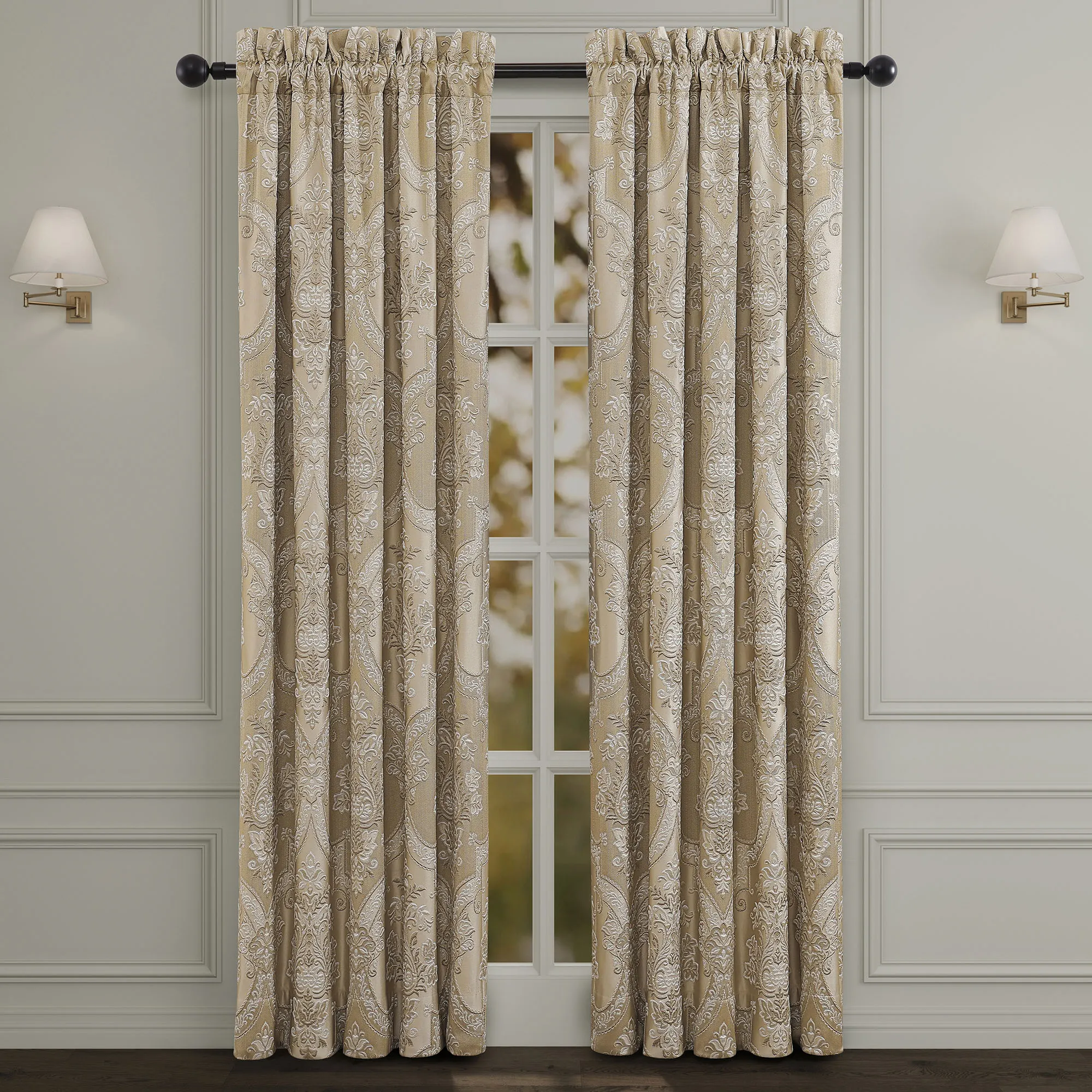 Lined Window Treatments have damask. Wide Curtain Pair has tailored edges, hangs via a 3" rod pocket, and includes tiebacks. Curtains are available in two lengths. Each Waterfall Valance has a pleated bottom edge and a 3.25" rod pocket. We recommend one valance for every 12"-15" of window width.