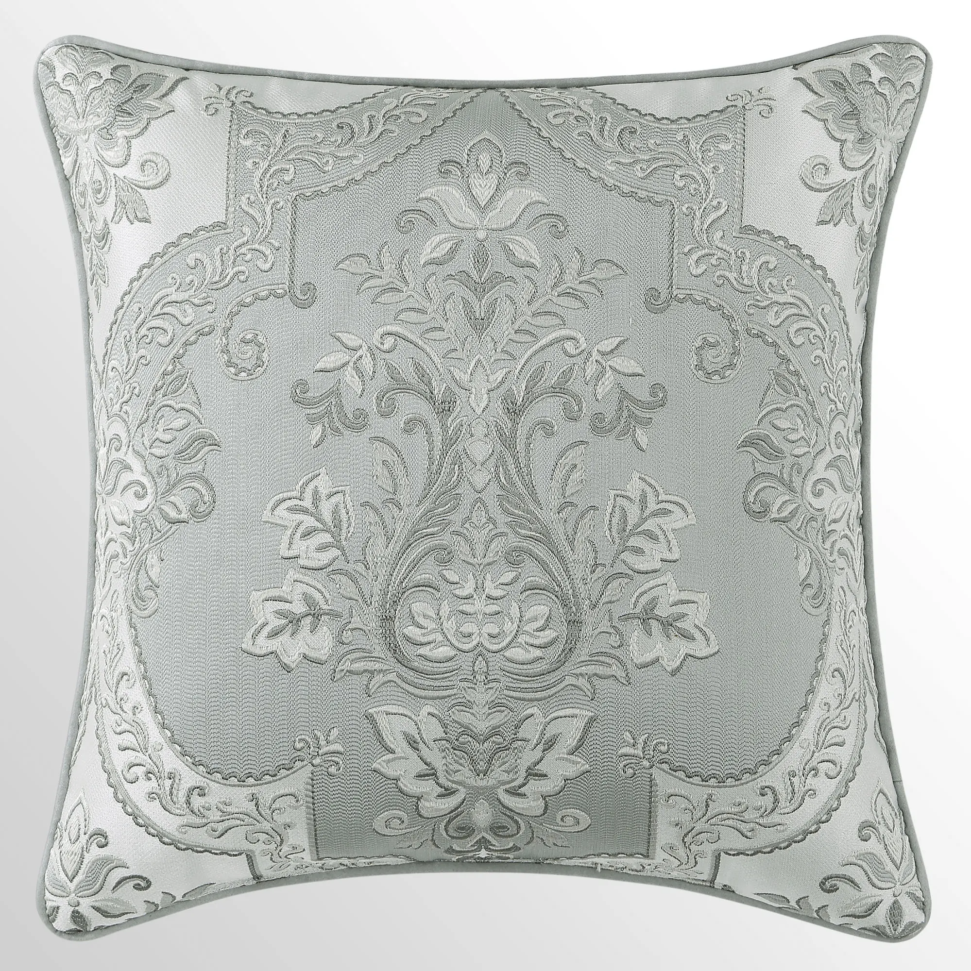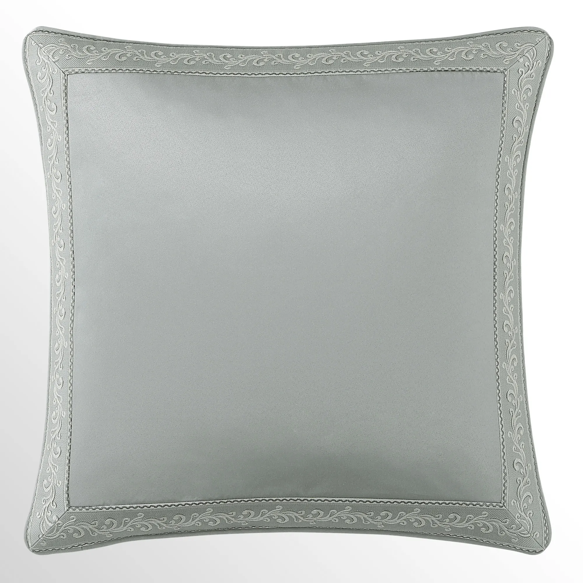 Piped European Sham has a herringbone-textured spa center pieced with a mitred leafy scroll frame; reverses to spa foulards; zipper closure.