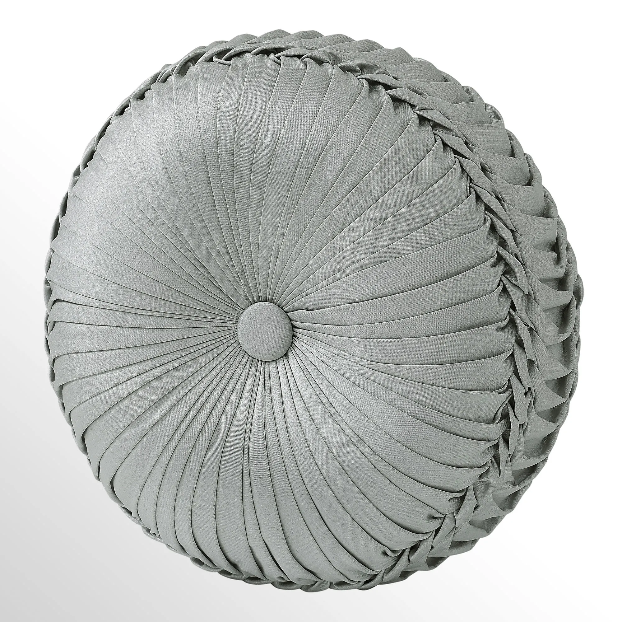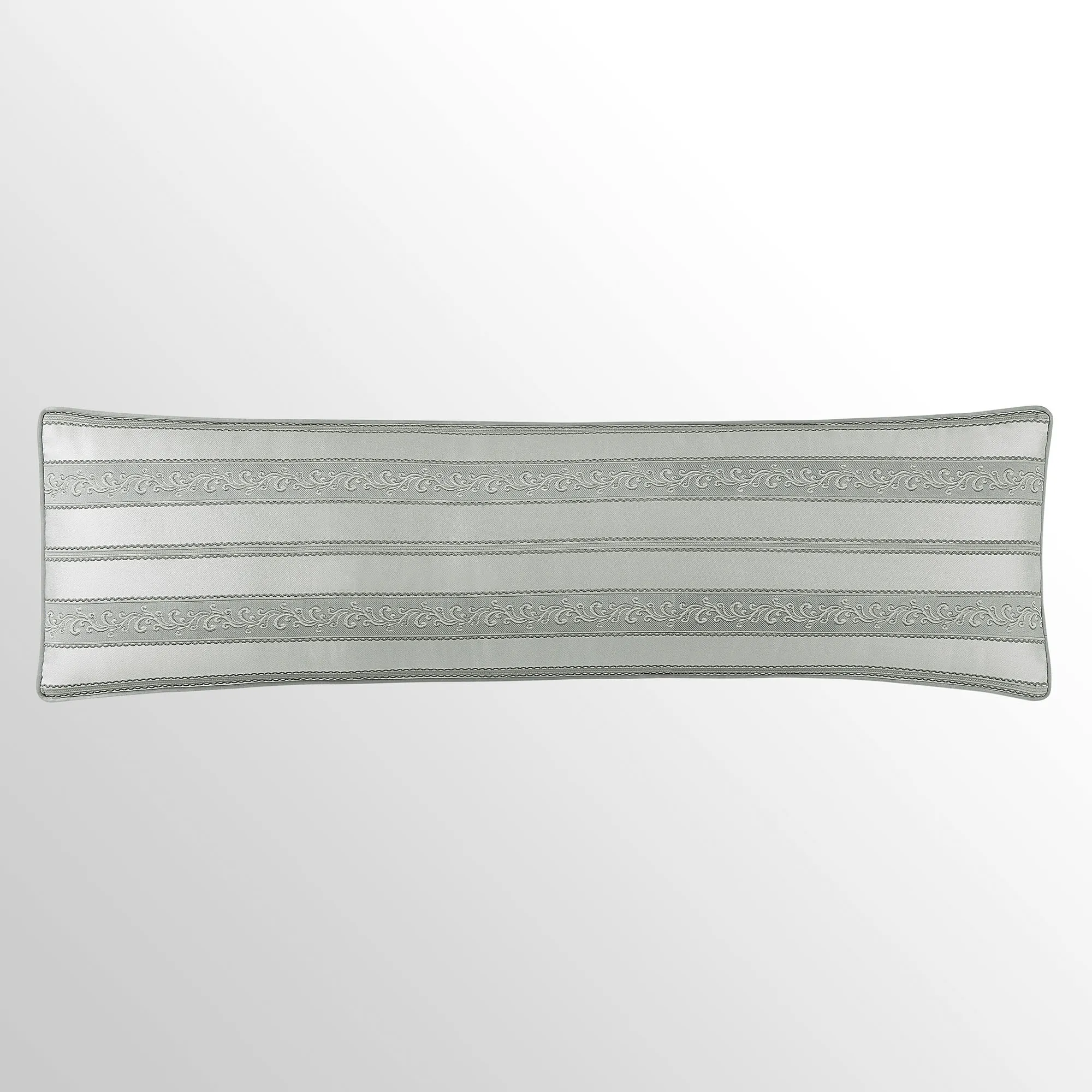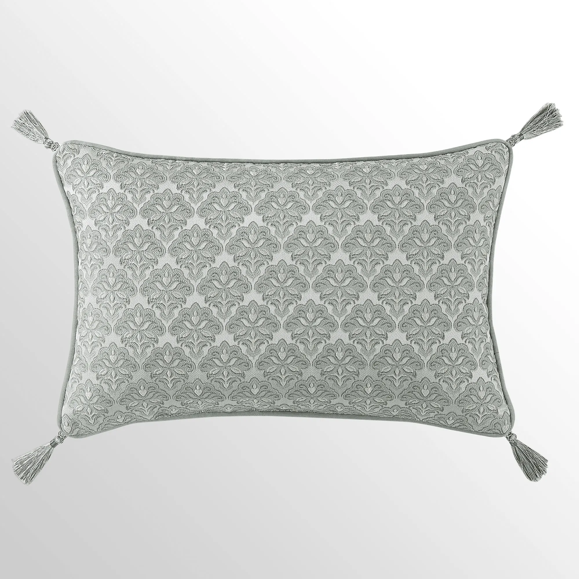 Pillows have piped edges, except the Round. Spot clean. The Tufted Square is spa with a center button tuft and a leaf scroll trim frame. The reversible Piped Square has damask; reverses to alternating leafy scroll trim and solid bands. The Embroidered Square features embroidered quatrefoils with leaf and damask accents. The Tasseled Rectangle has foulards and corner tassels with crystal beads. The Jumbo Rectangle has alternating leafy scroll trim and solid bands, a 2.5" side gusset, and a foulard reverse. The reversible, handmade Round is pleated spa with a button-tuft center and a 3" side gusset.