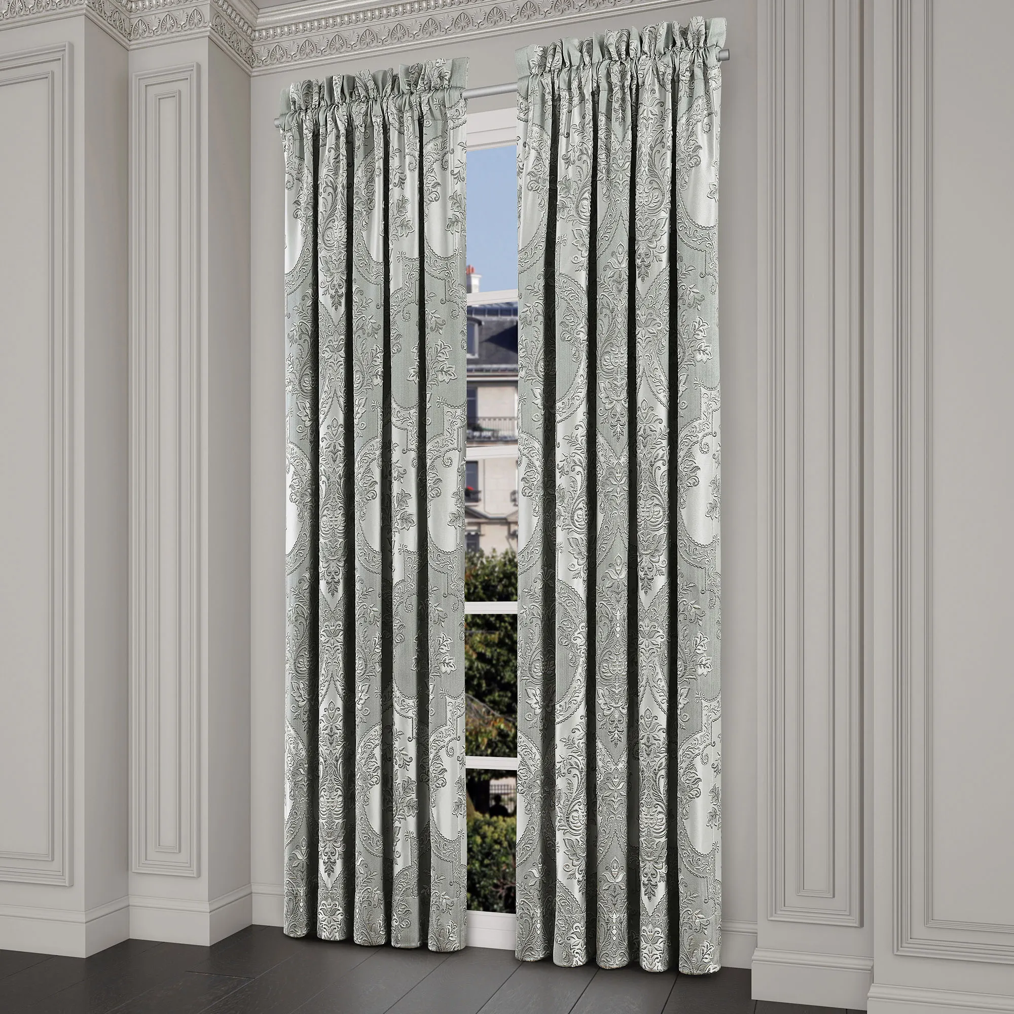 Lined Window Treatments have damask. Wide Curtain Pair has tailored edges, hangs via a 3" rod pocket, and includes tiebacks. Curtains are available in two lengths. Each Waterfall Valance has a pleated bottom edge and a 3.25" rod pocket. We recommend one valance for every 12"-15" of window width.