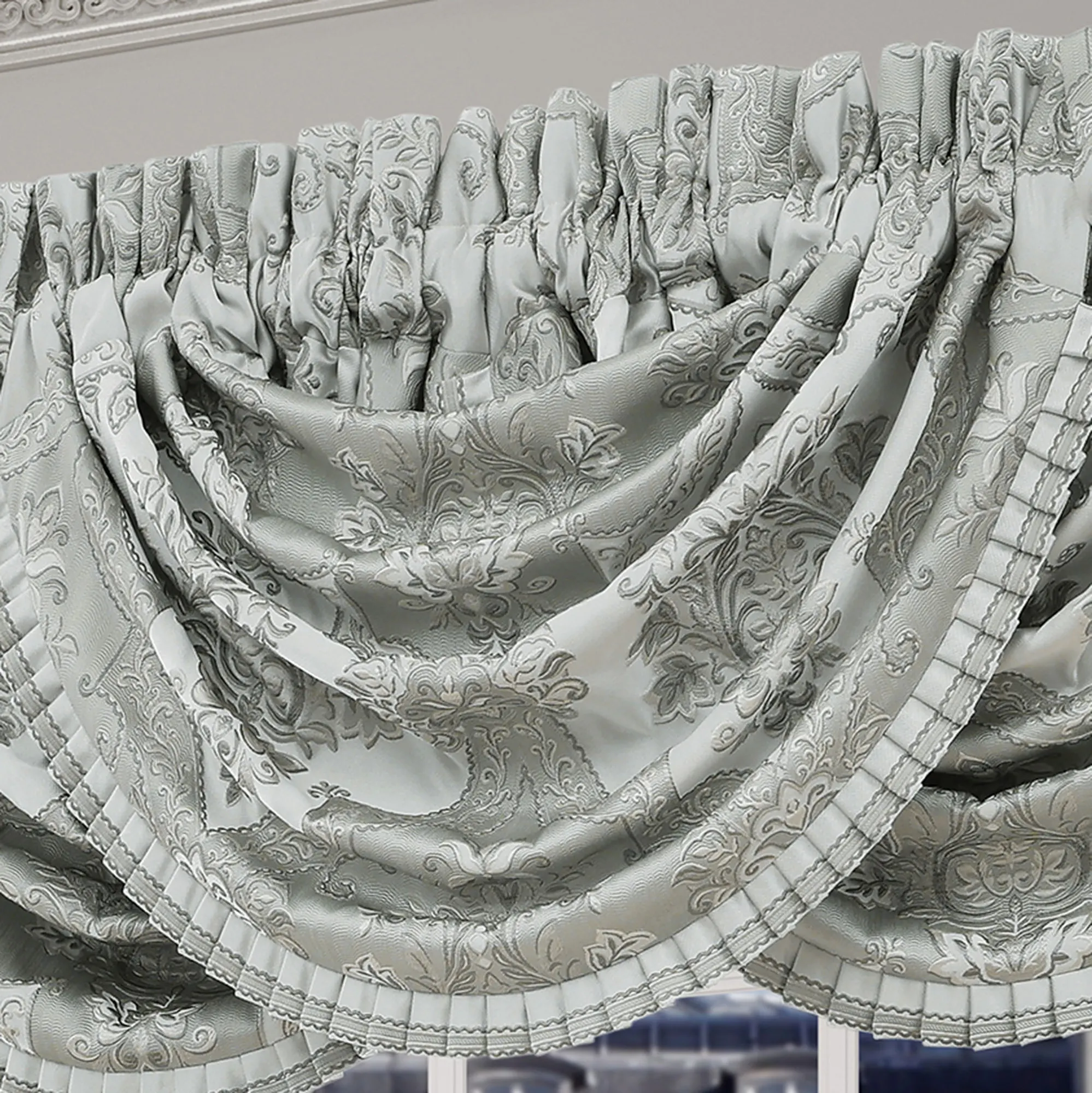 Window Treatment: Wide Curtain Pair has a 3" rod pocket and is 100"W; specify 84"L or 95"L. Each Waterfall Valance has a 3.25" rod pocket and is 49"Wx33"L. We recommend one valance for every 12"-15" of window width.