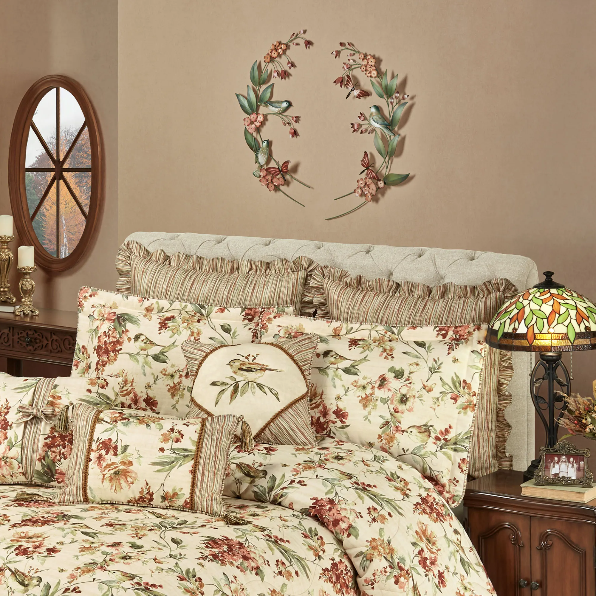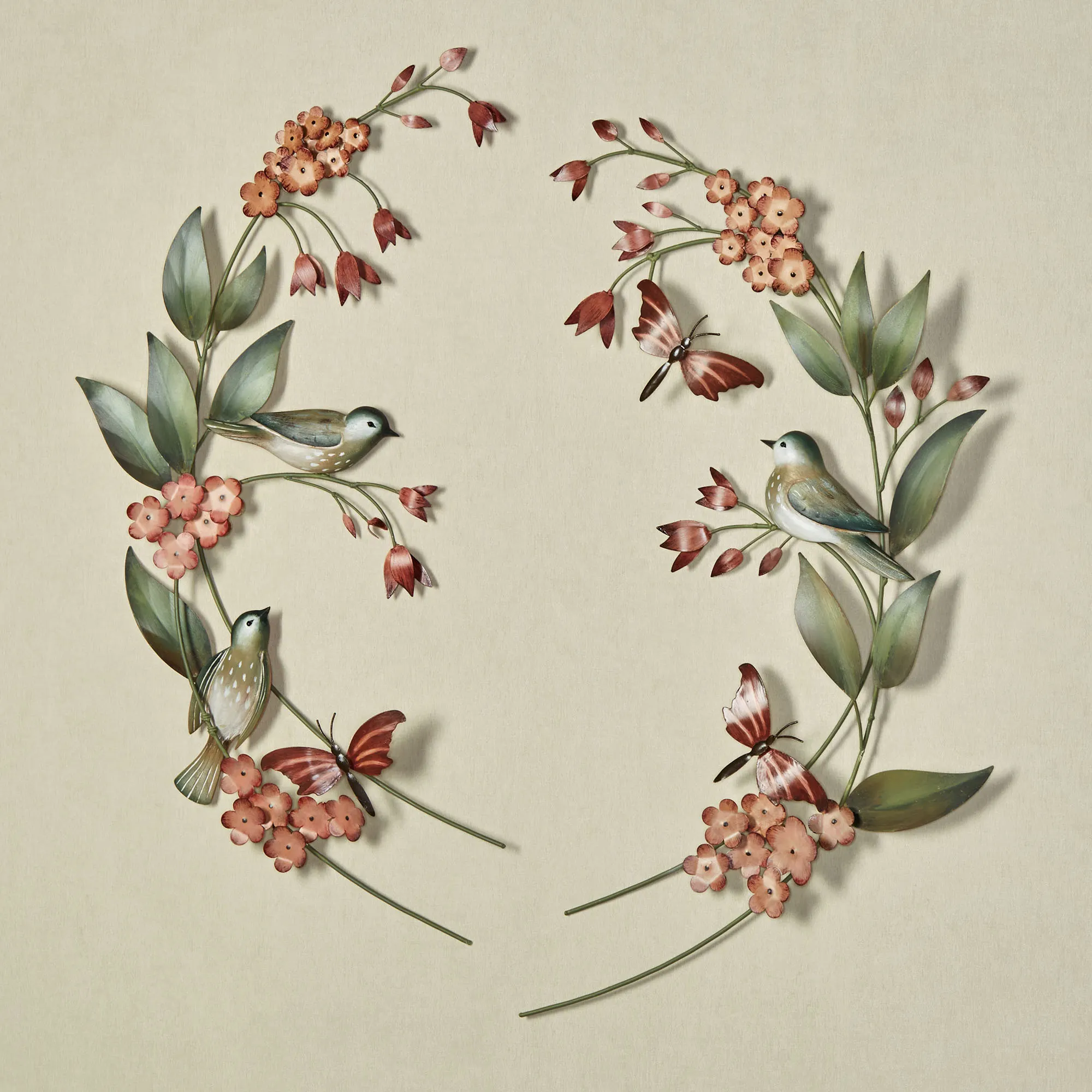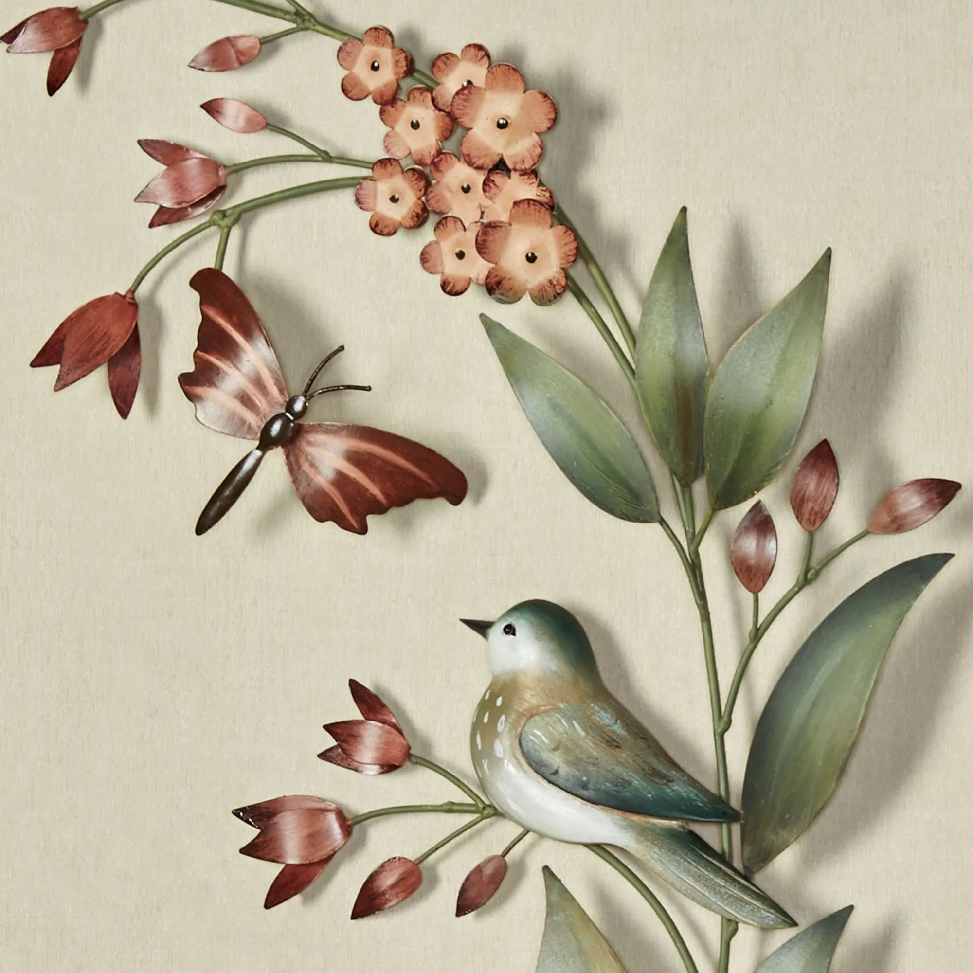 Song Birds charm their surroundings with a sweet melody. Designed by artist Joanne Ferrara, the handpainted and handcrafted metal wall art set features curving branches blossoming with coral and mahogany florals and green leaves. Handcarved wood birds with charming green feathers rest on the stems as butterflies flit about the flowers. Each measures 17"Wx2"Dx32"H.