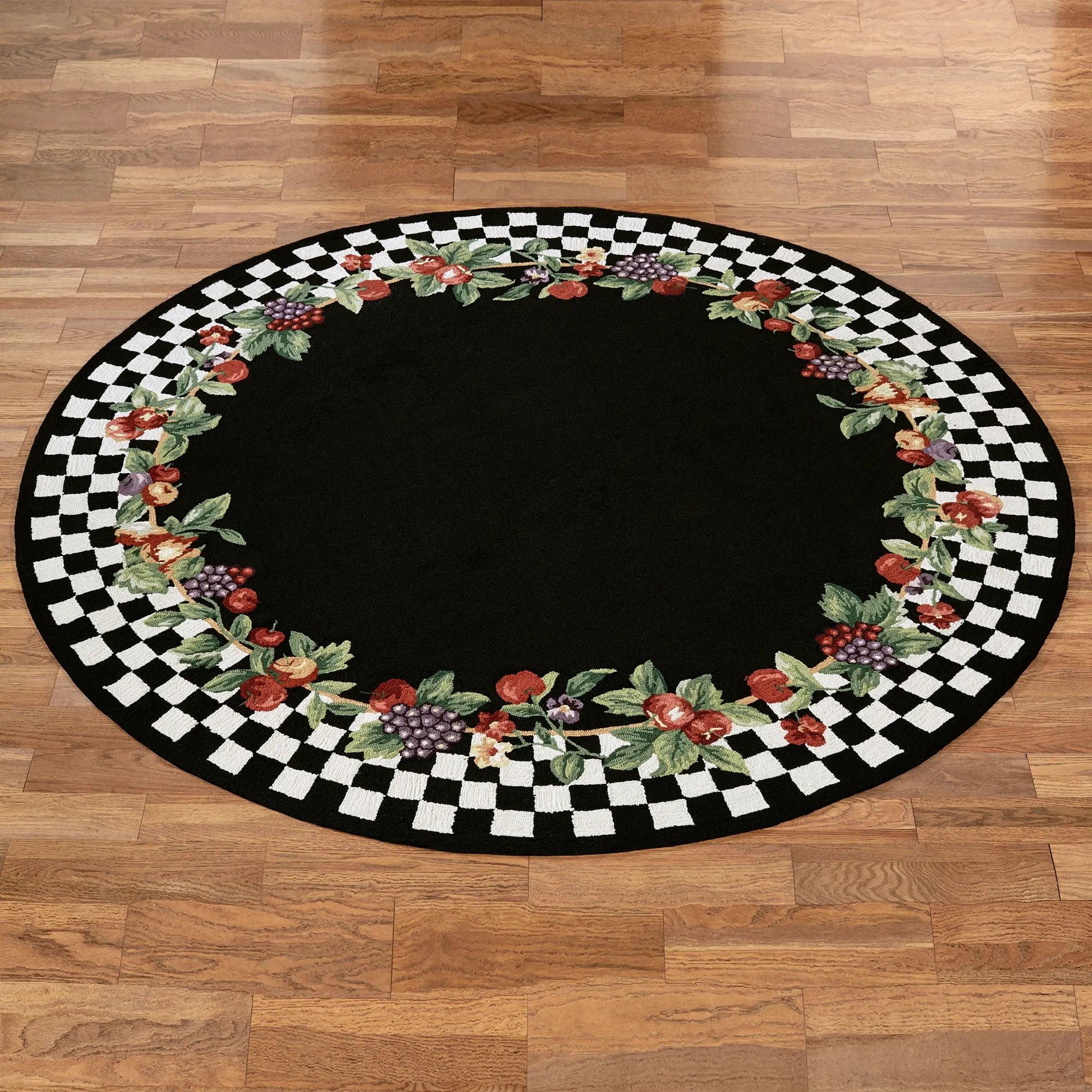 • Hand-hooked rugs feature fruit and a check pattern