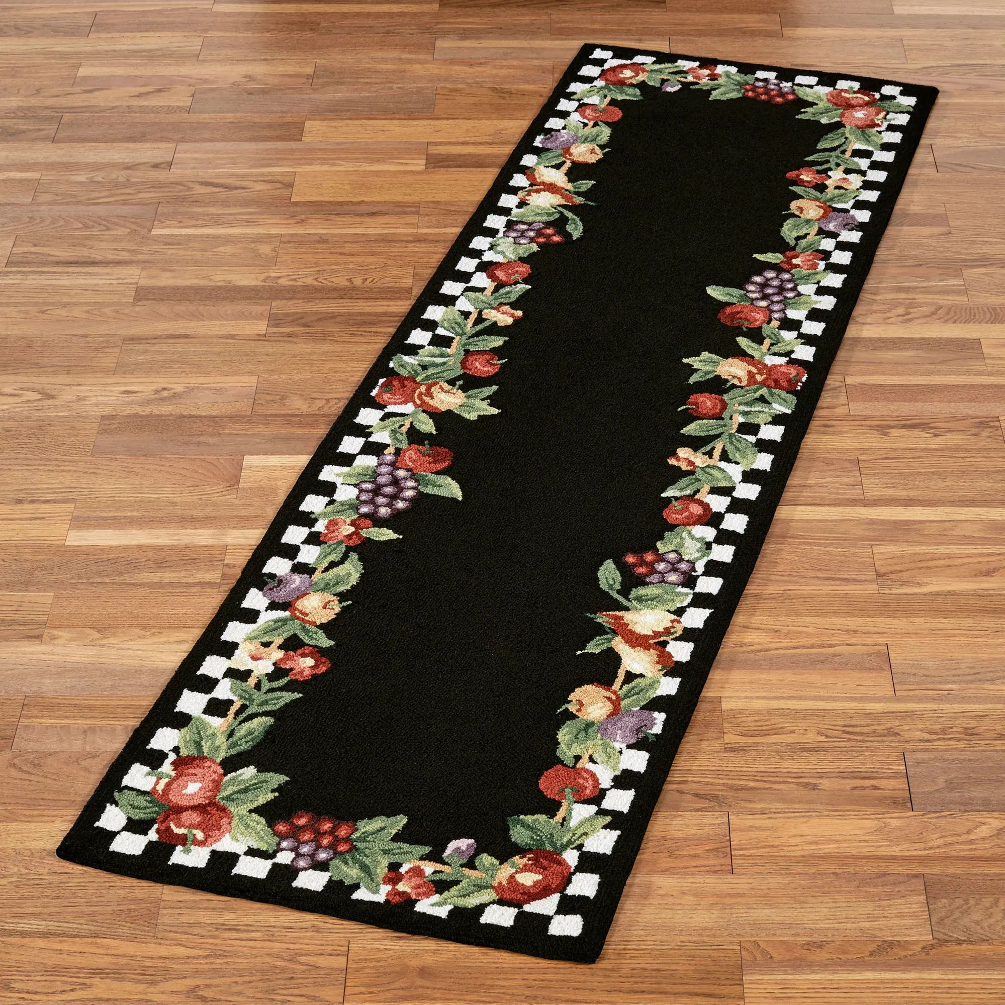 Abundant fruit and a check pattern make the Sonoma Fruit Rug Runners a sweet addition to your home. These hand-hooked polyacrylic rugs, .375" thick, include grapes, apples, pears, and leaves. Colors include eggshell, green, purple, red, yellow, rust, and sienna. Rug runners have cloth-covered latex backs. We recommend professional cleaning by a rug cleaner. Imported.
